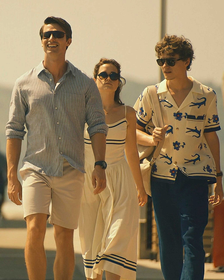 Саксон: полосатая рубашка и шорты. Полоска — это порядок, логика, морская ассоциация, часто отсылка к классическому мужскому стилю. Но в отпускной интерпретации, особенно в сочетании с шортами, она становится «нарядом беглеца» — того, кто сбежал от обязательств, от стресса, от города. Он не позволяет себе полное расхлябанность, но слегка выходит из роли. Саксон — человек, который хочет быть «на паузе», но слишком врос в структуру. Его отпуск — попытка понять, возможно ли быть собой вне роли.