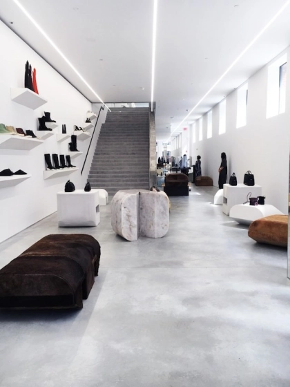 Бутик Rick Owens в Нью-Йорке — это не просто магазин, а архитектурный перформанс. Пространство оформлено в духе брутализма: гладкий бетон, массивные плоскости, скульптуры, напоминающие языческих идолов, и сдержанное освещение. Интерьер говорит тем же языком, что и одежда Owens: мрачно, сексуально, андрогинно, антиутилитарно. Важной частью брендскейпинга у Рика становится авторская мебель, которую он разрабатывает сам. Это не просто предметы интерьера, а элементы художественного манифеста. В бутике можно увидеть, например, знаменитые стулья в виде самого Рика — скульптурные конструкции, напоминающие тотемы, где фигура дизайнера становится буквально частью архитектуры бренда. Мебель выполнена из благородных, почти "варварских" материалов: рога, мрамор, кость, дерево и металл. Таким образом, Rick Owens создаёт не интерьер, а тотальную инсталляцию, где каждая деталь — от одежды до мебели — транслирует его уникальный взгляд на форму, тело и тьму.