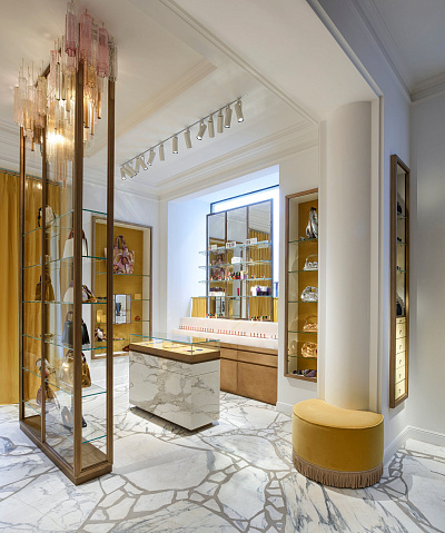 Парижский бутик Dries Van Noten — это противоположность стерильному минимализму. Расположенный в историческом здании на набережной Сены, он сочетает богатство текстур, винтажные объекты, глубокие цвета и культурные коды, свойственные бельгийскому дизайнеру. Здесь брендскейпинг становится слиянием прошлого и настоящего, ремесла и театра. Это не просто «красивый интерьер», это интуитивно богатая, чувственная среда, где каждый элемент — от цветочной композиции до изогнутого дивана — рассказывает об эмоциях, памяти и художественном чутье. Обратите внимание, как много в интерьере и коллекциях бреда шелка, золота, парчи и отсылок к востоку.
