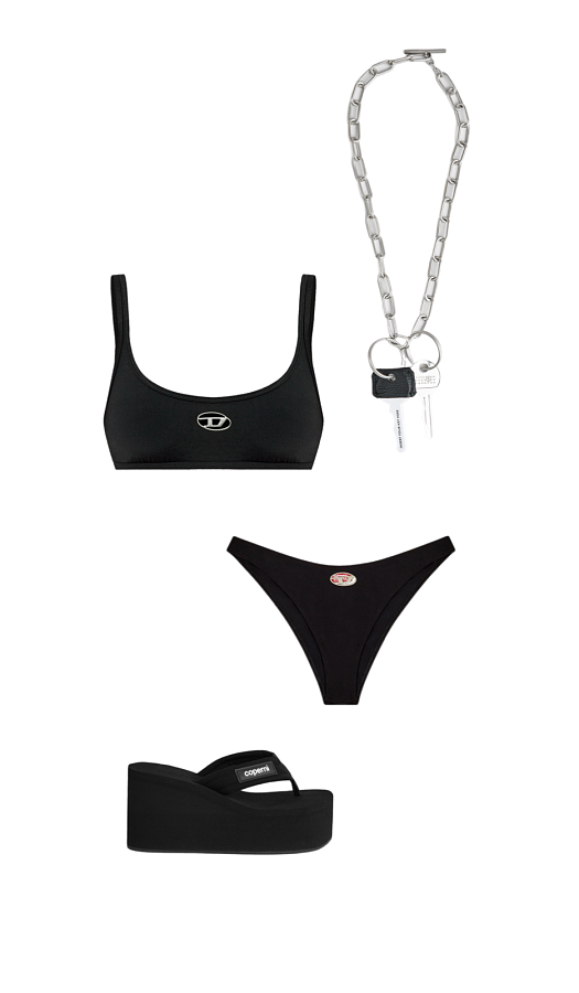Черный минималистичный бикини с логотипом, массивная цепочка с ключами (буквально, ключами от модного будущего), на которую можно свесить все свои украшения, и вьетнамки Coperni. Индастриал-секси вайб, будто Cyberpunk вышел на пляж.