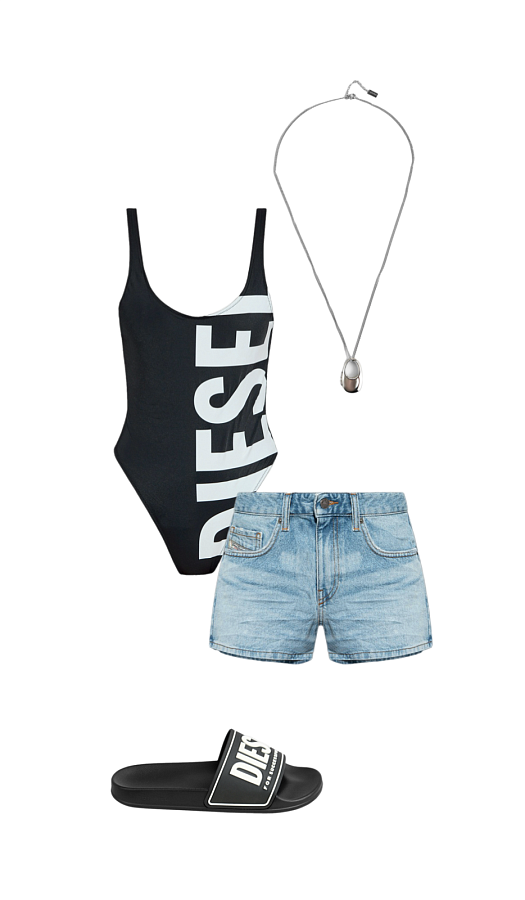 Цельный купальник с крупным вертикальным логотипом Diesel работает как fashion-плакат. Поверх — классические светло-голубые джинсовые шорты, будто вы случайно решили выйти из воды прямо на террасу кафе у берега, а после - в клуб. Логомания продолжается на слайдерах, а длинная подвеска - подвеска с секретом. Она раскрывается, как маленькая шкатулка, в которую можно спрятать свои украшения.