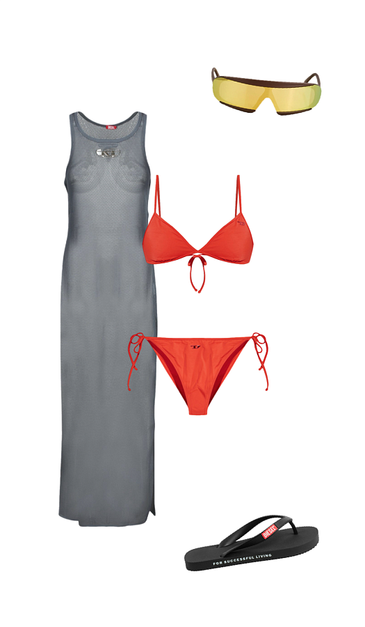Красное триангл-бикини с завязками — уже само по себе достаточно, чтобы сделать эффектный вход. Но Diesel не останавливается на базовом: серое полупрозрачное платье-сетка сверху создаёт layering с настроением нулевых, а спортивные очки с жёлтыми линзами завершают образ в духе спортивного sci-fi. На ногах — фирменные сланцы с манифестом For Successful Living. Этот лук — как огонь на бензине: вы не просто в центре внимания, вы — его источник.