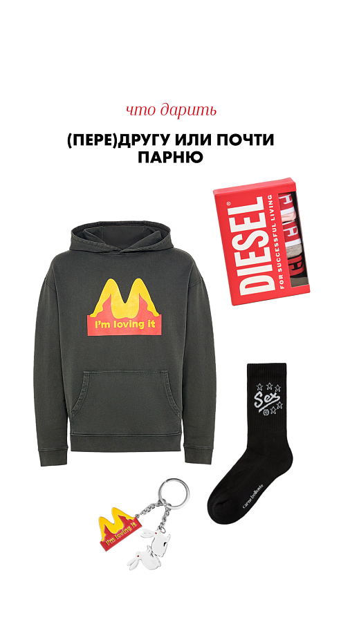 Идеально для бойфренда в начале романа, где каждый жест — намёк, а каждый подарок — сообщение. Это мастер-класс по интеллектуальной провокации. Узнаваемые золотые арки и слоган McDonald’s здесь виртуозно переосмыслены в откровенную графическую метафору. Carne Bollente заменяет объект потребления (еду) на объект желания, превращая массовый символ в личный и дерзкий манёвр. Ну а носки с надписью SEX.. Вы сами понимаете ;)