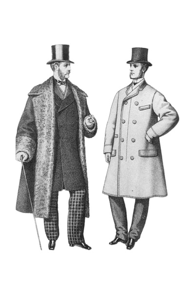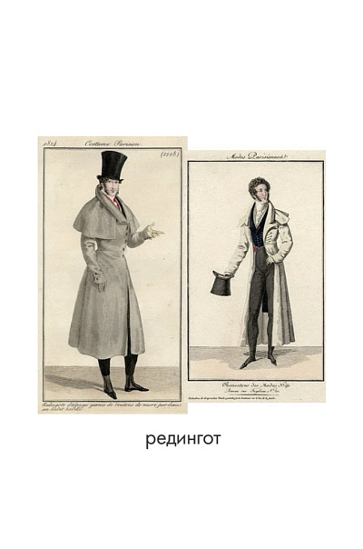 В это же время мужские фасоны метались от строгости к пышности, становясь то длиннее, то короче. В этот период появился знаменитый честерфилд – элегантное однобортное пальто с потайной застежкой, которое больше напоминало пиджак. Чуть позже его дополнили бархатным воротником – символом солидарности с французскими революционерами. Тогда же вошли в моду пальто с рукавами реглан, напоминавшие женские накидки, и двубортный каррик с несколькими воротниками, названный в честь актера, популяризировавшего этот стиль.
