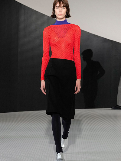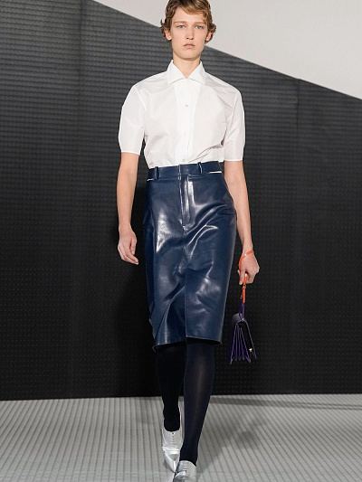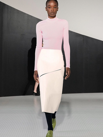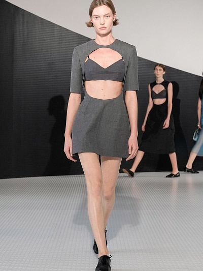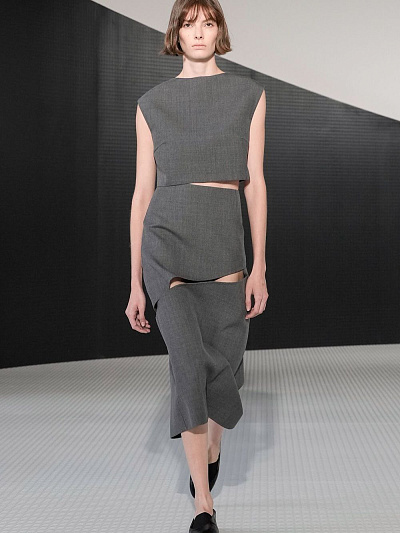 Коллекция SS26 сразу дала понять: Беллотти не собирается быть «тихим хранителем» архива. Широкие пальто и свободные рубашки напомнили о лучших годах марки — девяностые, когда Jil Sander стала символом чистоты линии. Кроп-топы и юбки-карандаш — кивок в сторону нулевых, когда минимализм становился смелее и острее. Но кульминацией стали плащи с драпировкой на груди, юбки с горизонтальными прорезями и полупрозрачные плёнчатые платья. В них чувствуется энергия настоящего времени: будущее, которое ещё ищет свою форму.