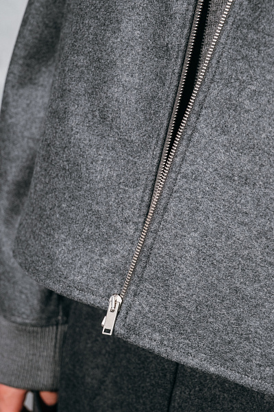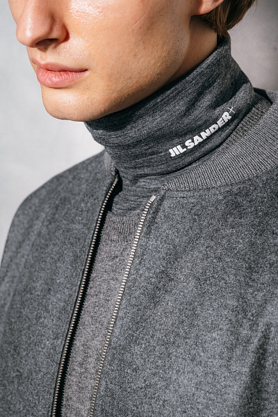 Серый бомбер из шерсти— образец интеллектуальной неформальности. Он сочетает непринужденность кроя и благородство материала. Под него — гольф линии Jil Sander + с лаконичным лого на вороте. Эта пара — квинтэссенция тихой роскоши в повседневности. Комфорт, не идущий на сделку с эстетикой.