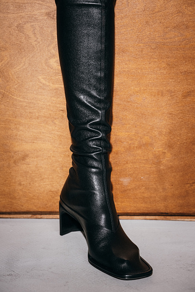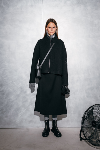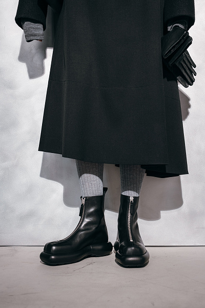 В центре внимания - юбка с ассиметричным подолом. Ее скромная длина и чистый силуэт — наша главная ставка. В пару к ней — ботинки на массивной молнии. Индустриальная нотка, приземляющая образ и добавляющая ту самую столь ценимую Домом утилитарность.