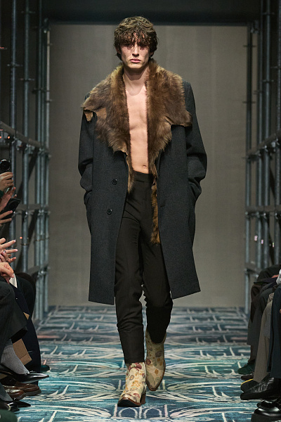 Миучча Прада и Раф Симонс вновь удивили публику, представив коллекцию, лишенную единой темы, но насыщенную разнообразием стилей. От ярких ковбойских сапог до меховых пальто и облегающих брюк — каждый образ был неожиданным и провокационным. Показ проходил в сложной конструкции из строительных лесов, созданной Ремом Колхасом, что добавило индустриальной атмосферы и подчеркнуло хаотичную природу коллекции.