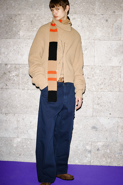 В мире мужской моды, где преобладают резкость линий и сдержанность, коллекция Алессандро Дель’Аква стала глотком свежего воздуха. Дизайнер избегает излишней экстравагантности, предпочитая минимализм, который раскрывает уязвимую сторону мужественности, часто скрытую за маской уверенности. Его подход — это гармония между классикой и неожиданными деталями, где сдержанность переплетается с легкой эксцентричностью. Для осени Дель’Аква подарил своей коллекции деревенский дух с нотками расслабленного шика. Объемное даффл-пальто из яркого тартана с овчинной подкладкой, свободные вельветовые брюки и клетчатые панковские рубашки напомнили о беззаботности стиля, который стал его визитной карточкой. “Красота личного стиля кроется в его несовершенствах,” — отметил дизайнер, представив кардиган в стиле аргайл, сочетающийся с рубашкой с бантом, и объемное искусственное меховое пальто с накидкой-шарфом, которые одновременно притягивали взгляды и удивляли своей смелостью. Эта коллекция стала манифестом свободы самовыражения, где противоположности превращаются в идеальную гармонию.