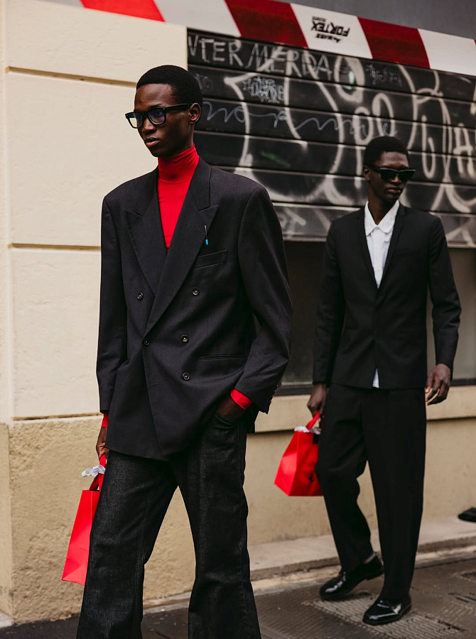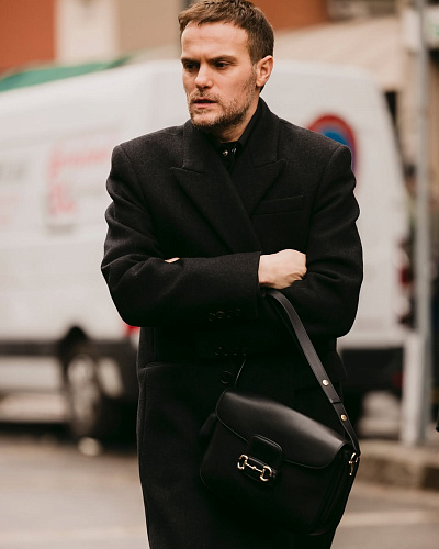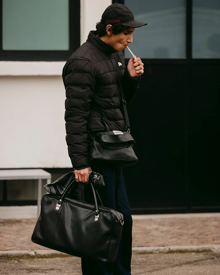 Показы — одно, а улицы Парижа — другое. И здесь у мужских сумок Margiela абсолютная гегемония. Модель 5AC с ее угловатым силуэтом и съемным плечевым ремнем идеально дополняет как строгий топ-код, так и расслабленный стритстайл-лук. А культовая Snatch (или «кружка»), которую носят и в руке, и на поясе, стала настоящим арт-объектом, демонстрирующим безупречный вкус владельца. Это не просто аксессуар для переноски вещей, а ключевой элемент образа, говорящий о понимании моды.