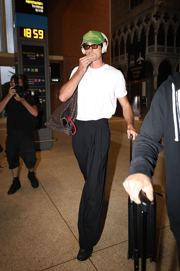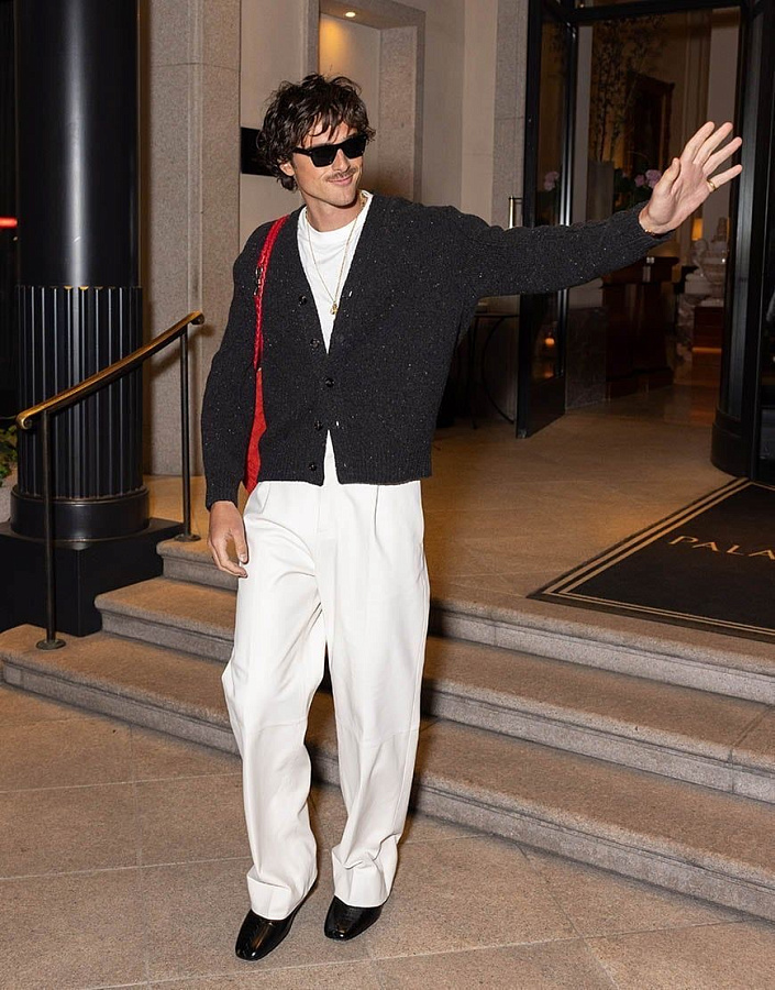 Помните те фотографии Джейкоба на прогулке с собакой? Светлые джинсы, белая футболка, льняная рубашка сверху (расстегнутая, естественно), и — вишенка на торте — кеды в тон поводку питомца. Это не случайность. Это продуманная небрежность, высший пилотаж повседневного стиля. Образ считывается как "я не старался", но каждая деталь выверена. Рубашка добавляет структуру и возможность играть с пропорциями (завязать на талии, накинуть на плечи). Кеды — неожиданный выбор, который ломает потенциальную предсказуемость.