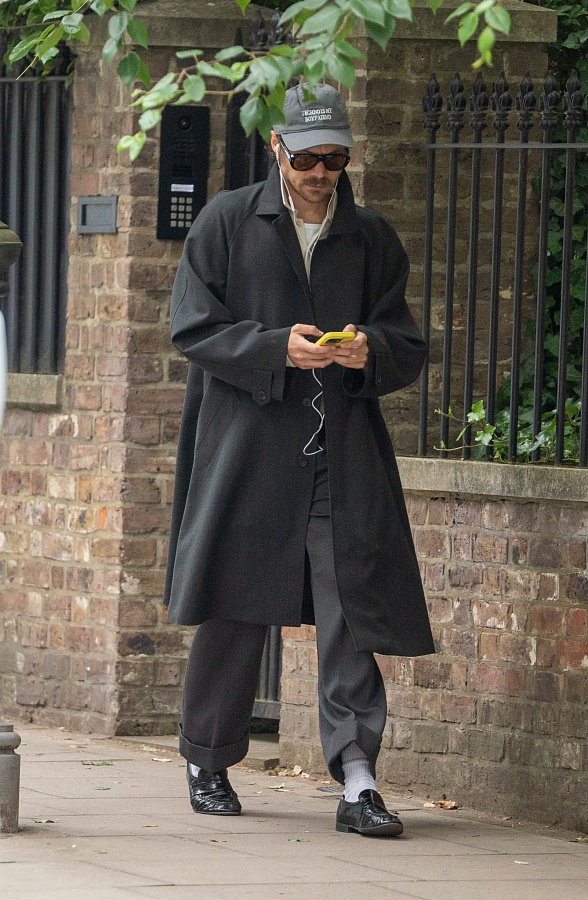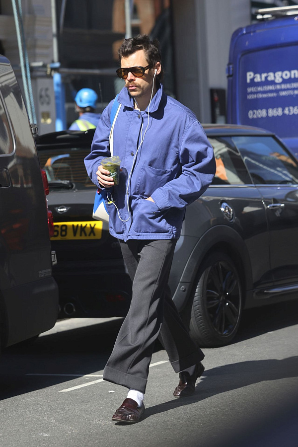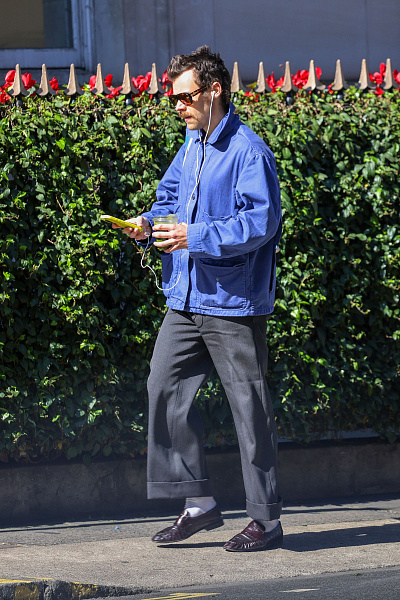 Гарри не боится смешивать, казалось бы, несовместимые вещи. Например, массивные куртки в стиле workwear — прочные, простые, даже грубоватые — он носит с изящными лоферами. Такое сочетание создает интересный контраст: грубость и простота верхней одежды гармонируют с элегантной обувью, добавляя образу глубину и индивидуальность.