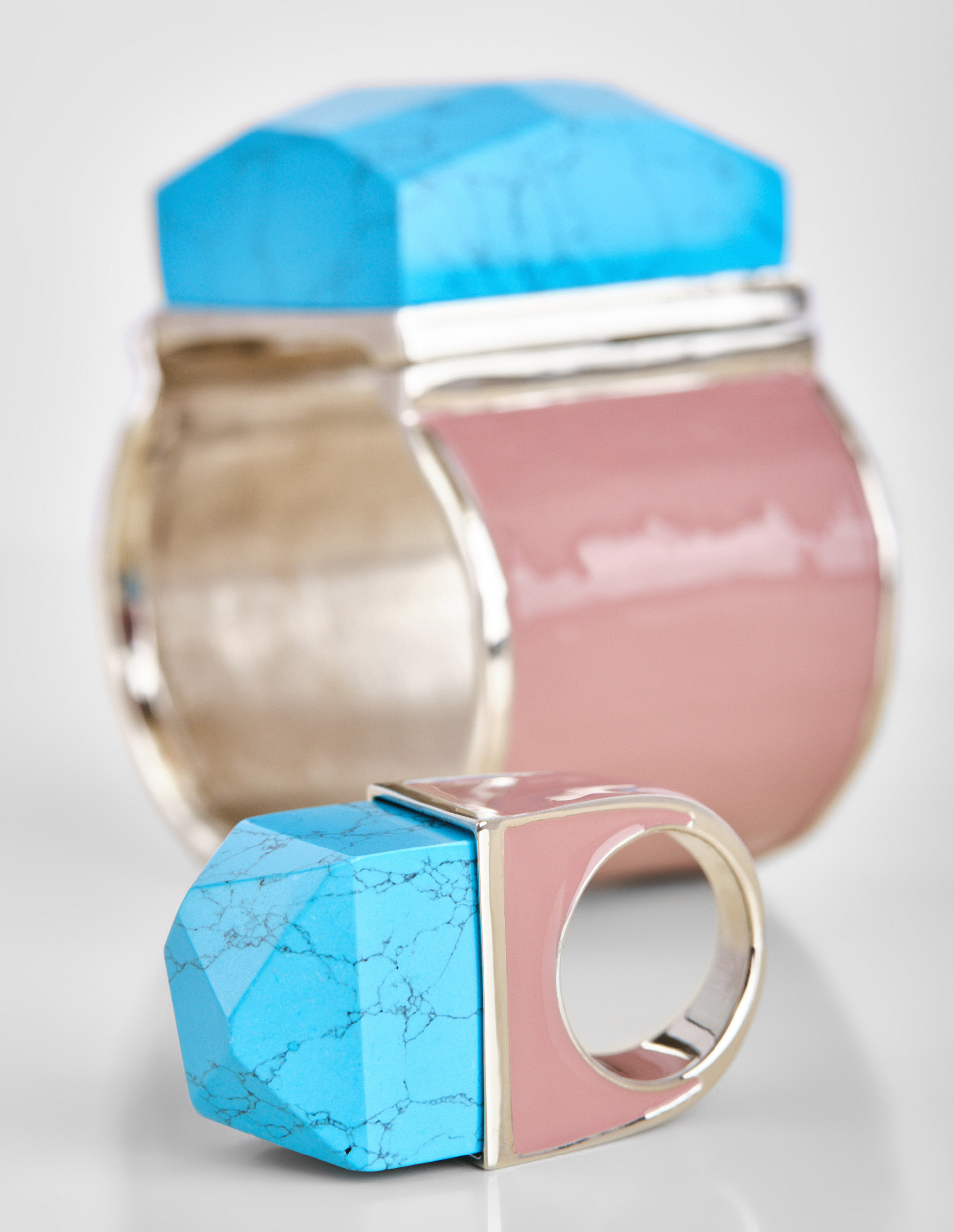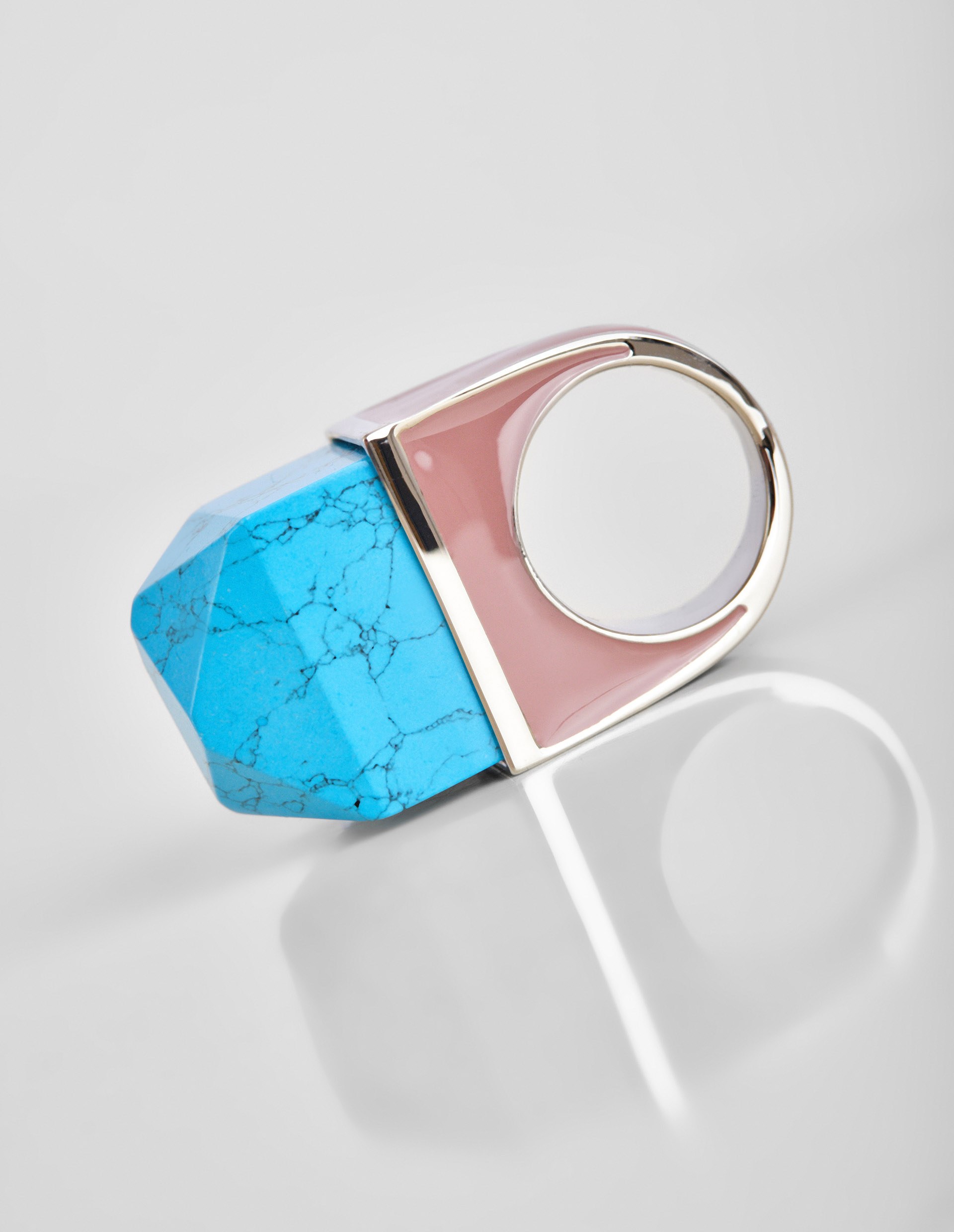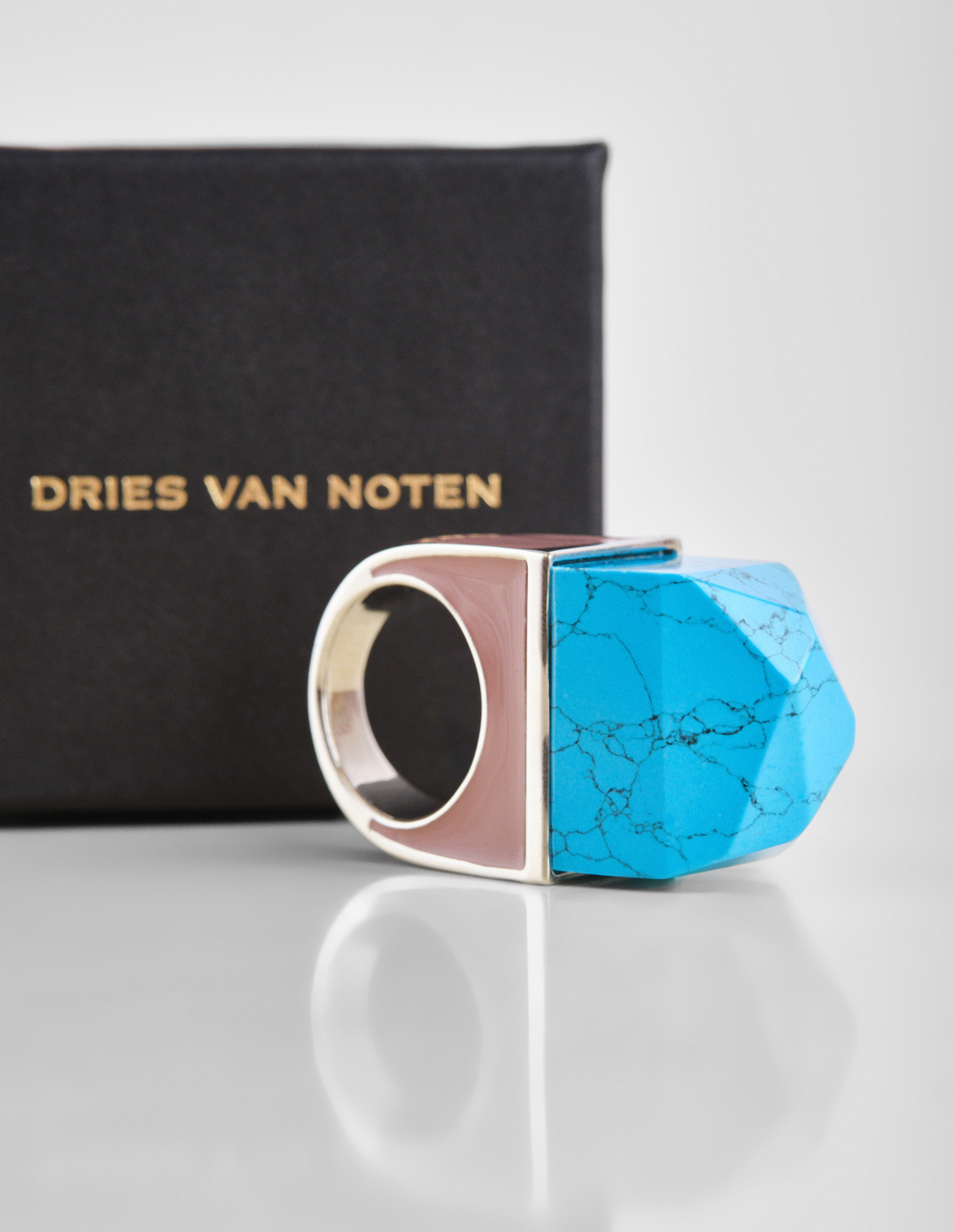 Бренд Dries Van Noten это полная гармония фактур, цвета и материалов. Таким идеальным симбиозом предстает массивное розовое кольцо. Нежный розовый оттенок, искусно обрамленный серебром, создает утонченный контраст с насыщенным голубым цветом. Когда материал из высококачественной латуни бережно поддерживает полудрагоценный камень бирюзу, который окутывает аксессуар особым магнетизмом, а его пленительная черная сеточка заставляет рассматривать кольцо еще дольше. Рекомендуем сочетать с другими аксессуарами с бирюзой от бренда Dries Van Noten.