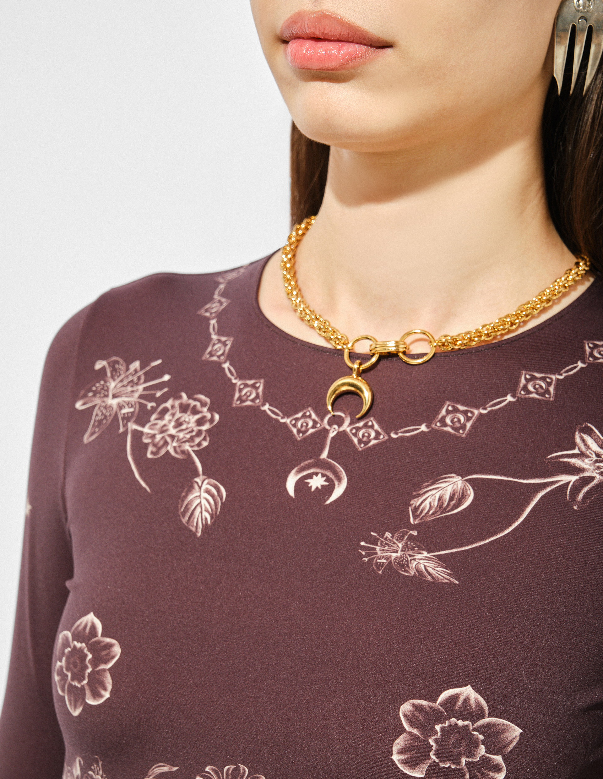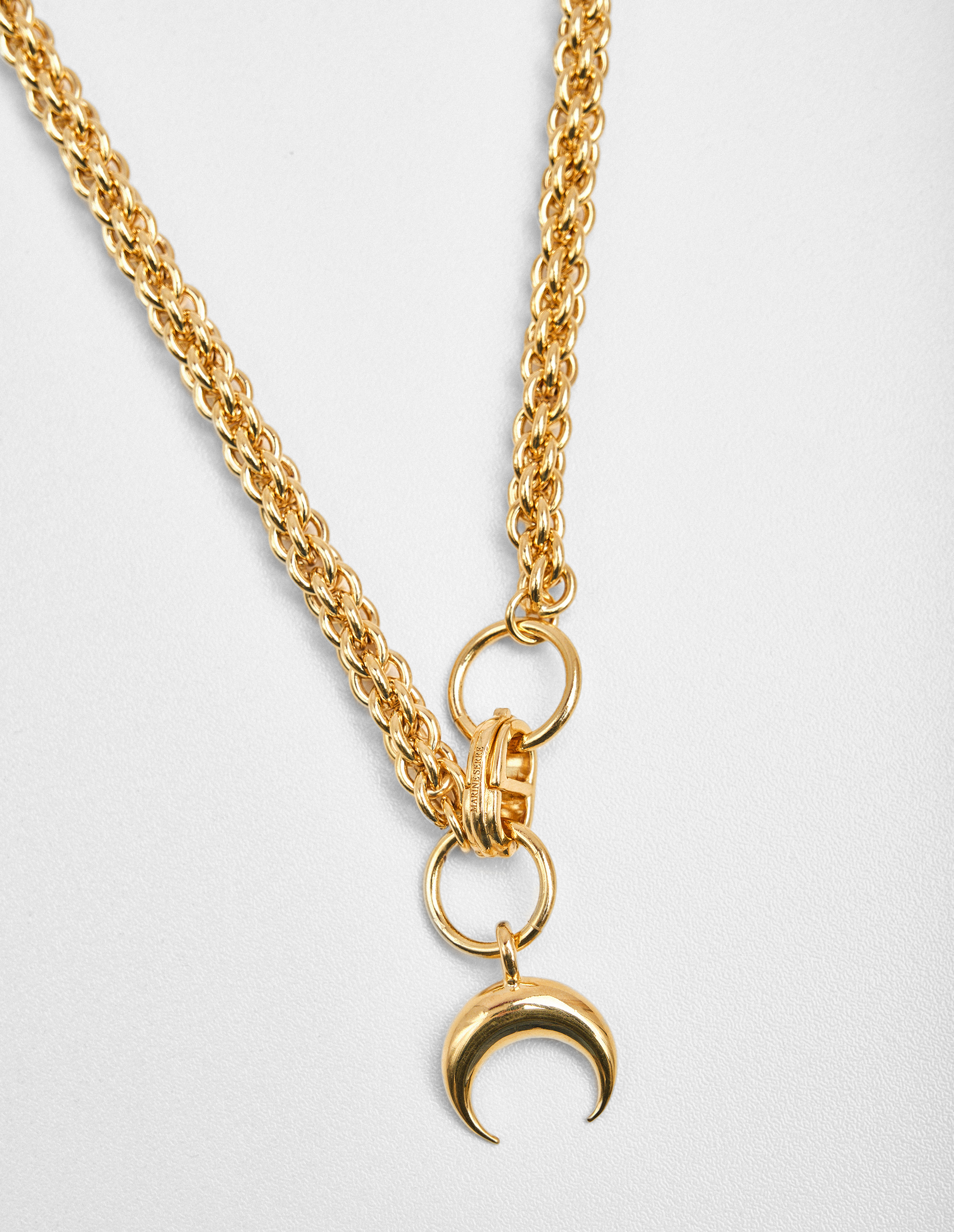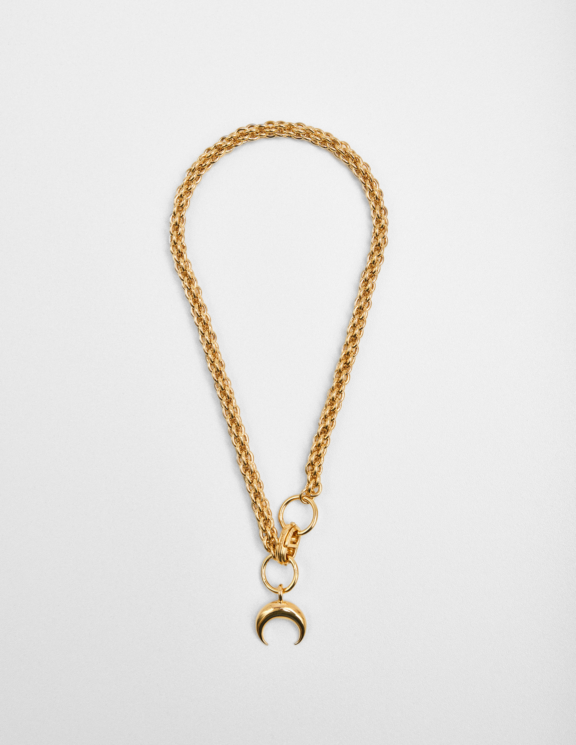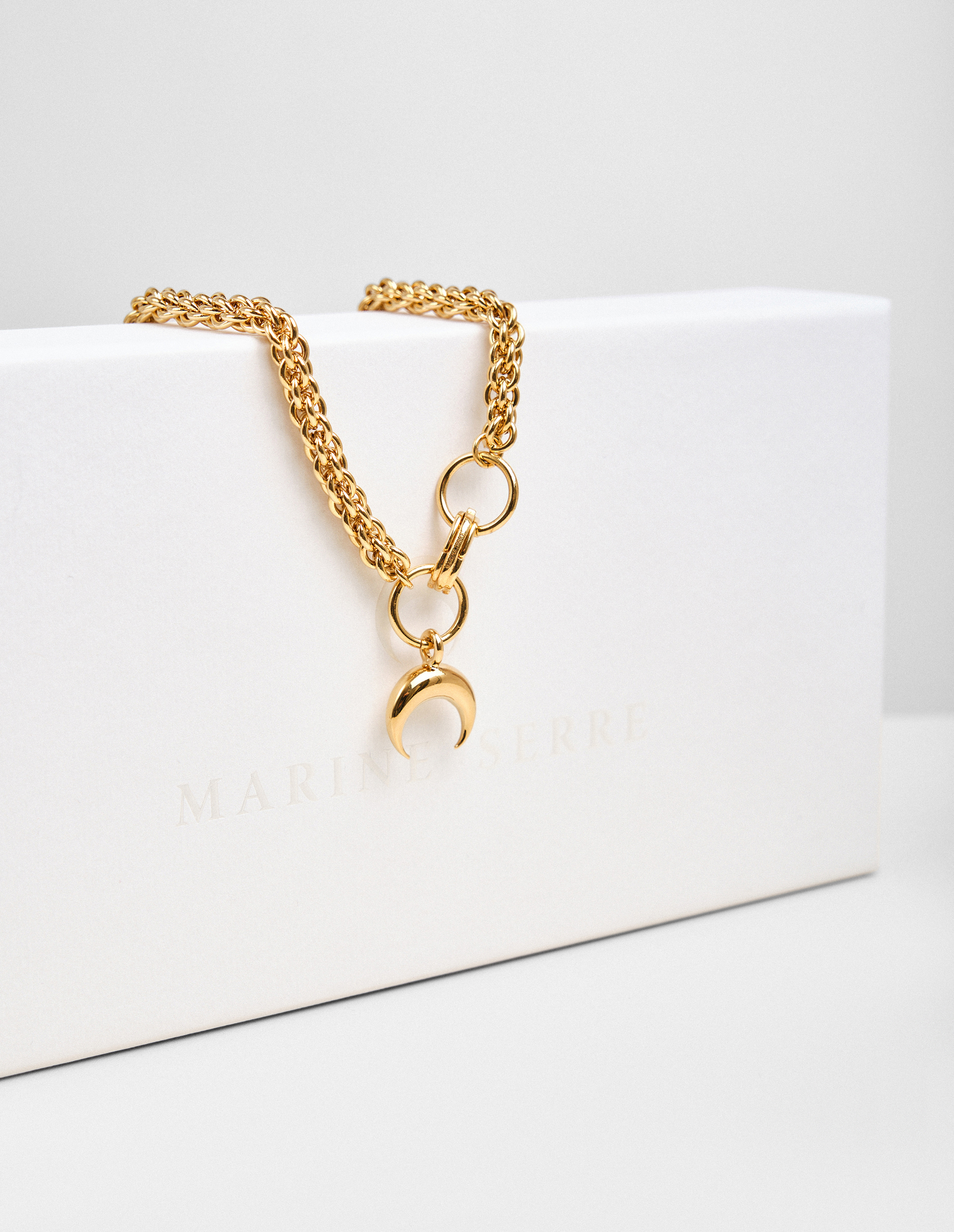 Изделие произведено из переработанного сплава и покрыто 100% золотом, сформировав плетеную цепь с английским замком и подвеской в виде культового полумесяца, означающего женственность и возрождение.