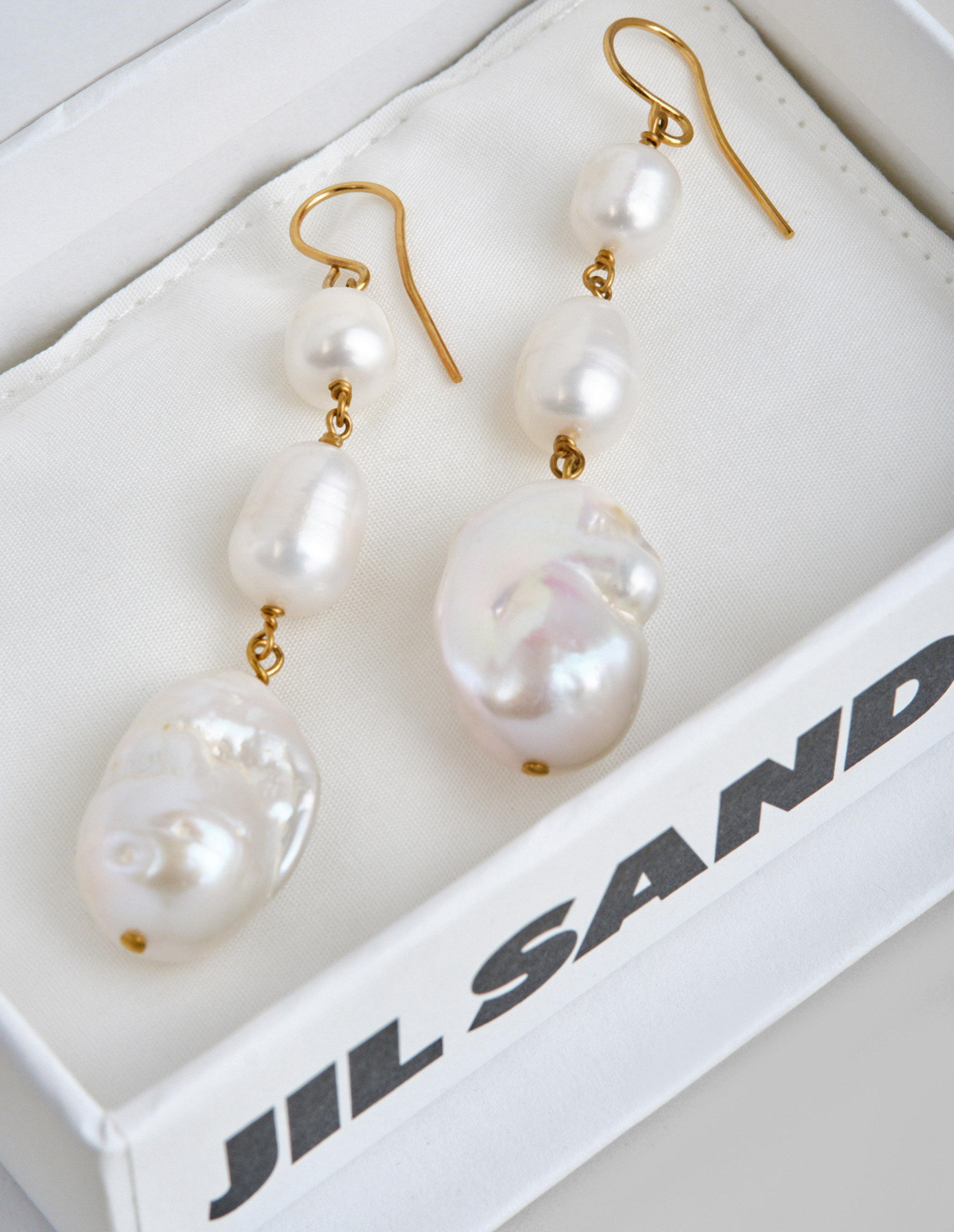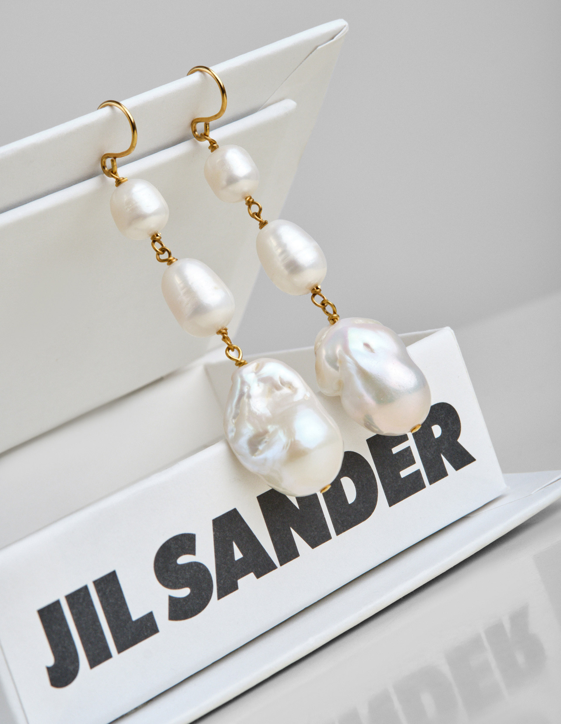 Порой даже самую классическую пару аксессуаров премиальный бренд Jil Sander способен превратить в искусство. Именно так, создав вручную, искусные серьги-подвески были украшены тремя изящными пресноводными жемчужинами. Уникальность изделия заключается в том, что ни одна из перламутровых жемчужин не повторяет своей формы и абсолютно особенна. Подчеркнуть нежный блеск помогает позолоченный гладкий ювелирный сплав, обладающий гипоаллергенными свойствами.