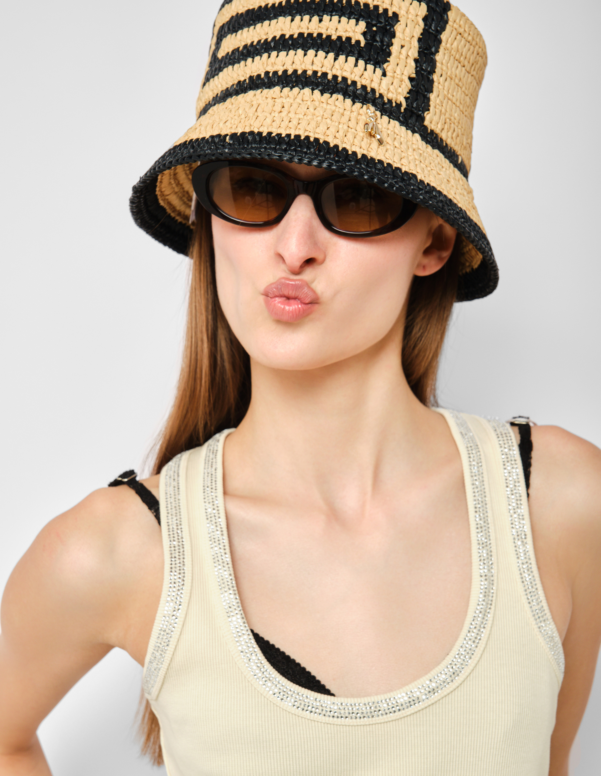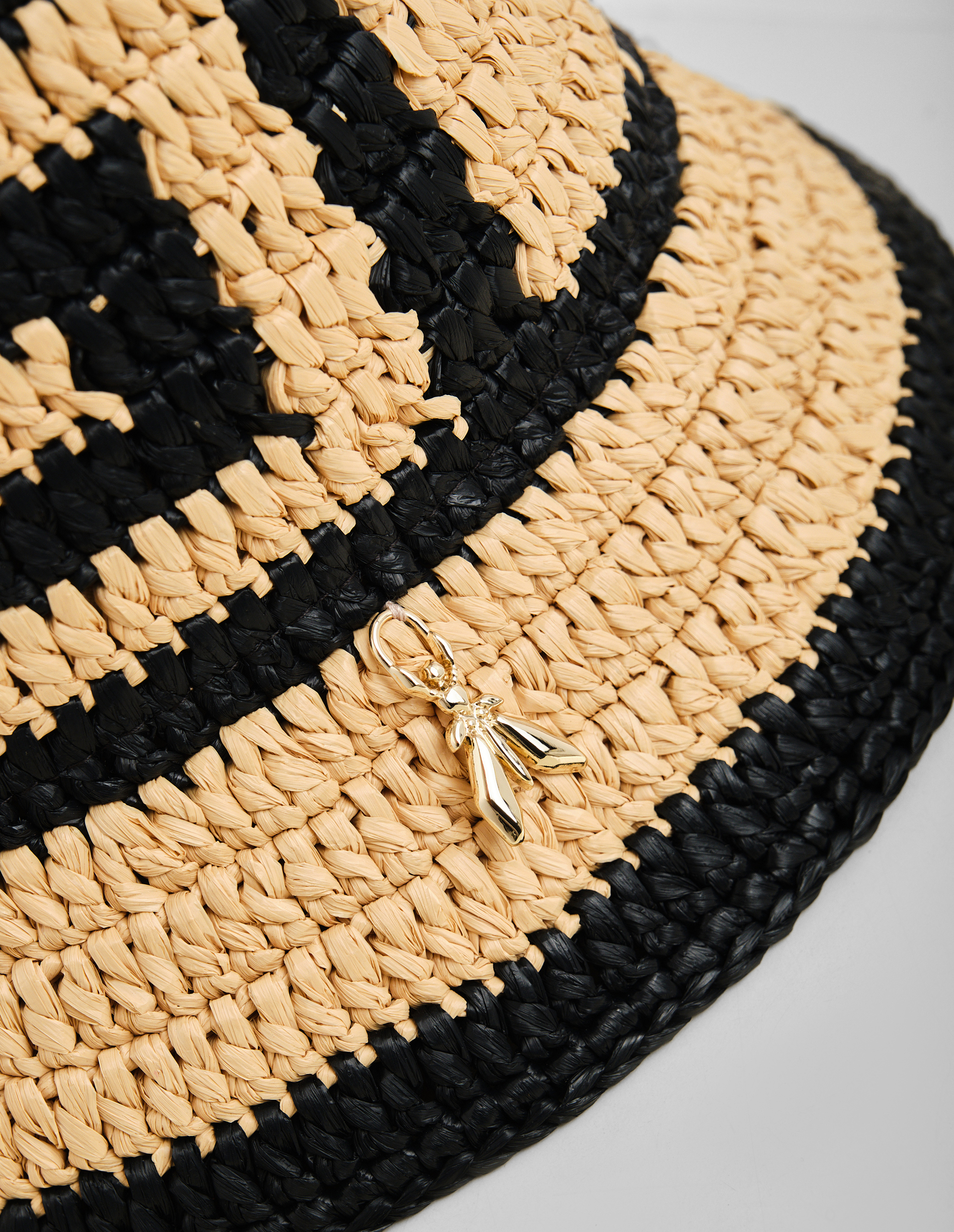 Солома и чёрный — сочетание, в котором природа встречается с графикой. Мягкие поля, держащие форму ровно настолько, чтобы защищать от солнца, но не выглядеть громоздкими. Чёрный узор, нанесённый на плетение тонкой линией, создаёт ритм — не кричащий, но достаточный, чтобы панама перестала быть просто утилитарным головным убором и стала аксессуаром с характером. В летних коллекциях Patrizia Pepe такие вещи появляются не случайно. Дизайнер Патриция Бамби, создавая образы для тёплого сезона, всегда ищет баланс между элегантностью и дерзостью, и головные уборы здесь работают как финальный аккорд . Мягкие шляпы-панамы уже становились частью фирменного почерка бренда, появляясь в кампейнах рядом с плетёными сумками и поясами с бахромой .