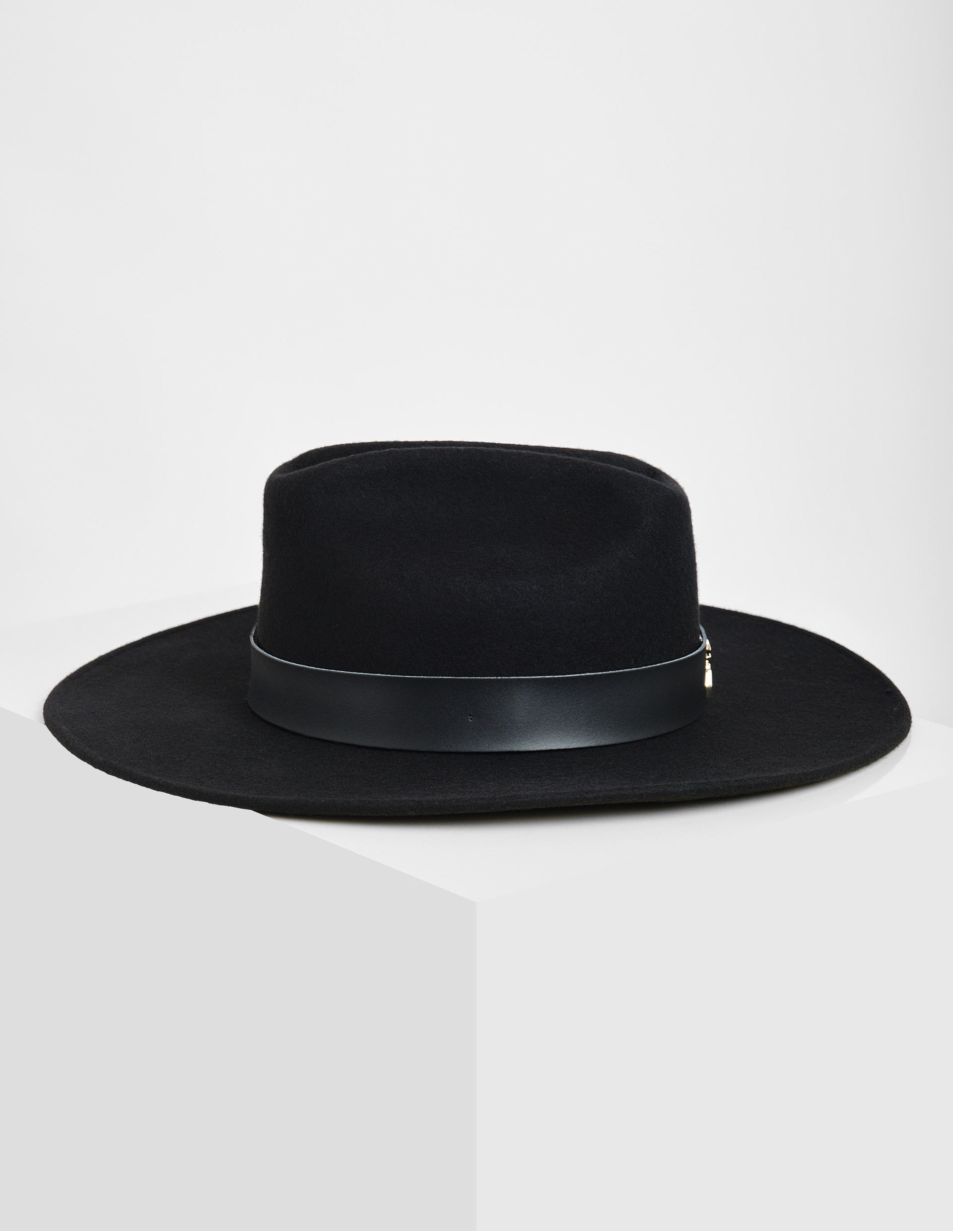 Стильная шляпа для небанальных образов. Выполнена из натуральной шерсти, украшена широкой лентой и большими полями. Золотистую цепочку можно использовать как съемный декор или шнурок для очков. Фирменная мушка на ленте добавляет эффектности. Шляпа будет хорошо смотреться с осенними плащами, пальто, костюмами. Гладкая поверхность приятна на ощупь. Строгий черный вписывается в любые сезонные ансамбли.