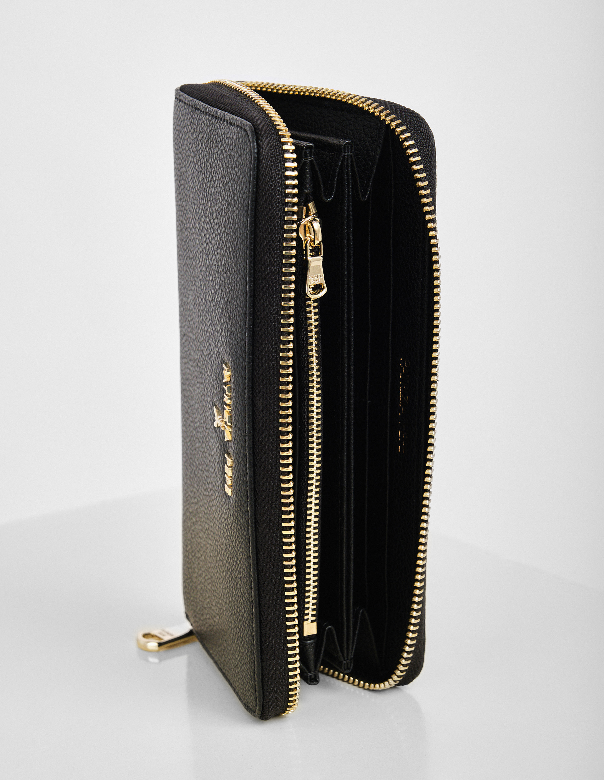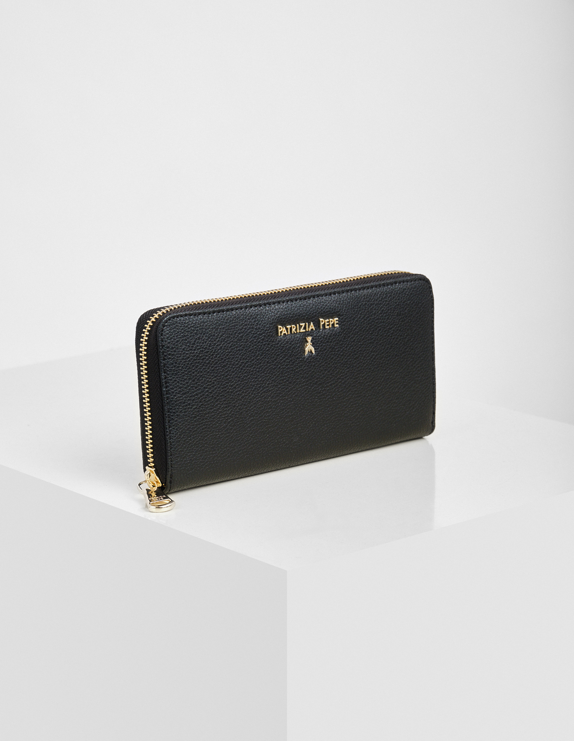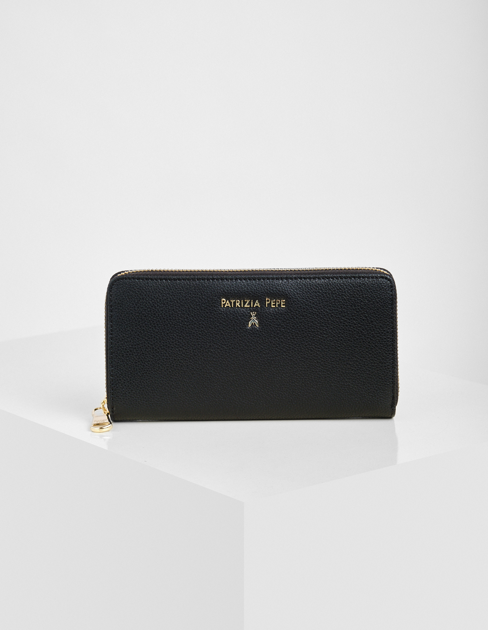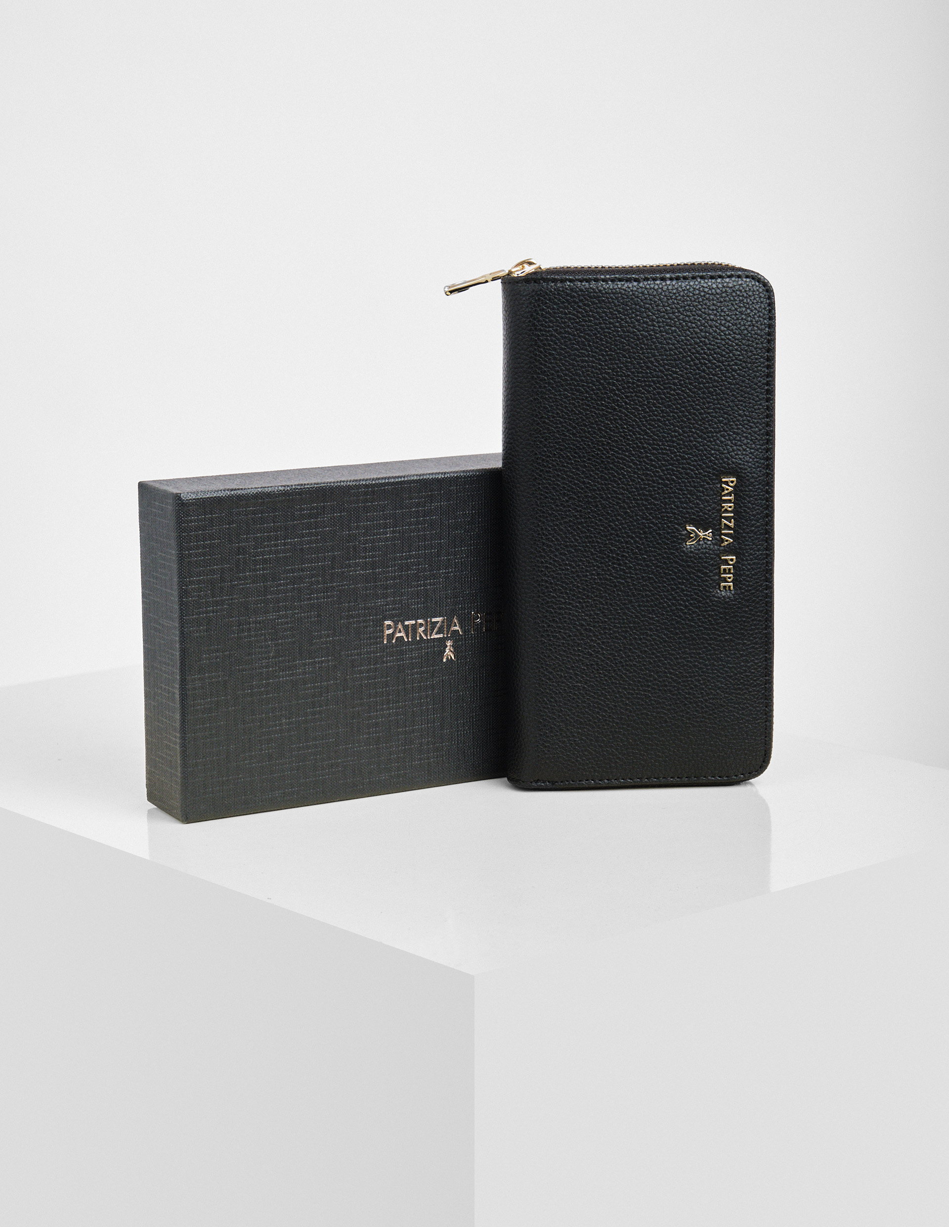 Кошелек ESSENTIAL от бренда Patrizia Pepe изготовлен из натуральной телячьей кожи с соблюдением всех стандартов Made in Italy. Портмоне застегивается на молнию, ведущую в функциональное отделение с муаровой подкладкой, дополнительным zip-карманом и слотами для карт. Фирменная подпись в виде трехмерного золотистого логотипа и мушки Fly украшает фактурную черную поверхность. Этот аксессуар станет вашим стильным органайзером для важных вещей, готовым прослужить долгие годы.