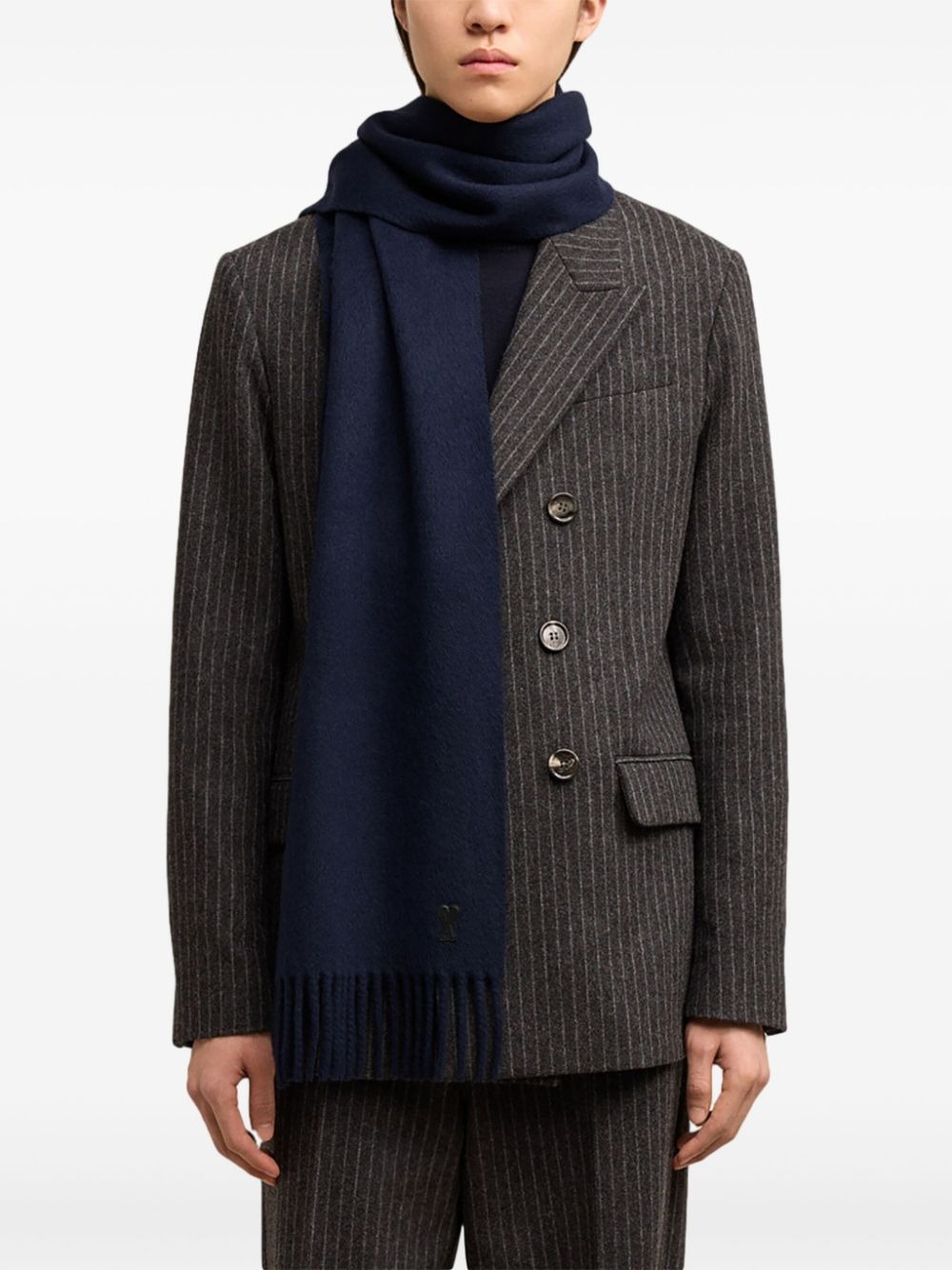 Классический шарф от бренда Ami Paris станет идеальным спутником стильных образов с французским шиком. Он также подарит тепло и ощущение уюта благодаря 100% фетровой шерсти с эффектом кашемира, чье премиальное качество гарантирует всегда роскошный внешний вид и долгий срок службы. Аксессуар имеет размер 25х190 см, дополненный бахромой. Такая длина позволит проявить фантазию и носить шарф, применяя различные способы завязывания. Черный кожаный патч в виде сердца Ami de Coeur символизирует любовь Александра Матттьюзи к собственному делу и его почитателям.
