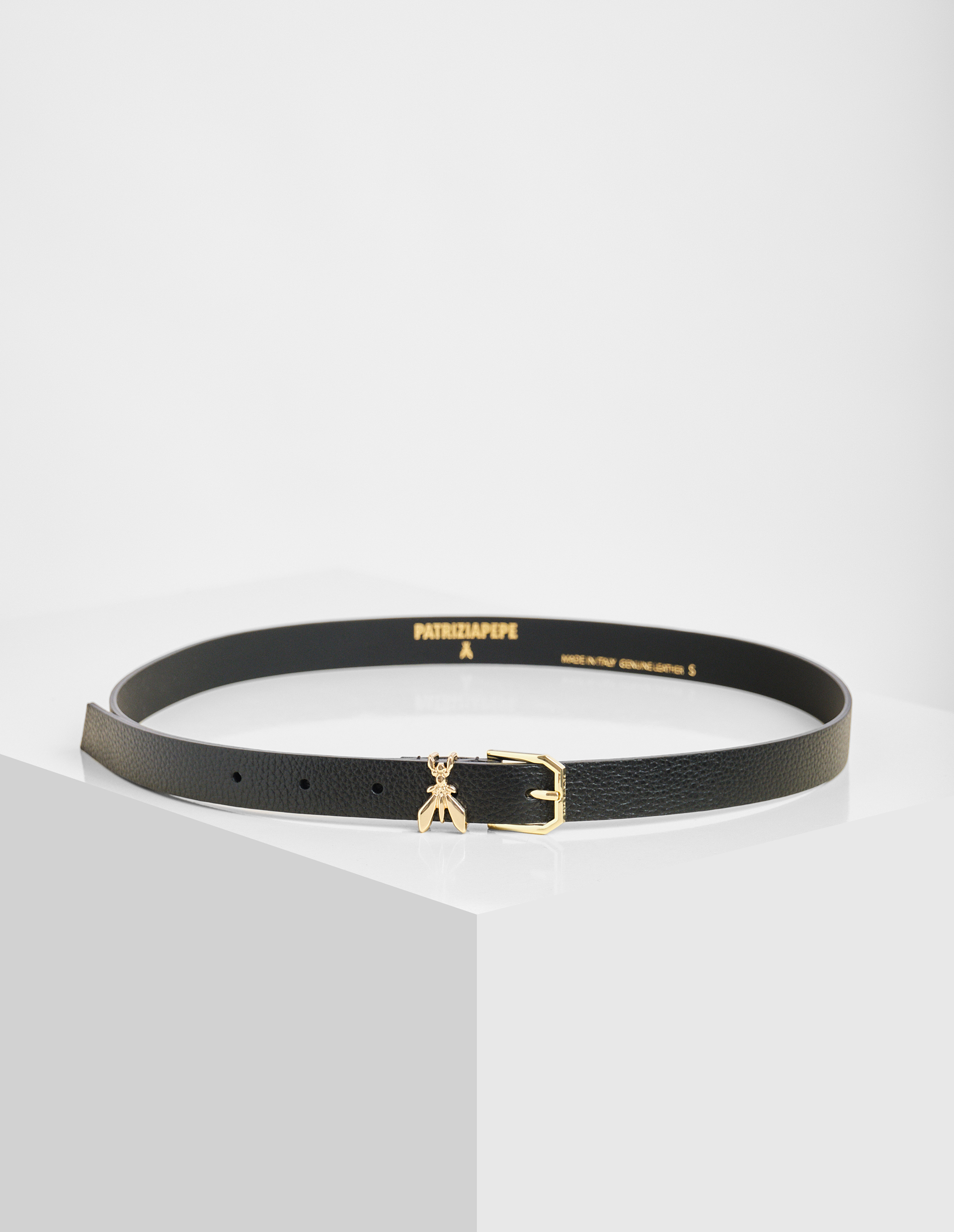 Узкий черный ремень из натуральной кожи с золотистой пряжкой Fly