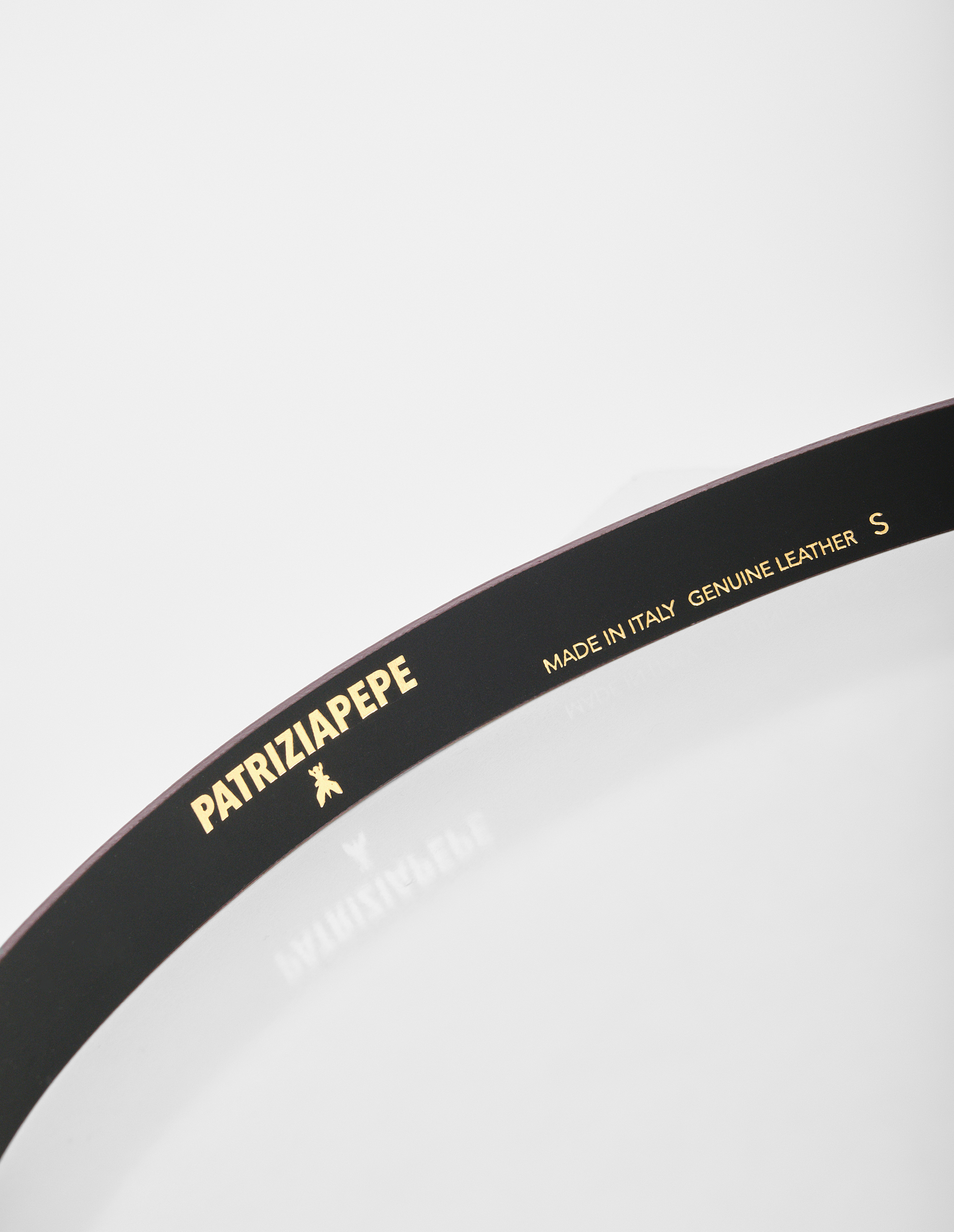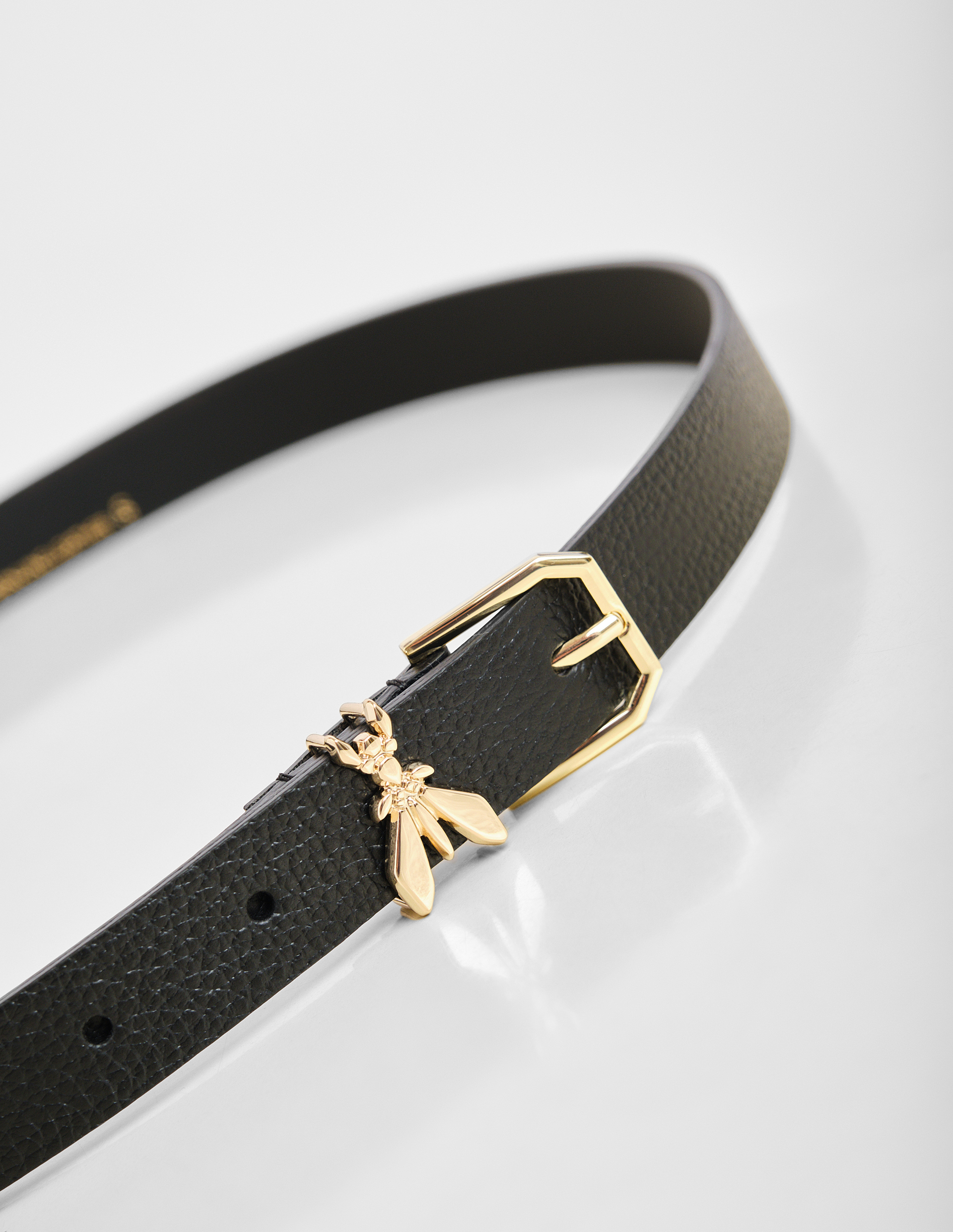 Золотая пряжка в форме мухи Fly — тот самый случай, когда символ становится важнее функции. Она не просто застёгивает ремень, а превращает его в высказывание. На матовой чёрной поверхности золото звучит контрастно, но не агрессивно — скорее как напоминание о том, что даже в самом строгом образе может быть место для иронии. Patrizia Pepe носит этот знак больше десяти лет, и каждый раз он работает заново: то спрячется на спинке сумки, то выйдет на первый план, как здесь.