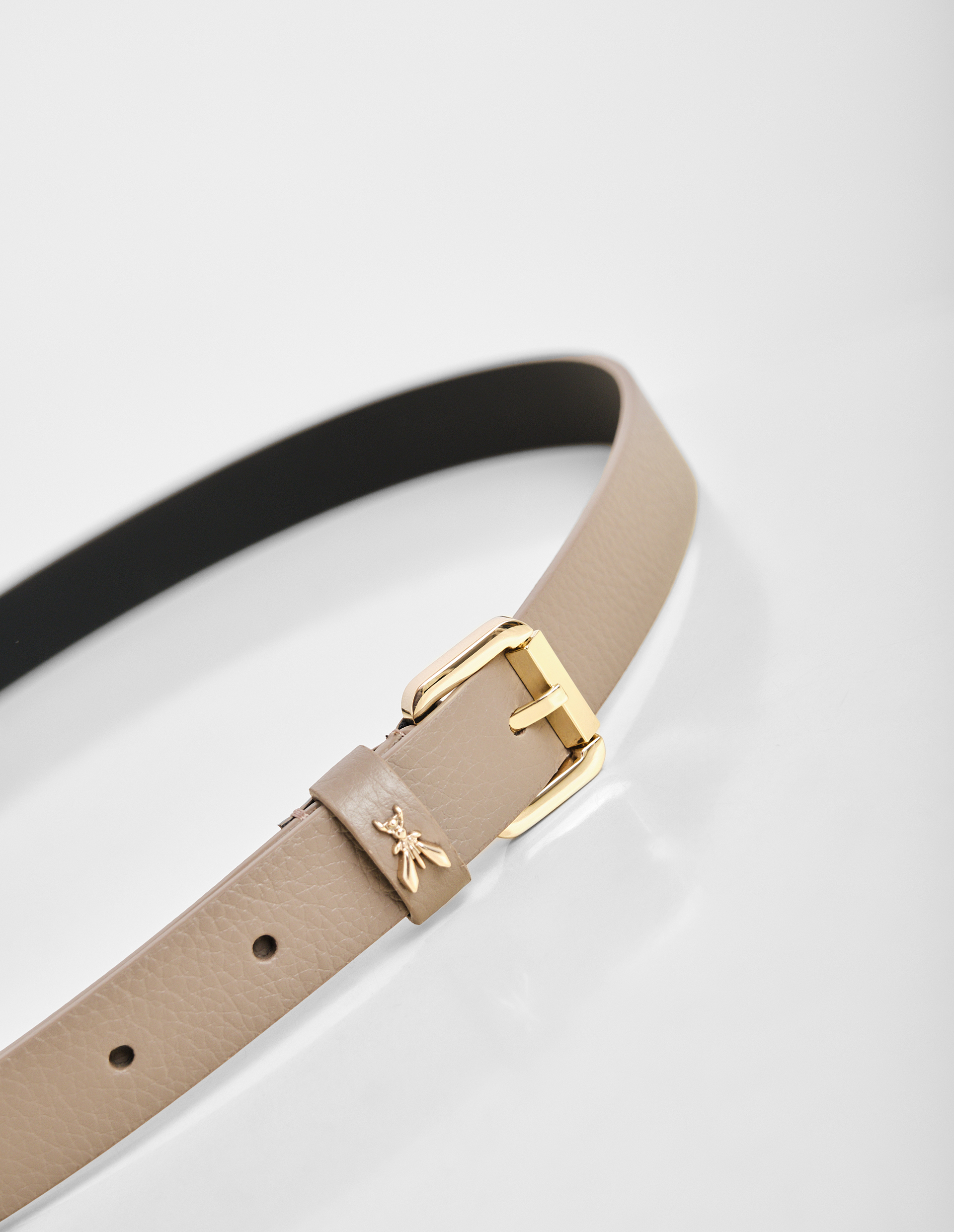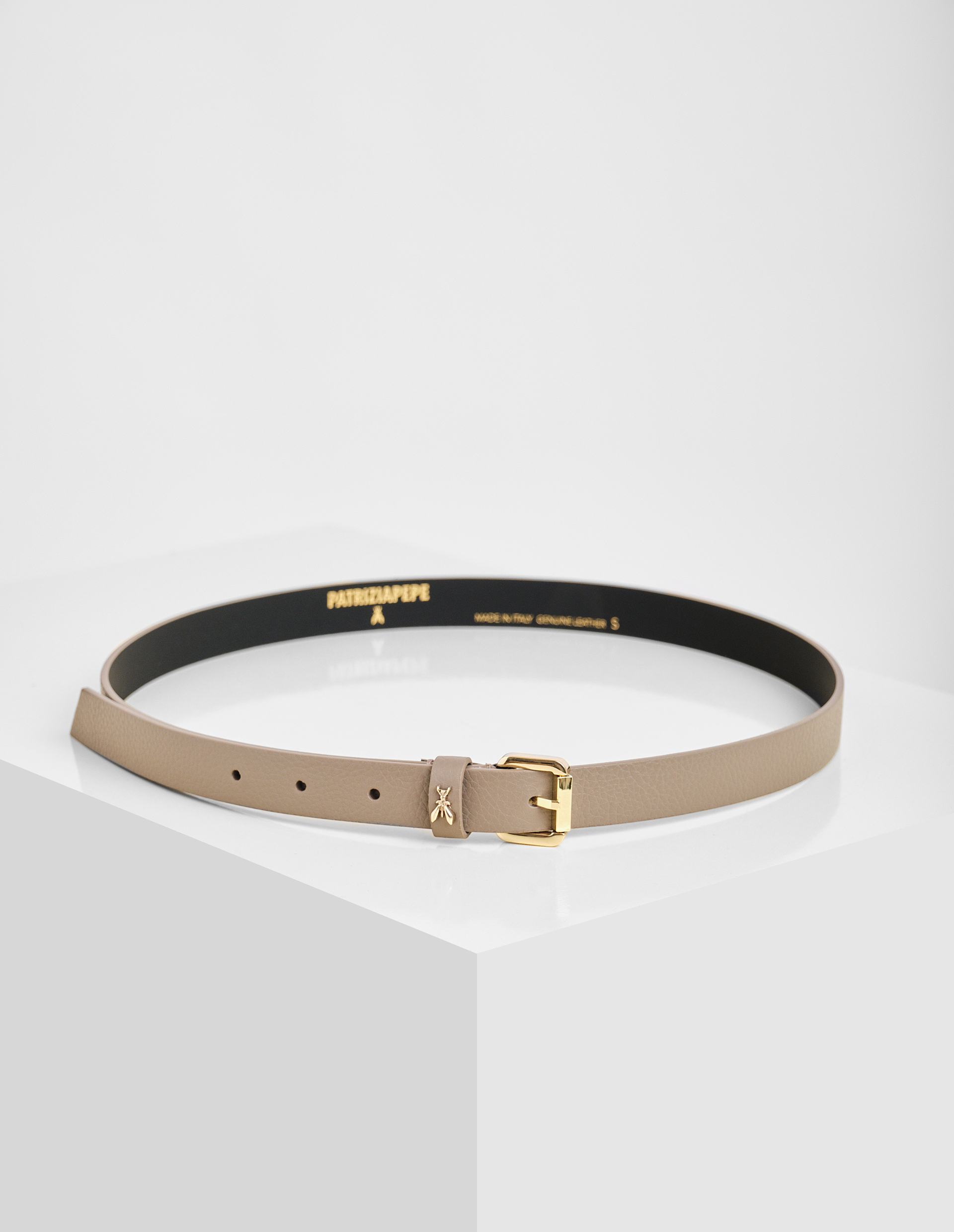 Изящная классика. Тонкий ремень из бледно-серой зернистой кожи добавляет образам нежность и легкость. Золотистая пряжка превосходно сочетается с теплым оттенком бежевого. Маленькая мушка становится стильной акцентной деталью, притягивающей внимание. Внутренняя сторона ремня выполнена в черном цвете и украшена золотым логотипом. Идеально для романтичных летних платьев, длинных сарафанов, легких блуз или кардиганов.
