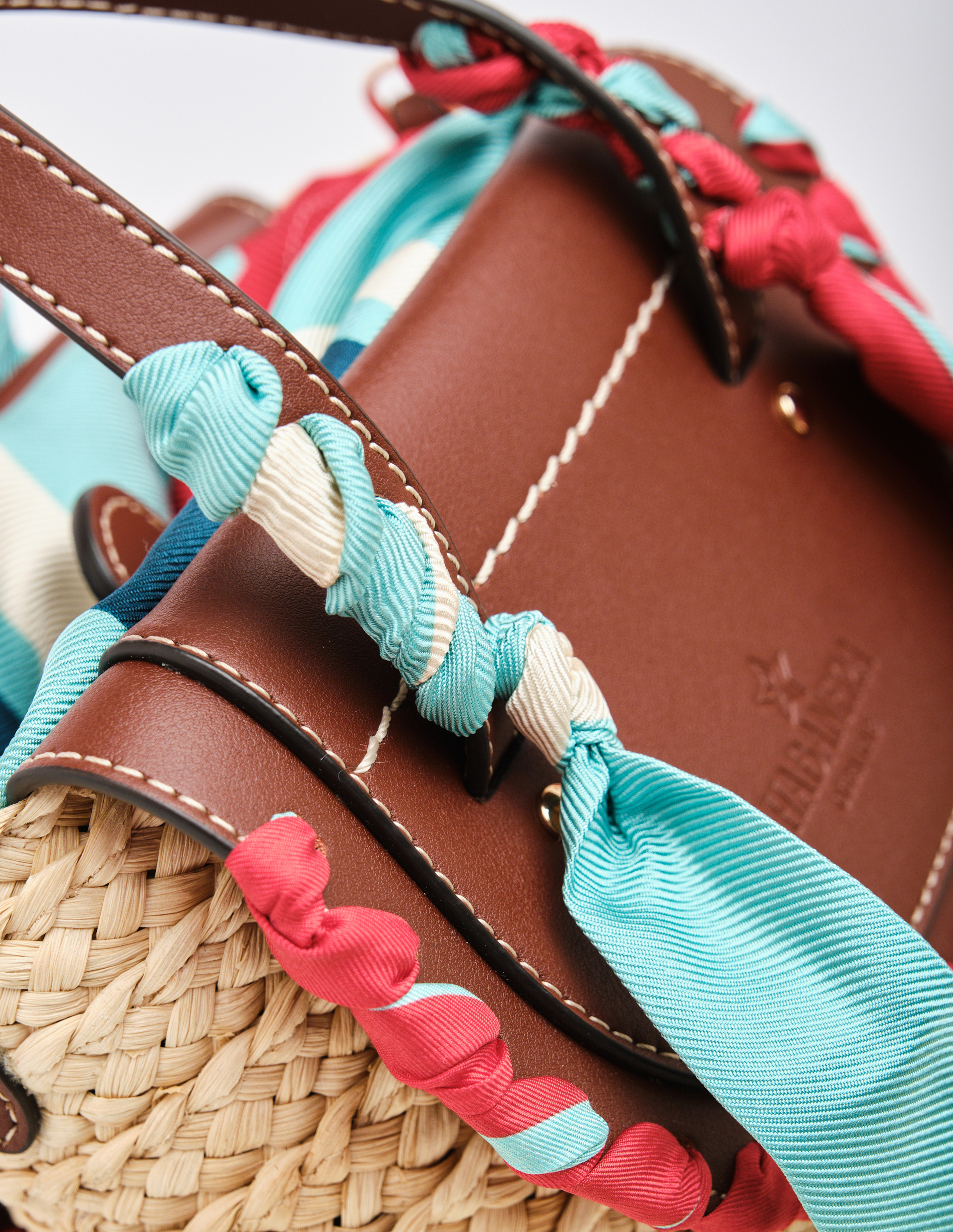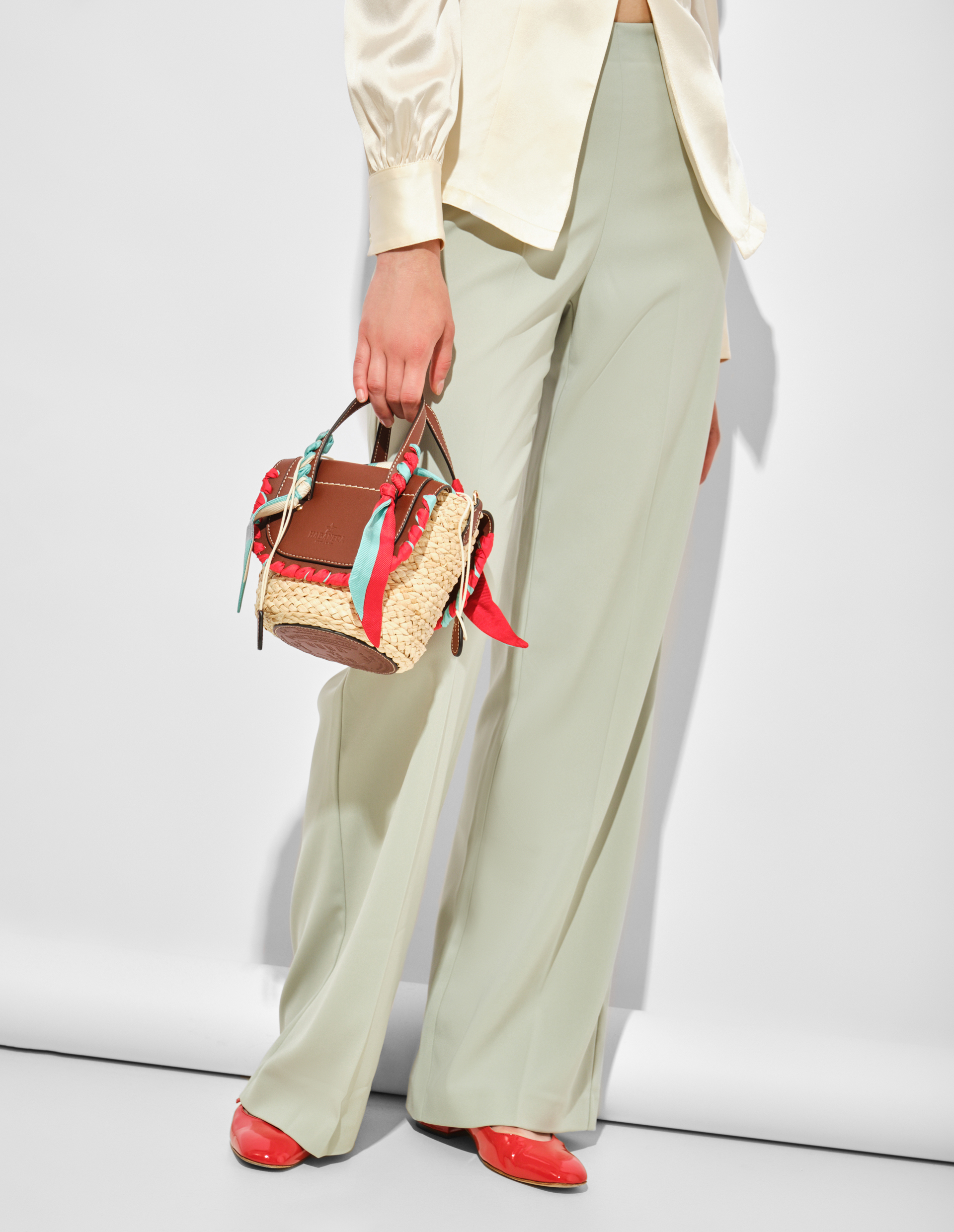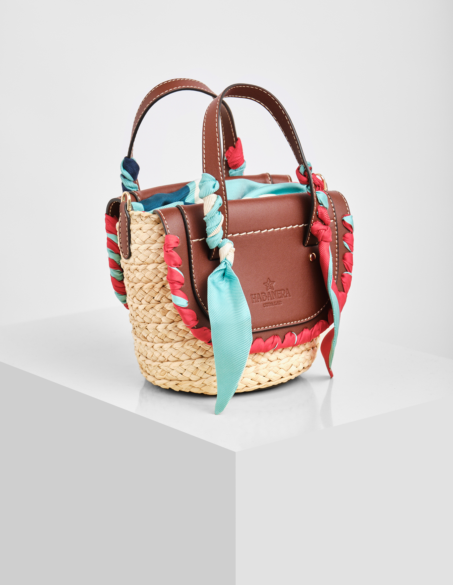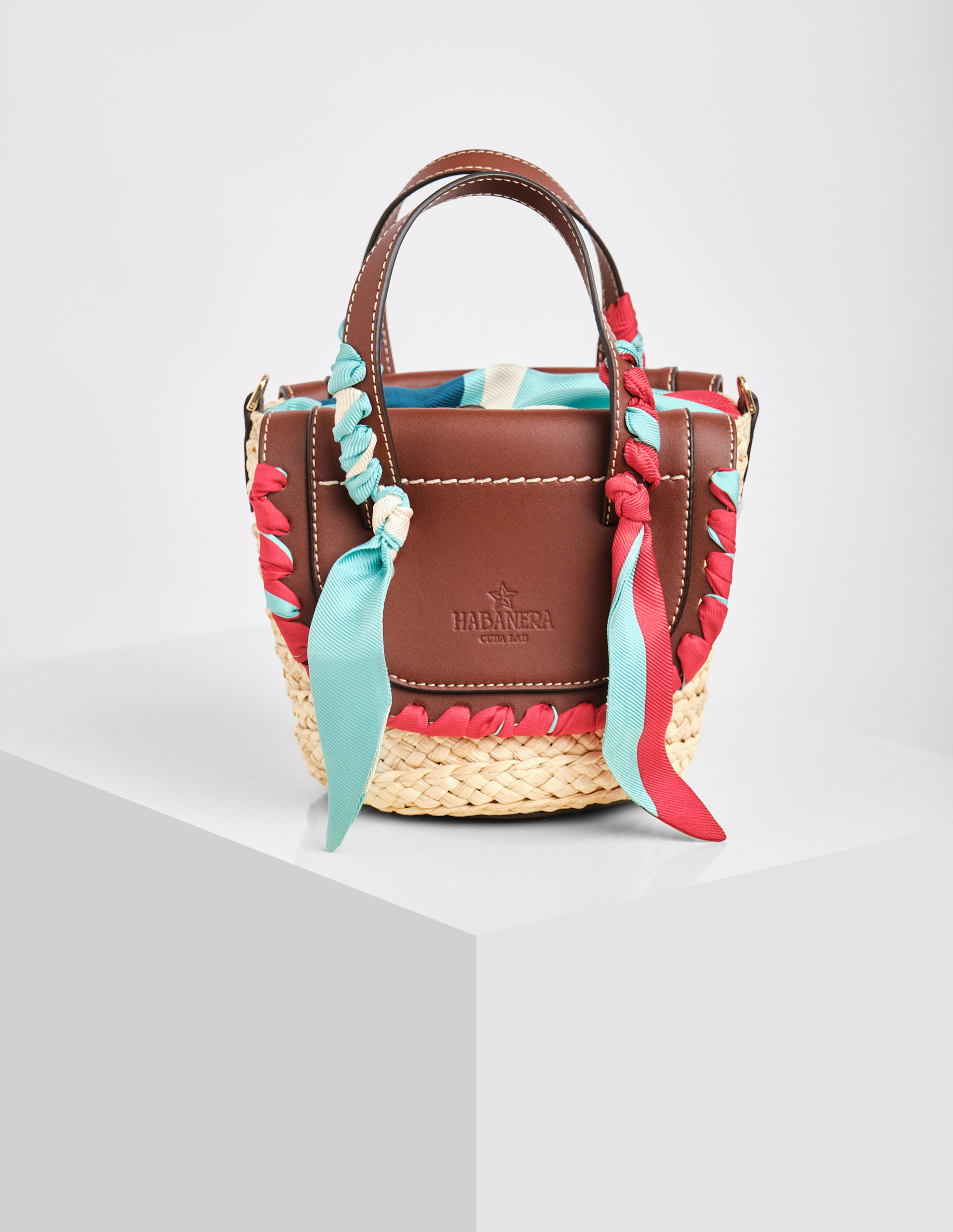 В этой сумке от Cuba Lab воплотилась вся философия бренда – гармония традиционных техник и современного дизайна. Два благородных клапана из коричневой кожи цвета Mogano обрамляют плетёный корпус кукурузного оттенка, создавая эффектный контраст текстур. Особый шарм аксессуару придают шелковые ленты ручной работы в фирменной насыщенной гамме: глубокий чёрный, страстный красный и яркий бирюзовый. Этот же роскошный переработанный шёлк с графичным принтом использован для подкладки, где вас ждёт удобный карман на молнии. Две кожаные ручки и съёмный ремень предлагают разные варианты носки, а все кромки тщательно окрашенные вручную мастерами SanPatrignano, демонстрируя безупречное качество исполнения.