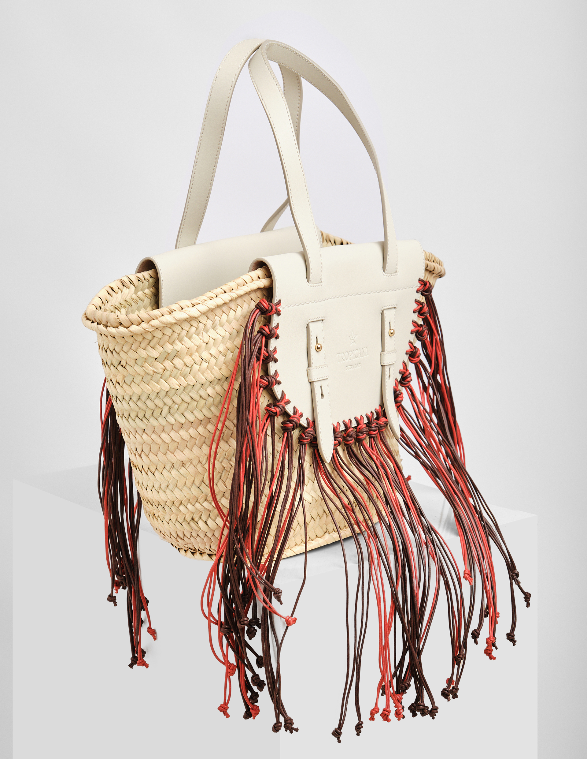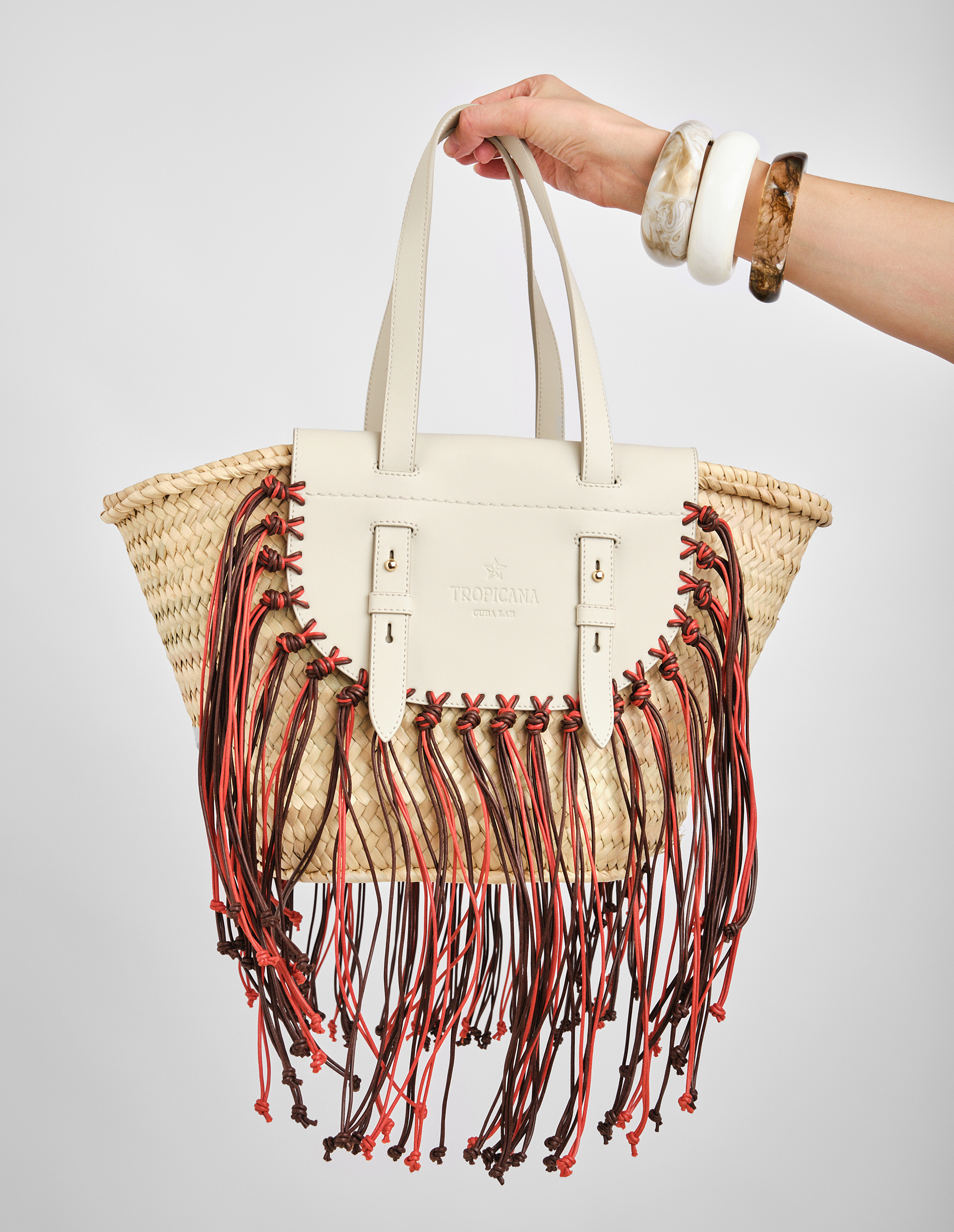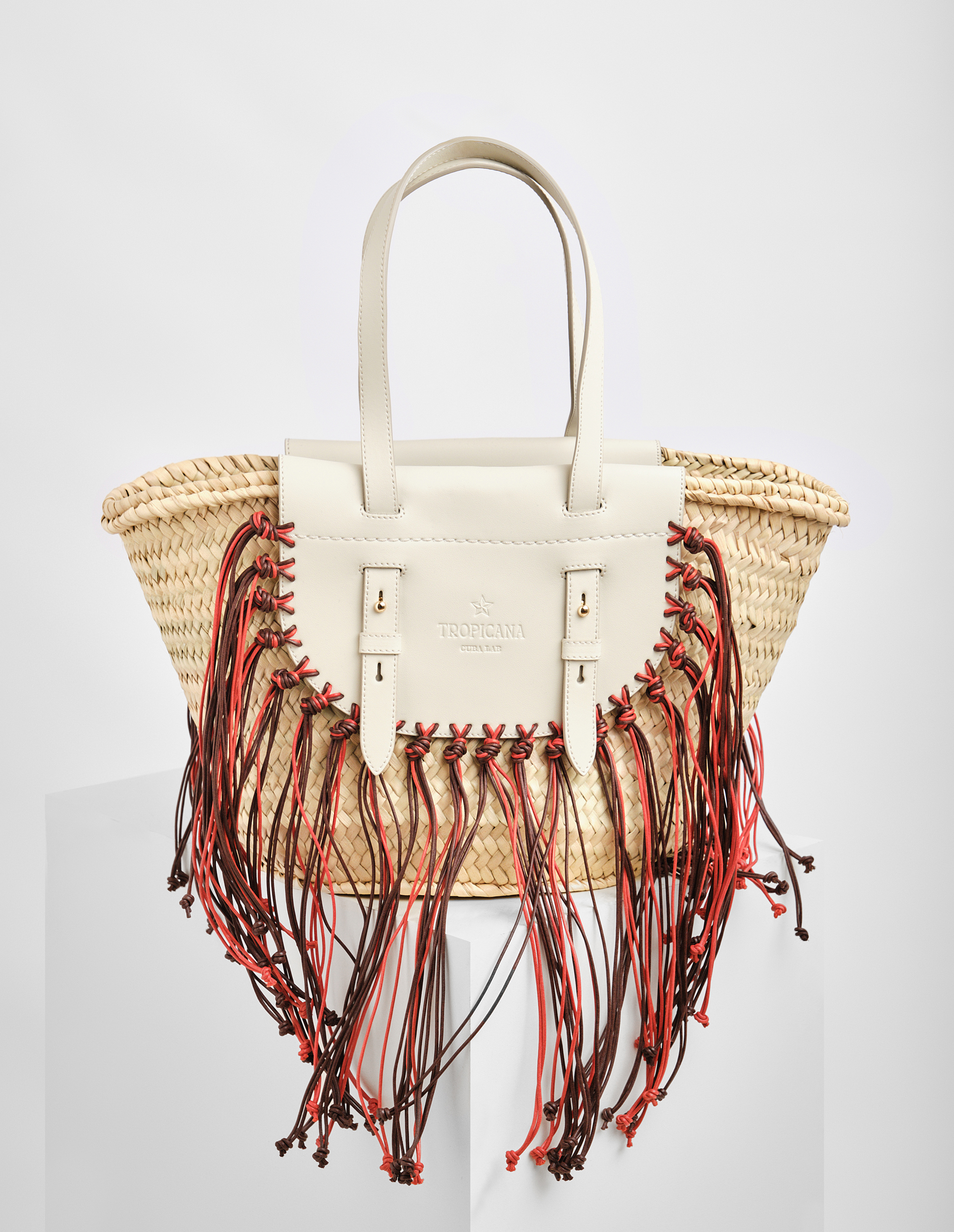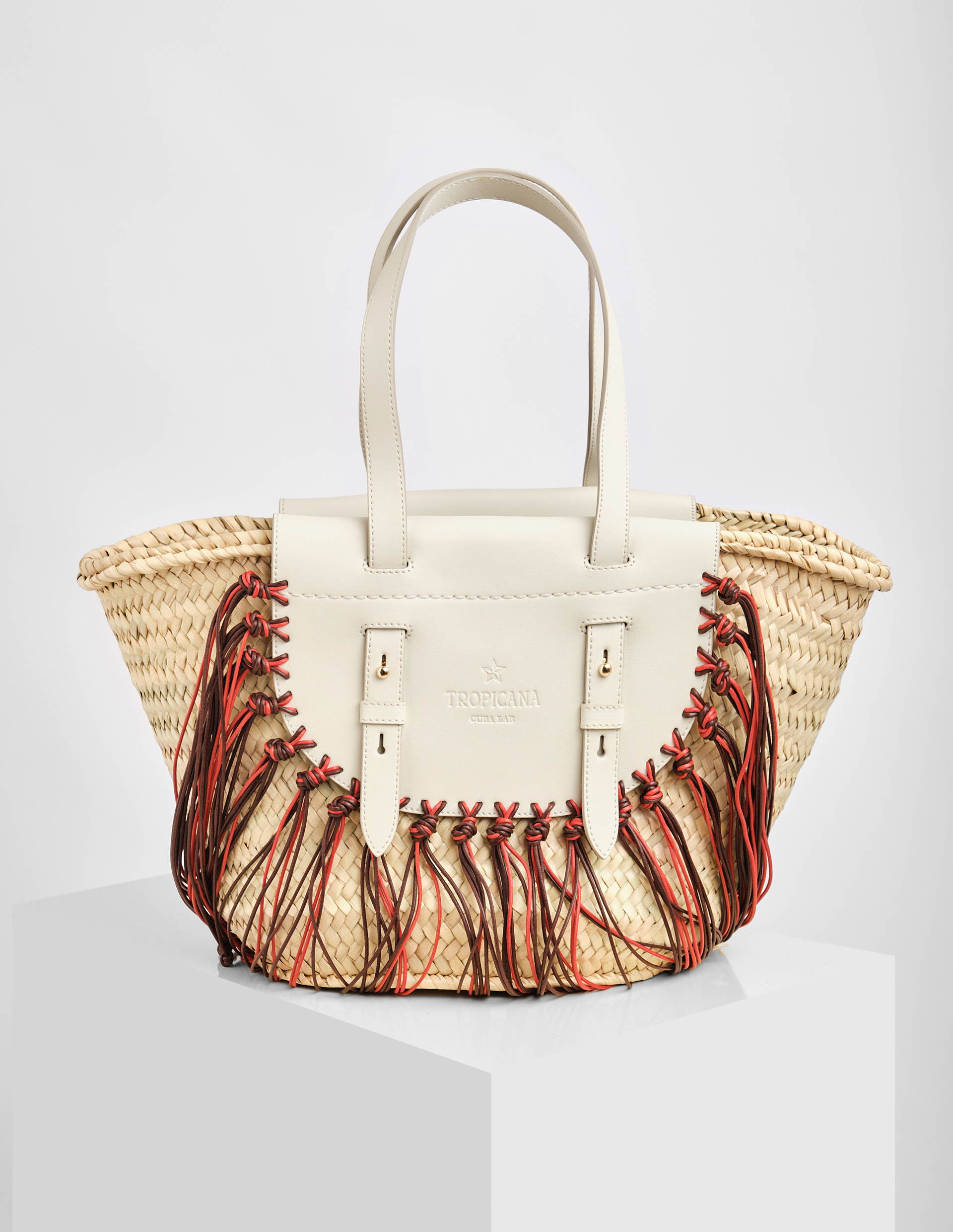 Сумка Tropicana от бренда Cuba Lab — воплощение солнечного настроения в экологичном дизайне. Эта плетёная корзина сочетает природную фактуру пальмовых листьев натурального кукурузного оттенка с благородной кожей клапанов цвета слоновой кости. Они также украшены изысканной ручной отделкой – бахромой из вощёных шнуров, где каждый элемент выполнен с особым вниманием к деталям.
