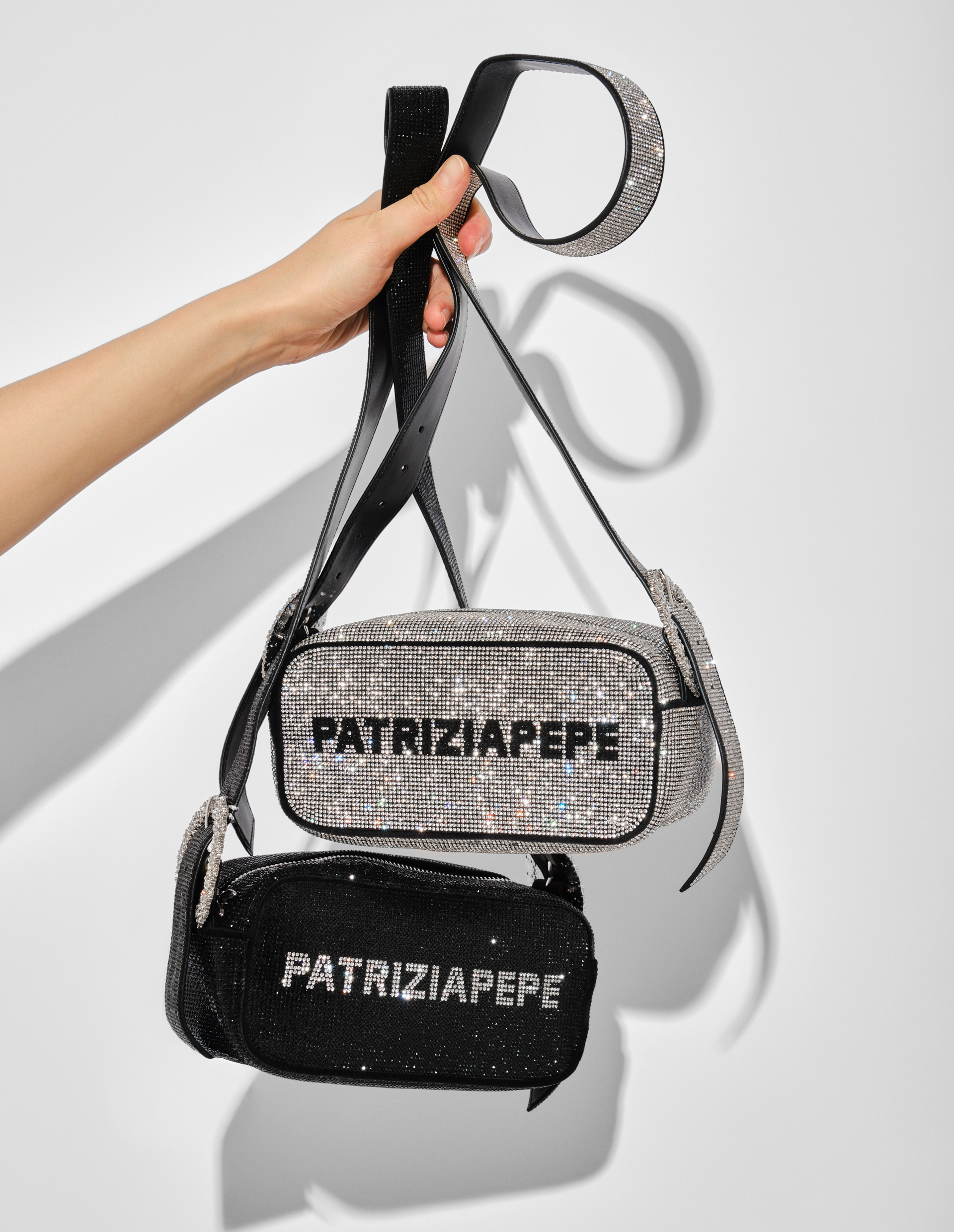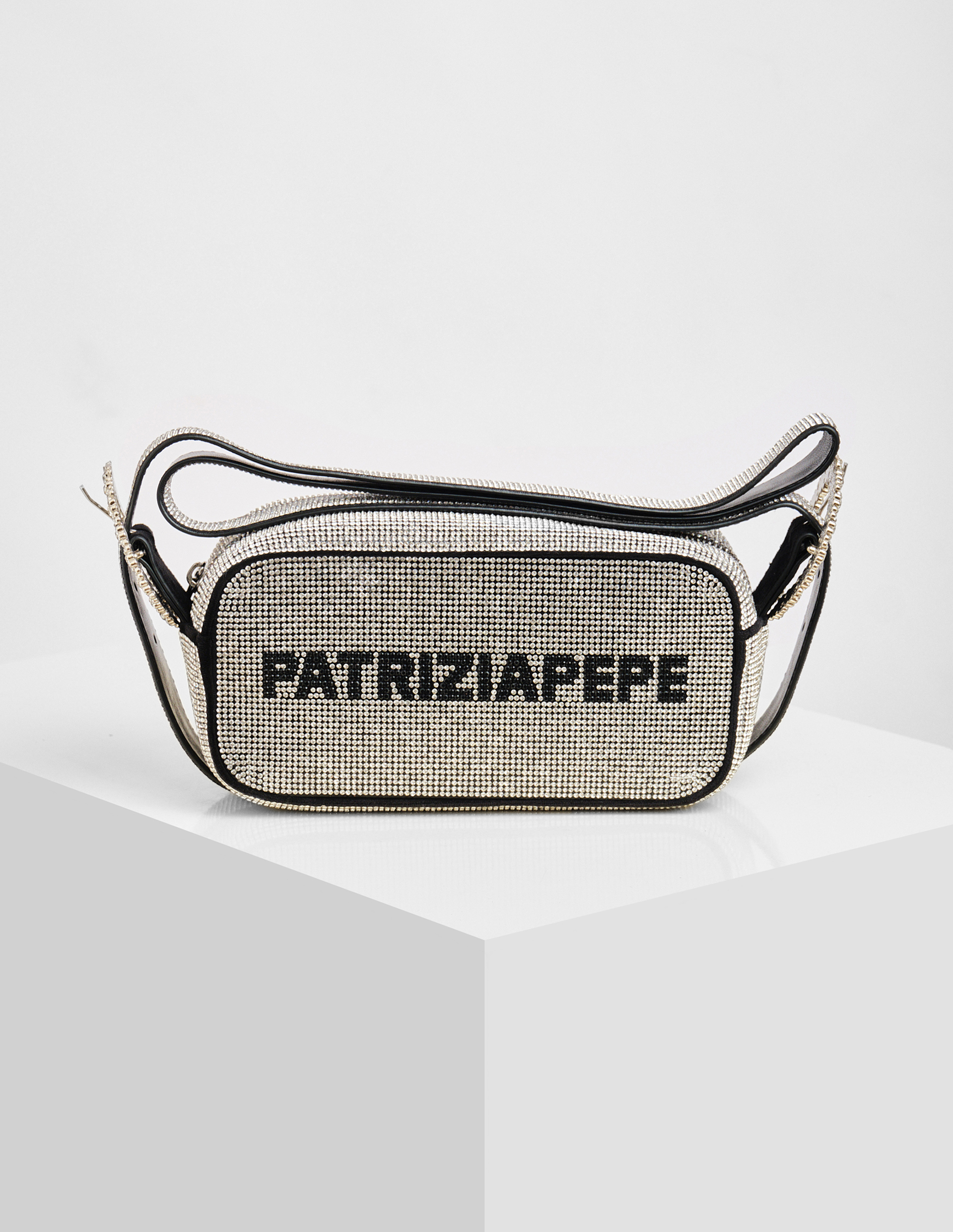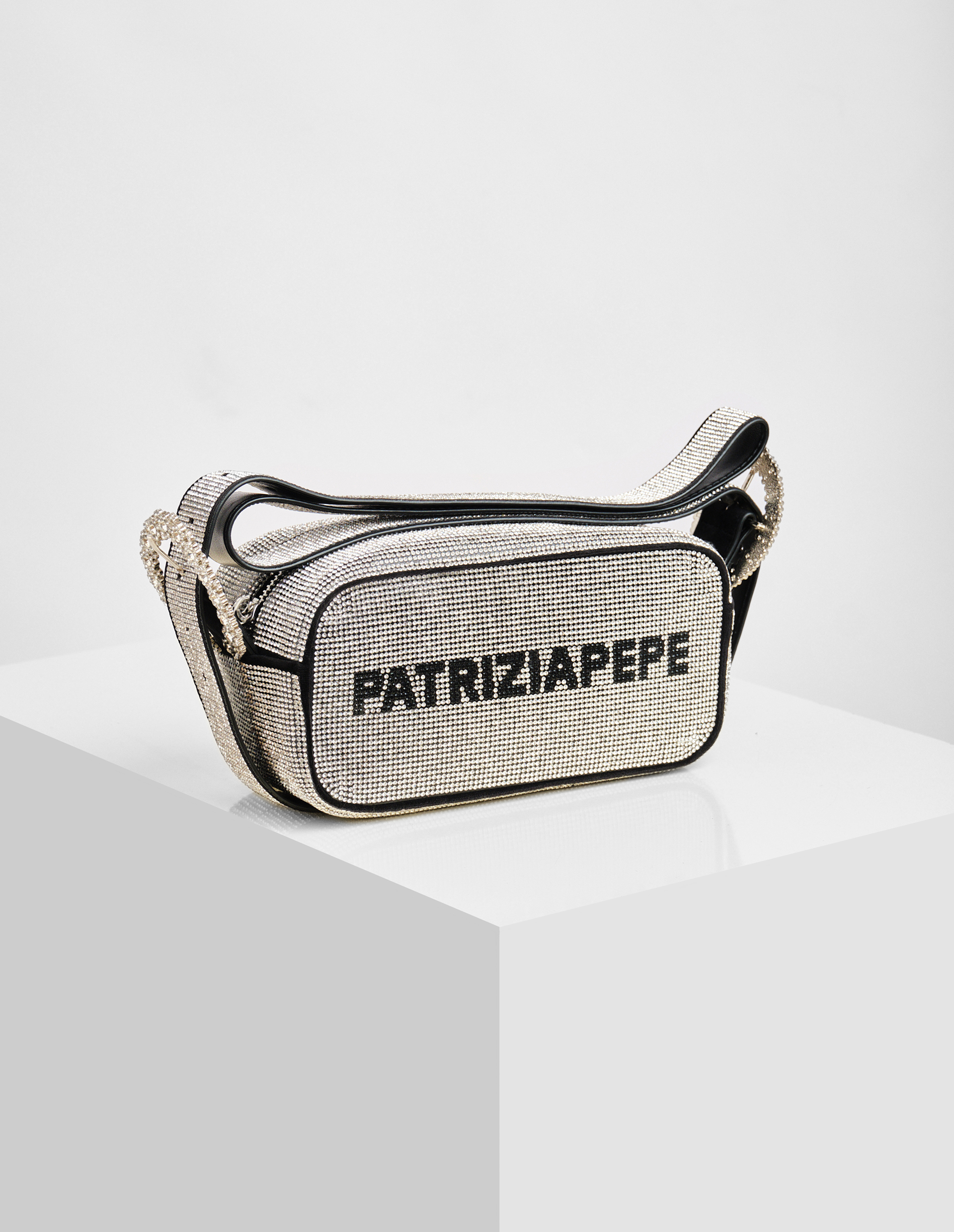 Мини-сумка (IM)PERFECTION бросает вызов традиционным канонам совершенства через радикальную эстетику тотальной инкрустации. Модель, полностью покрытая серебристыми стразами, демонстрирует фирменный логотип PATRIZIA PEPE, выполненный контрастными кристаллами. Длинный регулируемый ремень через плечо с аналогичным декором и никелированной пряжкой создает эффект целостного сияния. При компактных размерах 19,5×12×11 см внутреннее пространство организовано функционально: молния с бегунком в тон фурнитуре и практичный карман. Контрастная подкладка с каллиграфическим принтом (IM)PERFECTION на ткани с мятым эффектом раскрывает идею Patrizia Pepe: поиск красоты в дерзком нарушении правил.