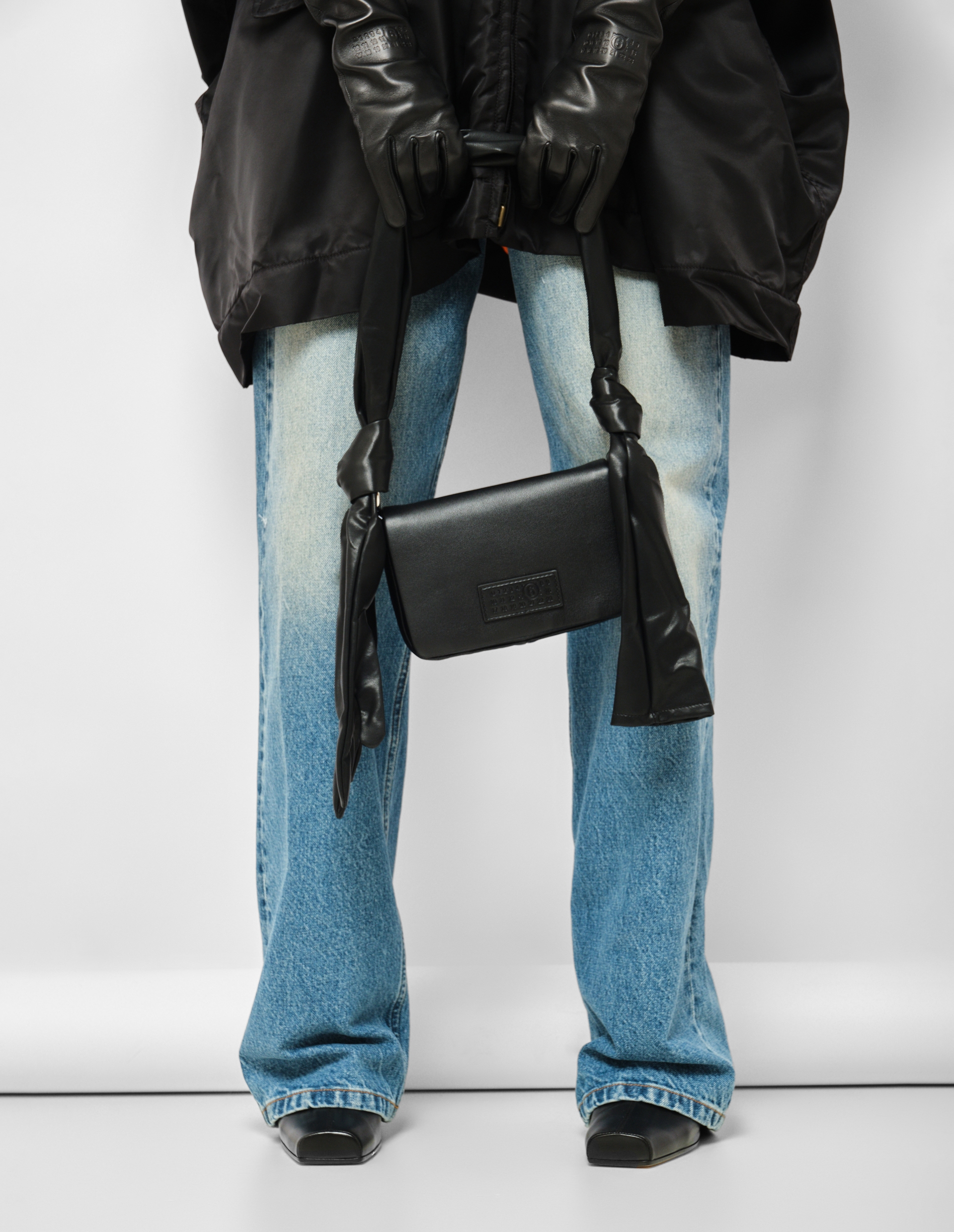 Сюрреализм, который всегда под рукой. Эта сумка от MM6 Maison Margiela — чистый пример фирменной философии деконструкции, где привычные формы переосмысливаются через неожиданные детали. Лаконичный черный тоут с клапаном на магнитной застежке мог бы быть просто элегантной базой, если бы не главный архитектурный элемент: длинный ремень выполнен в виде цельной перчатки с узлом у основания. Этот сюрреалистический жест превращает утилитарный аксессуар в предмет современного искусства, заставляя задуматься о границах между функциональностью и концепцией. Модель выполнена из полиэстера с полиуретановым покрытием, имитирующим кожу, и хлопковой подкладкой — материалы подобраны так, чтобы обеспечить долговечность и благородную фактуру без лишнего веса. Компактный размер вмещает самое необходимое, не теряя изящества пропорций, а внутренний карман на молнии позволяет организовать мелочи. На задней панели — фирменная белая строчка из четырех стежков, сдержанная подпись мастера, заметная лишь посвященным. Сегодня мода на концептуальные аксессуары и вещи со смыслом выходит на первый план — эта сумка доказывает, что функциональность может быть поэзией. Носите ее с минималистичными образами в монохроме, позволяя перчатке стать единственным, но самым выразительным акцентом. Польза этой вещи — в ее способности говорить на языке современного искусства без лишних слов. Важный нюанс: перчатка на ремне требует бережного отношения — избегайте зацепок и трения о грубые поверхности. В комплекте идет защитный пыльник для хранения.