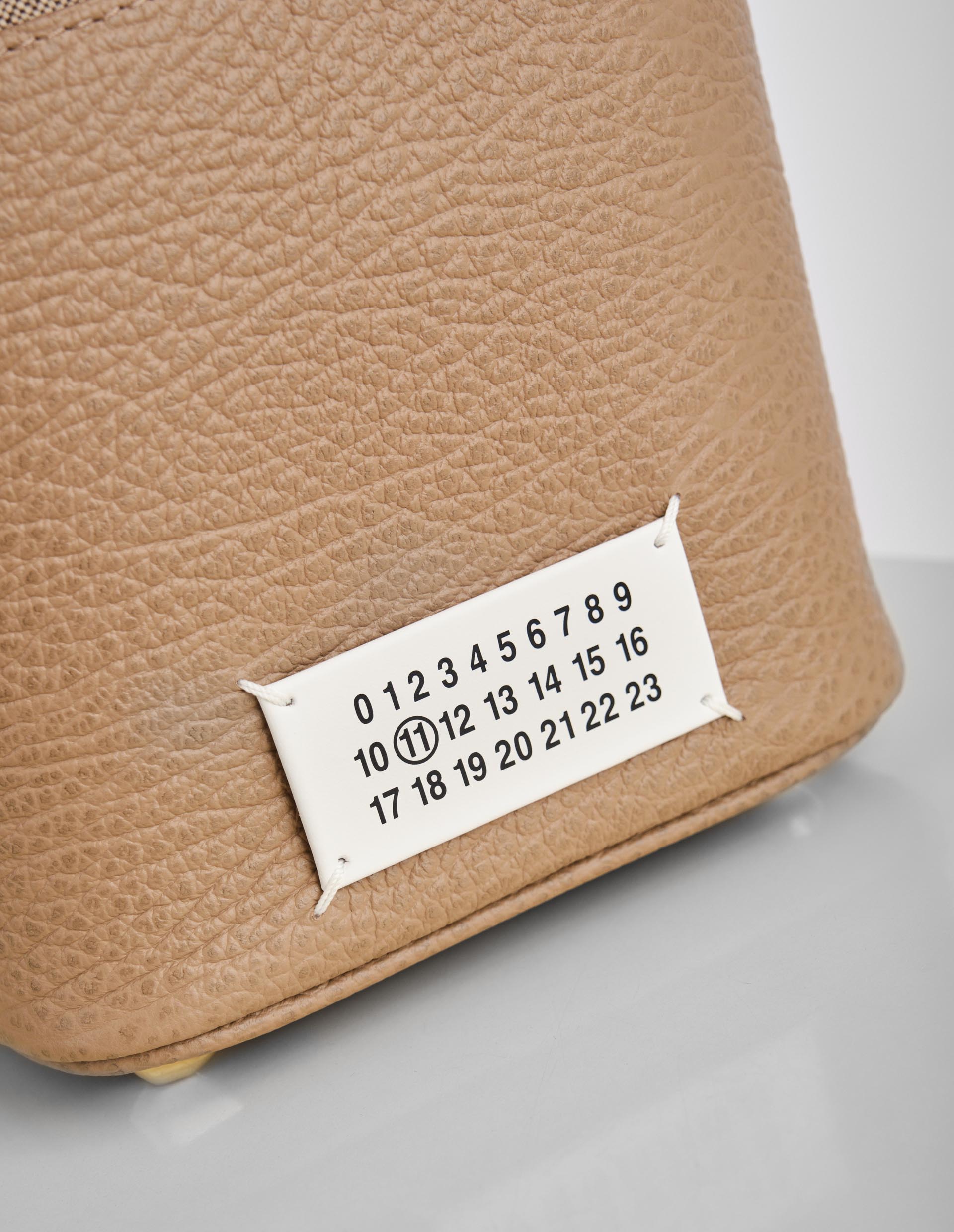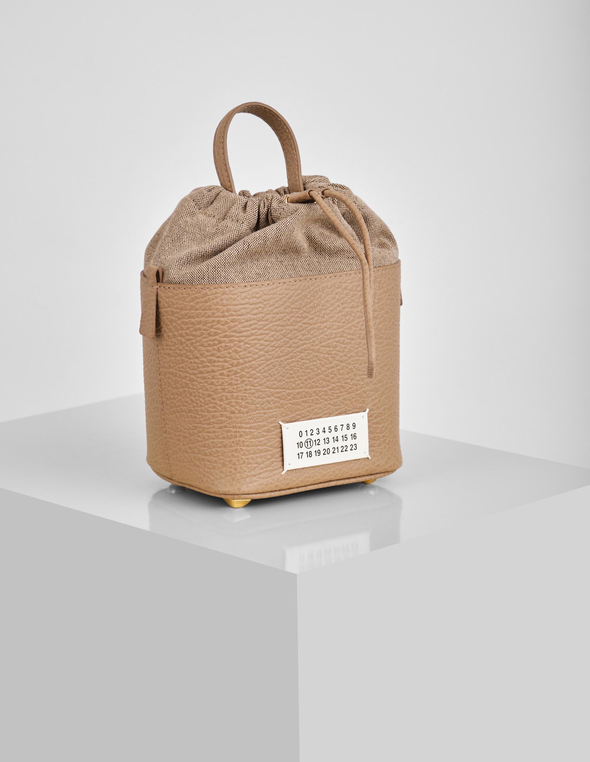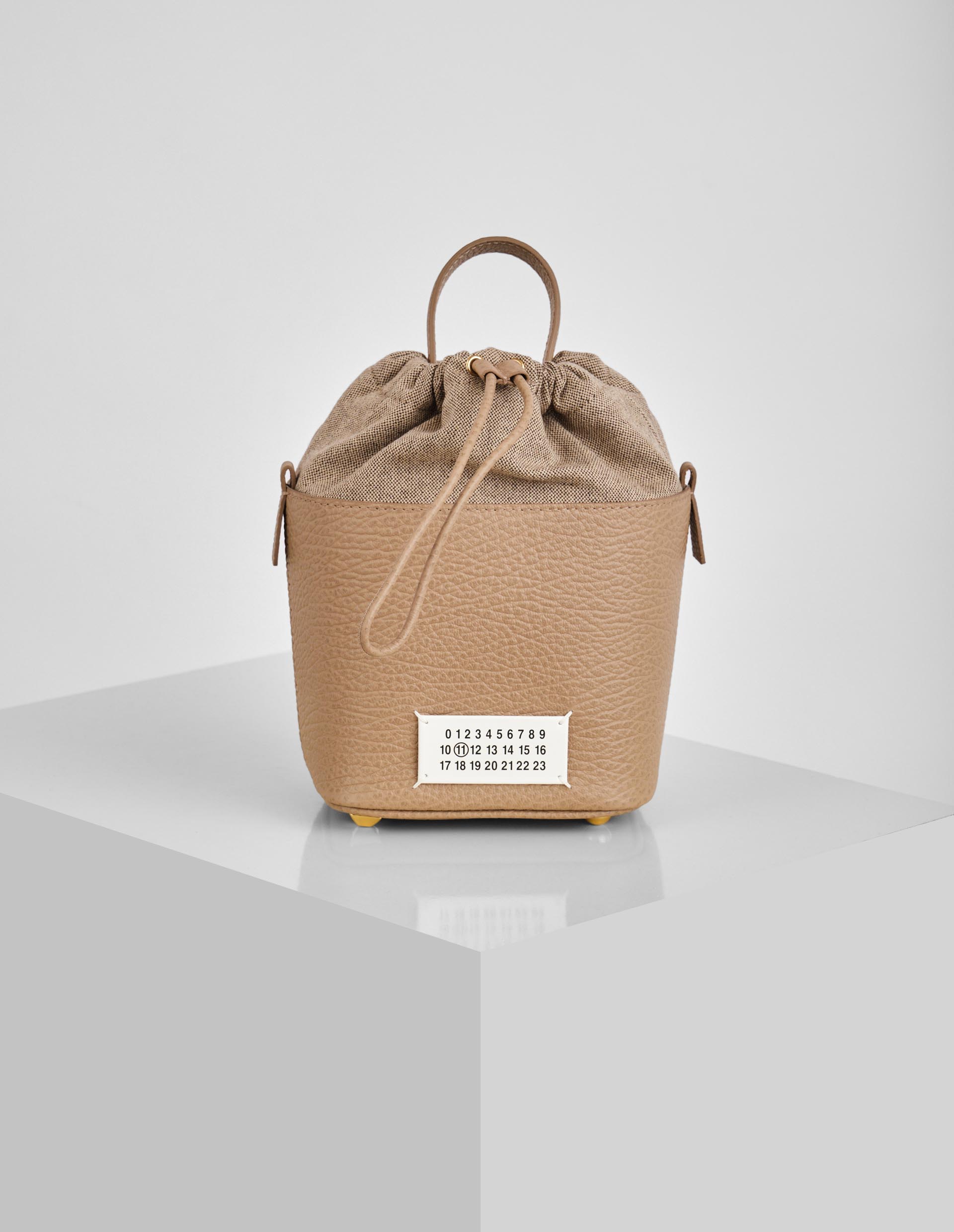 Самобытность такой формы сумки как ведро идеально совпадает с аутентичным характером и бунтарским новаторским духом модного дома Maison Margiela, что и привело к созданию бежевой мини-сумки своеобразной формы. Впечатление от модели усиливается эффектным контрастом материалов: когда тисненая зернистая телячья кожа сочетается с плотной хлопковой парусиной с регулируемой кулиской сверху. Фирменный цифровой логотип отсылает к загадочной анонимной эстетике модного дома. Для дополнительной практичности изделие дополнено короткой кожаной ручкой и длинным ремнем-цепочкой, творящей серебряной фурнитуре и защитными ножками у основания.