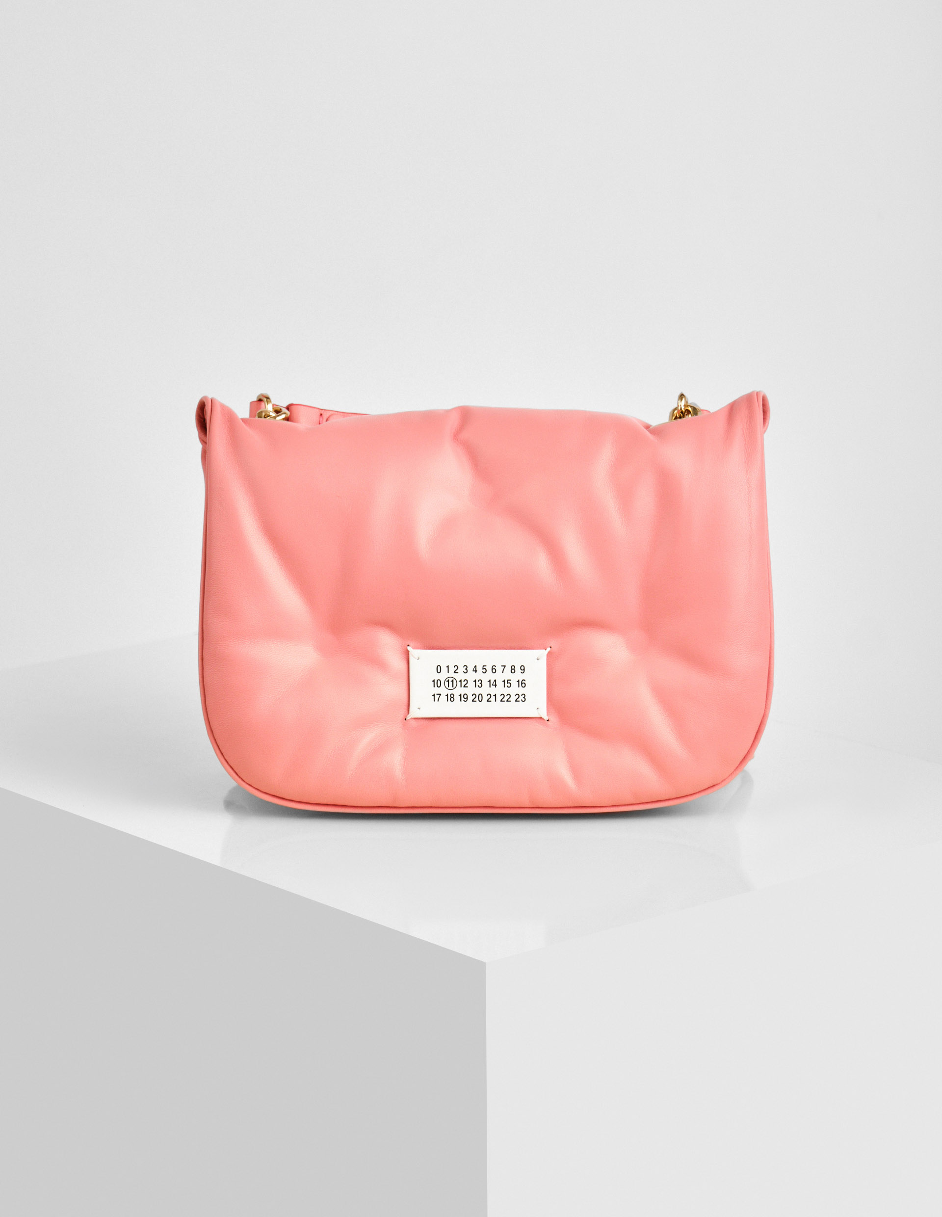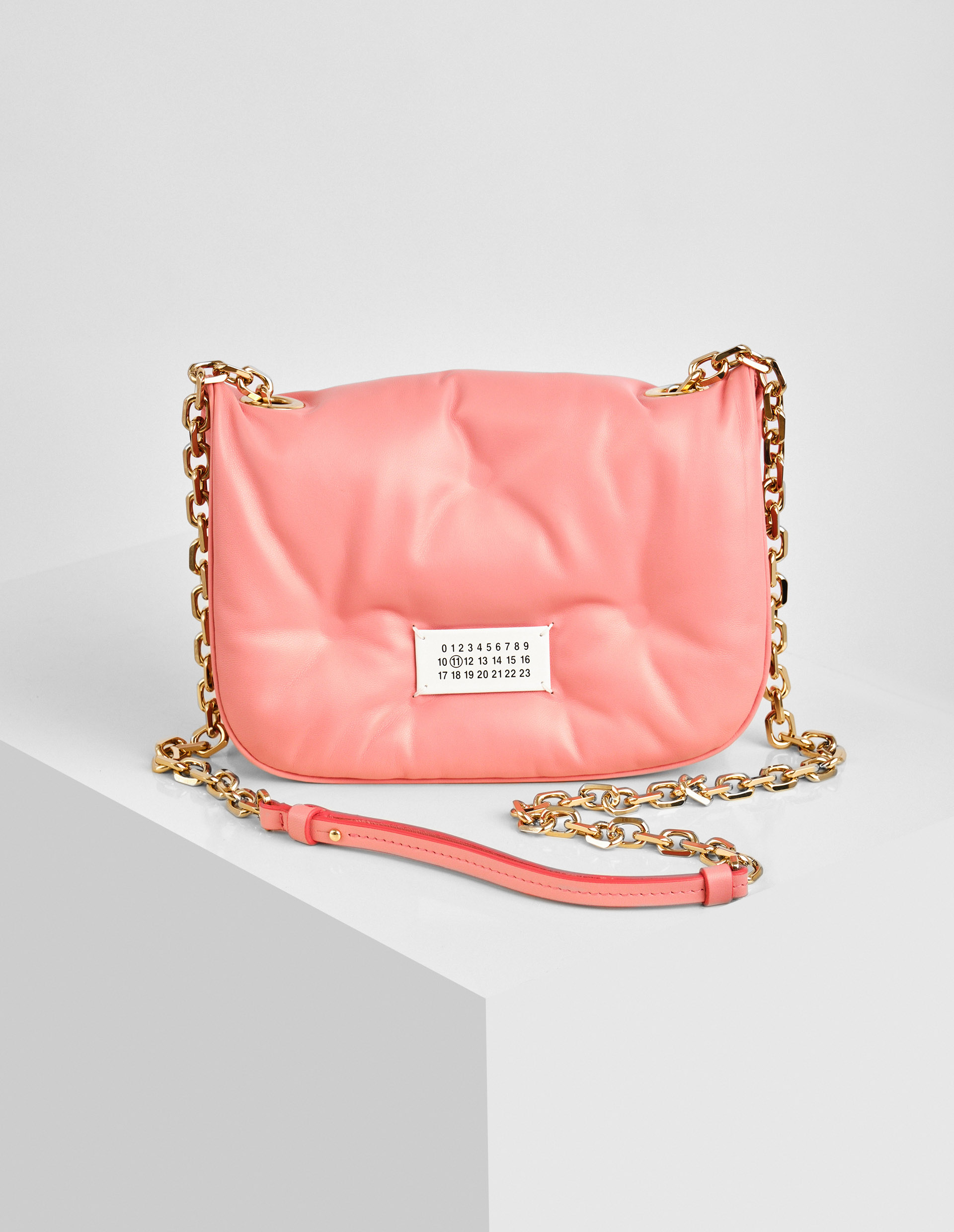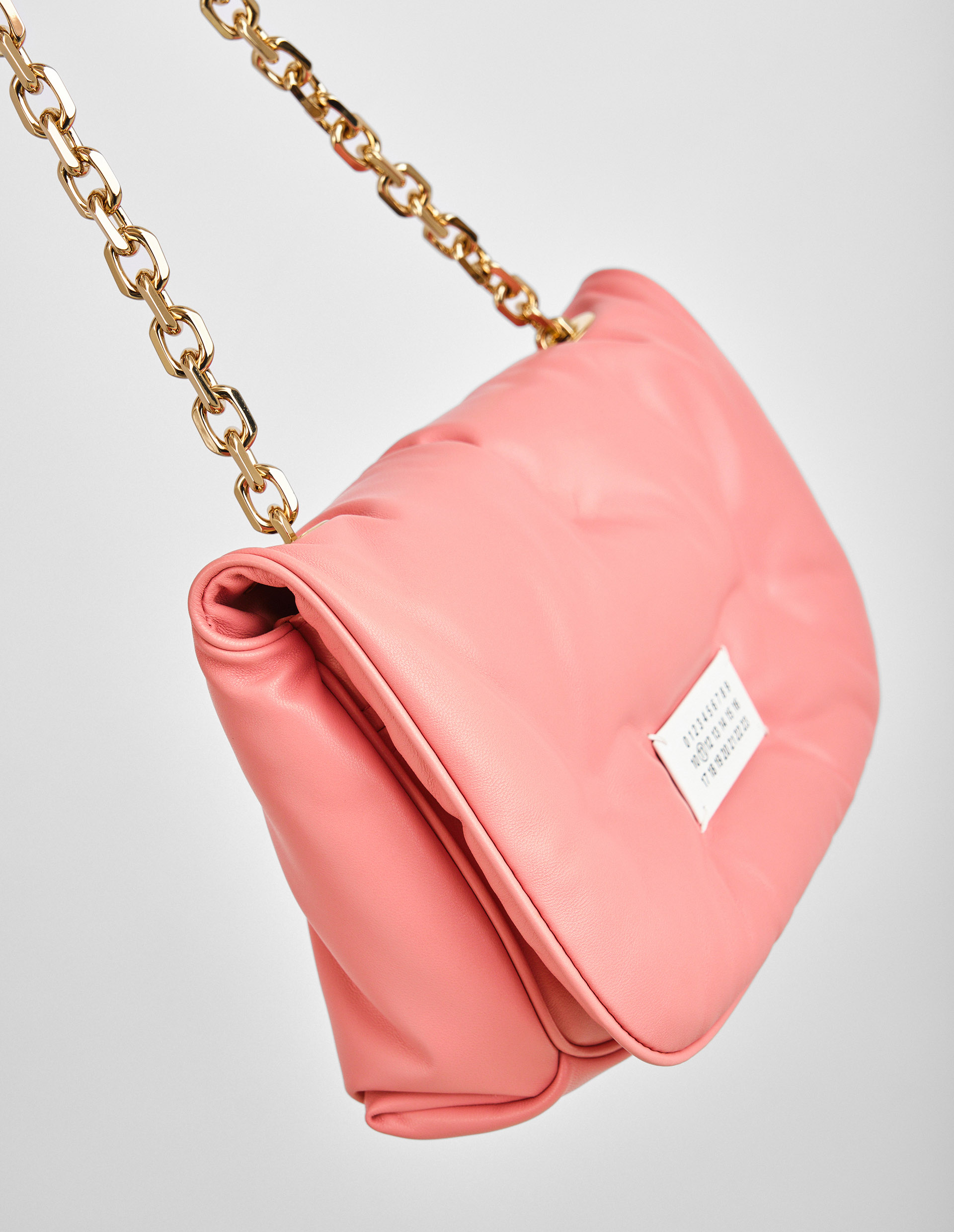Маленькая розовая сумка Glam Slam с клапаном изготовлена из стеганой мягкой кожи наппа. Glam Slam дебютировал на показе весна-лето 2018 и имеет объемный дизайн, имитирующий матлассе – стиль одеял, сшитых вручную, созданных в Марселе, Франция. Эта концепция отражает представление модного дома о бессознательном гламуре и вызывает ассоциации с комфортом, следуя исследованию ритуалов одевания и путешествий по всему миру. Модель дополнена золотой цепочкой на плечо и верхней ручкой, а также биркой с узнаваемым цифровым логотипом спереди.