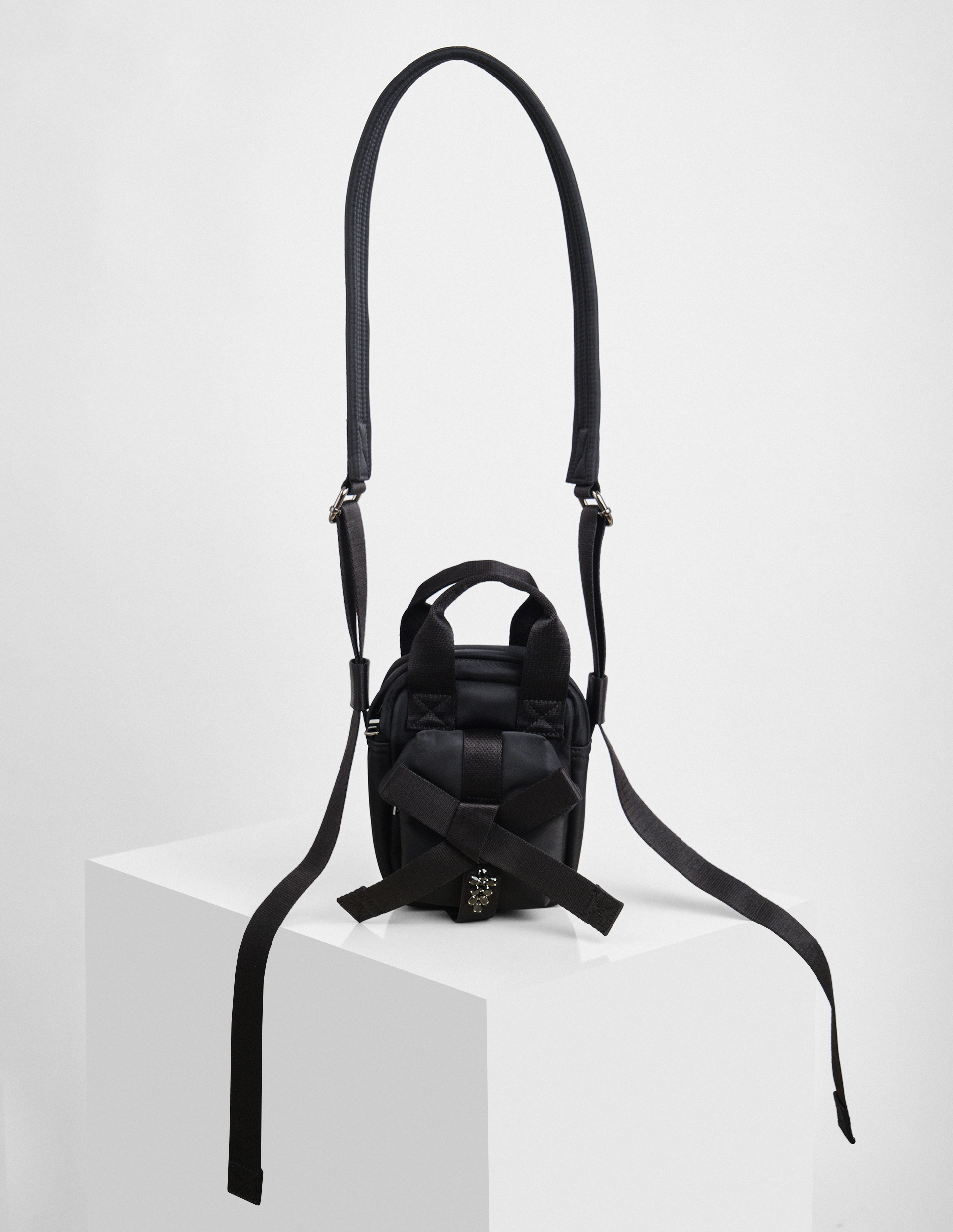 Эта mini camera bag с налетом викторианства, мистицизма и романтики стала творением уникальной и самобытной Симон Роша. Аксессуар изготовлен из технологичного нейлона, имеет основное отделение, внешний карман, украшенный бантом из грогрена, а также две удобные короткие ручки. Эксклюзивным узнаваемым штрихом стал регулируемый ремень cross body, вручную инкрустированный фирменным искусственным жемчугом. Идеальная повседневная сумка, которая притянет взгляды окружающих.