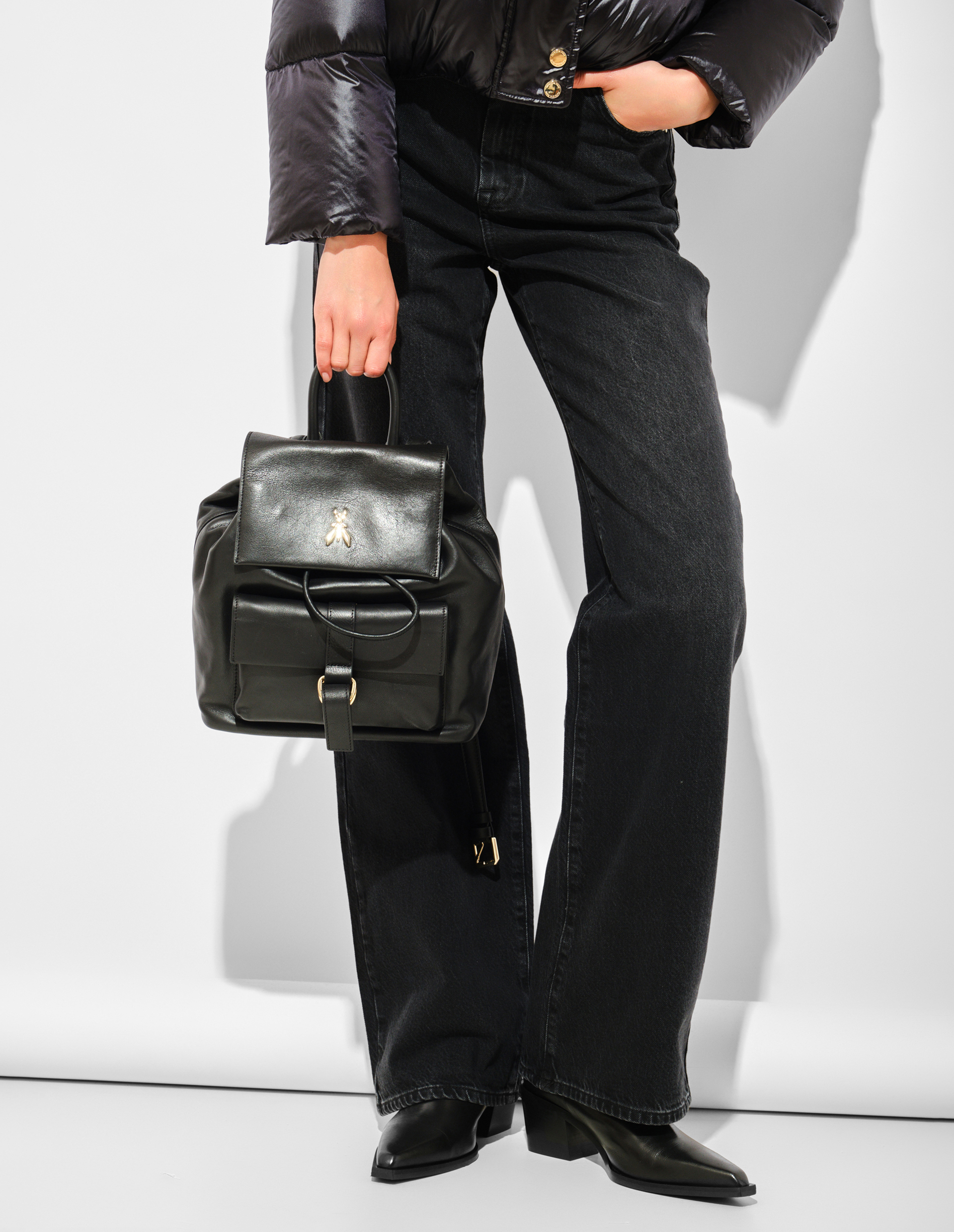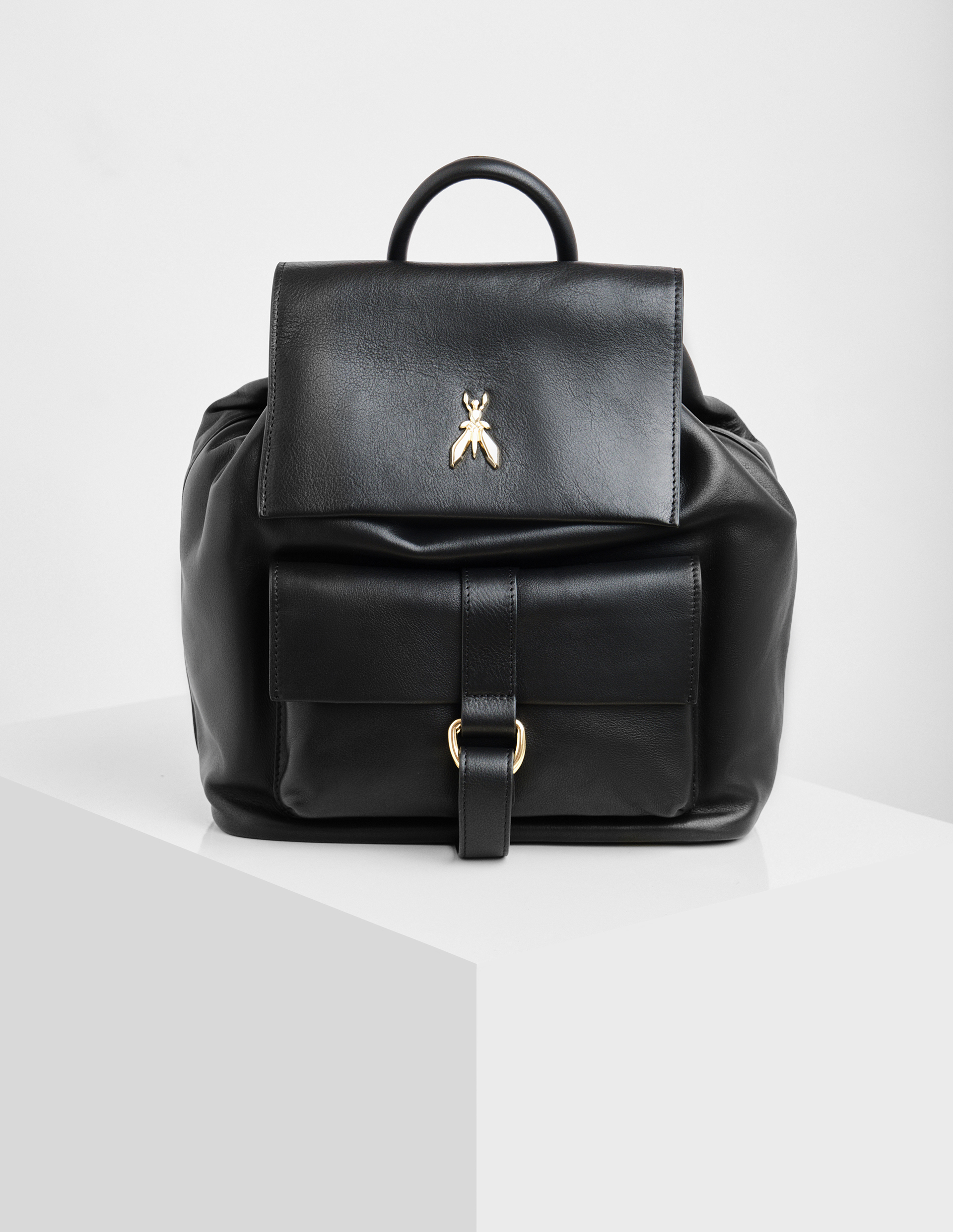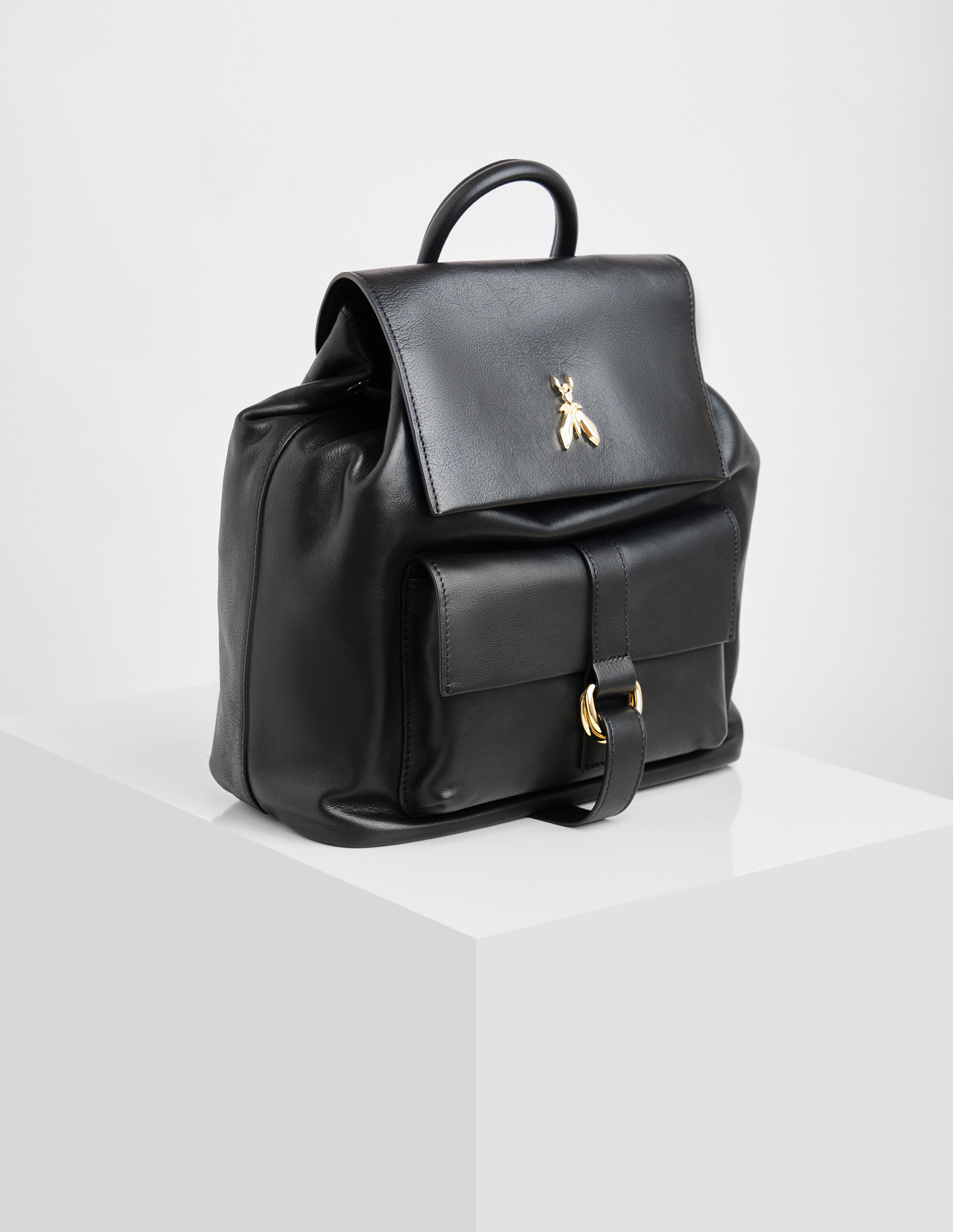 Черный рюкзак New Business от Patrizia Pepe сочетает урбанистический стиль и функциональность. Модель из гладкой телячьей кожи компактного размера (24×30×13 см) украшена металлическим логотипом Fly. Основное отделение закрывается на шнурок с магнитной застежкой, а передний карман с ремешком обеспечивает дополнительное пространство.