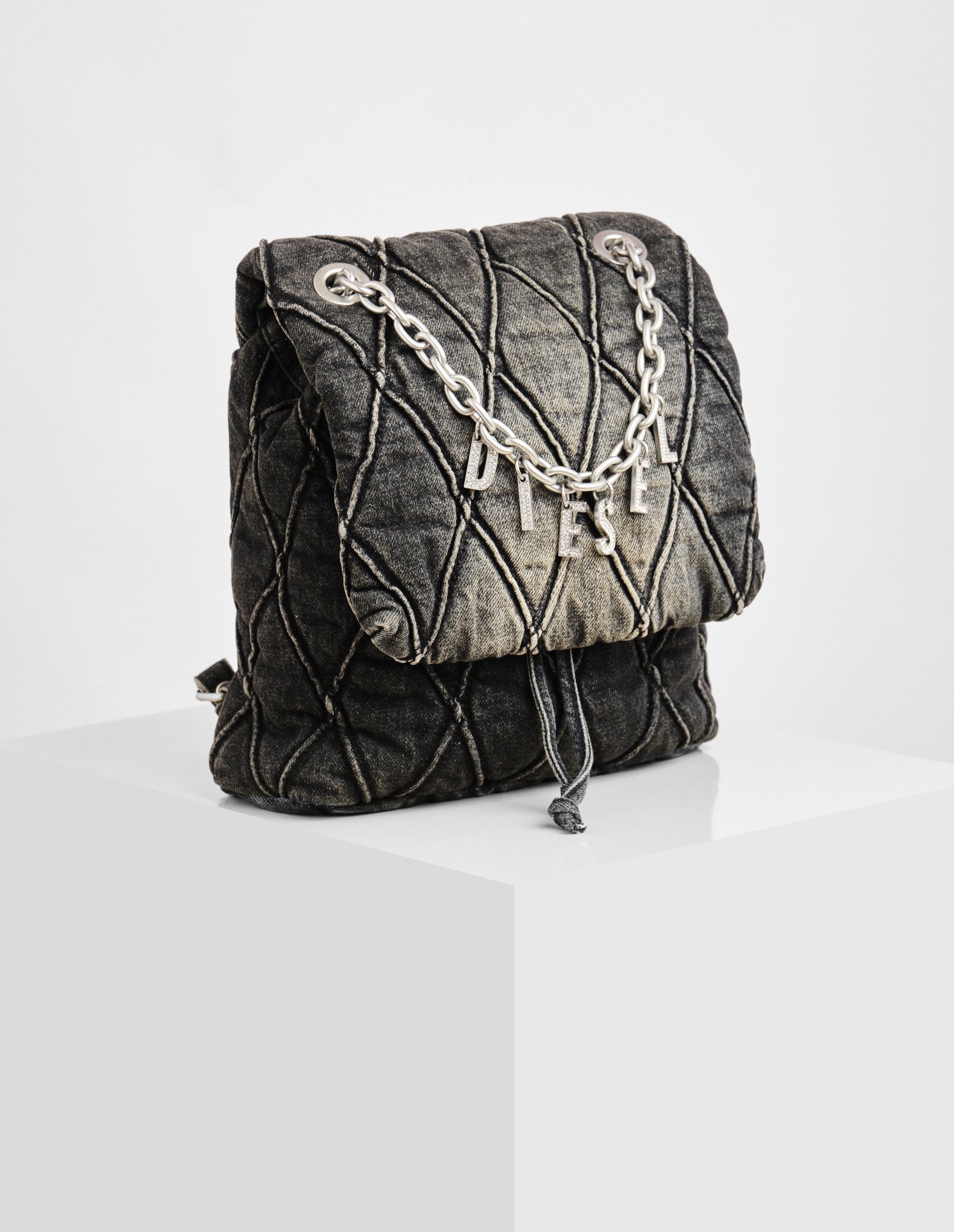 Компактный рюкзак из денима — утилитарный шик с деконструктивным подходом. Простеганный двойным ромбовидным узором «Аргайл», он обработан методом соляризации, создающим эффект хаотичного выцветания, словно память о сотнях уличных приключений. Верхняя часть с магнитным клапаном и шнурком обеспечивает безопасность, а съемная цепочка с шармами-лого в стразы превращается в самостоятельное украшение — типично diesel-ская игра функциональности и бунтарства. Тонкие регулируемые ремни адаптируются под любое движение, а атласная брендированная подкладка добавляет роскошь. Городской хамелеон: деним, металл и намёк на гламур в духе Diesel.