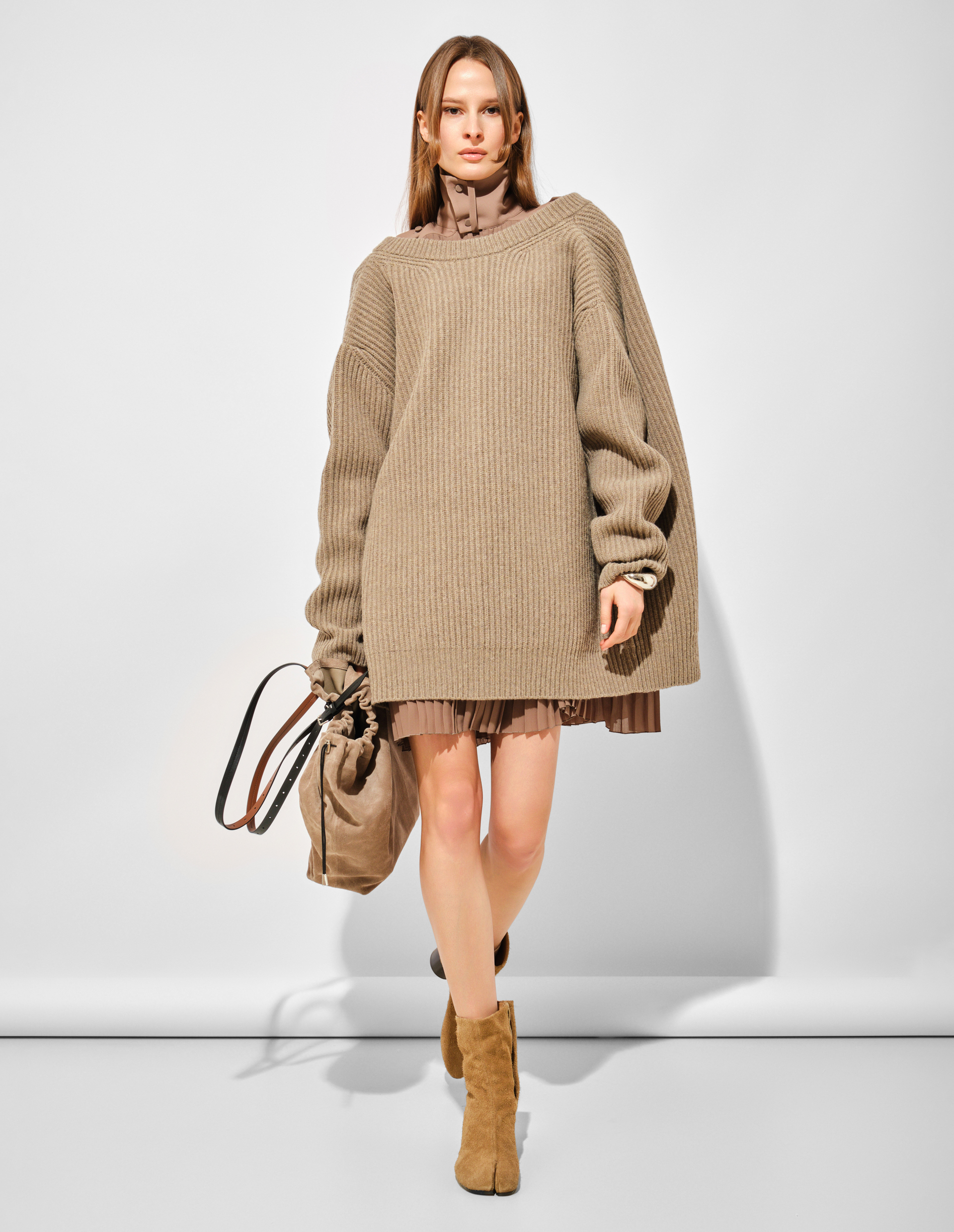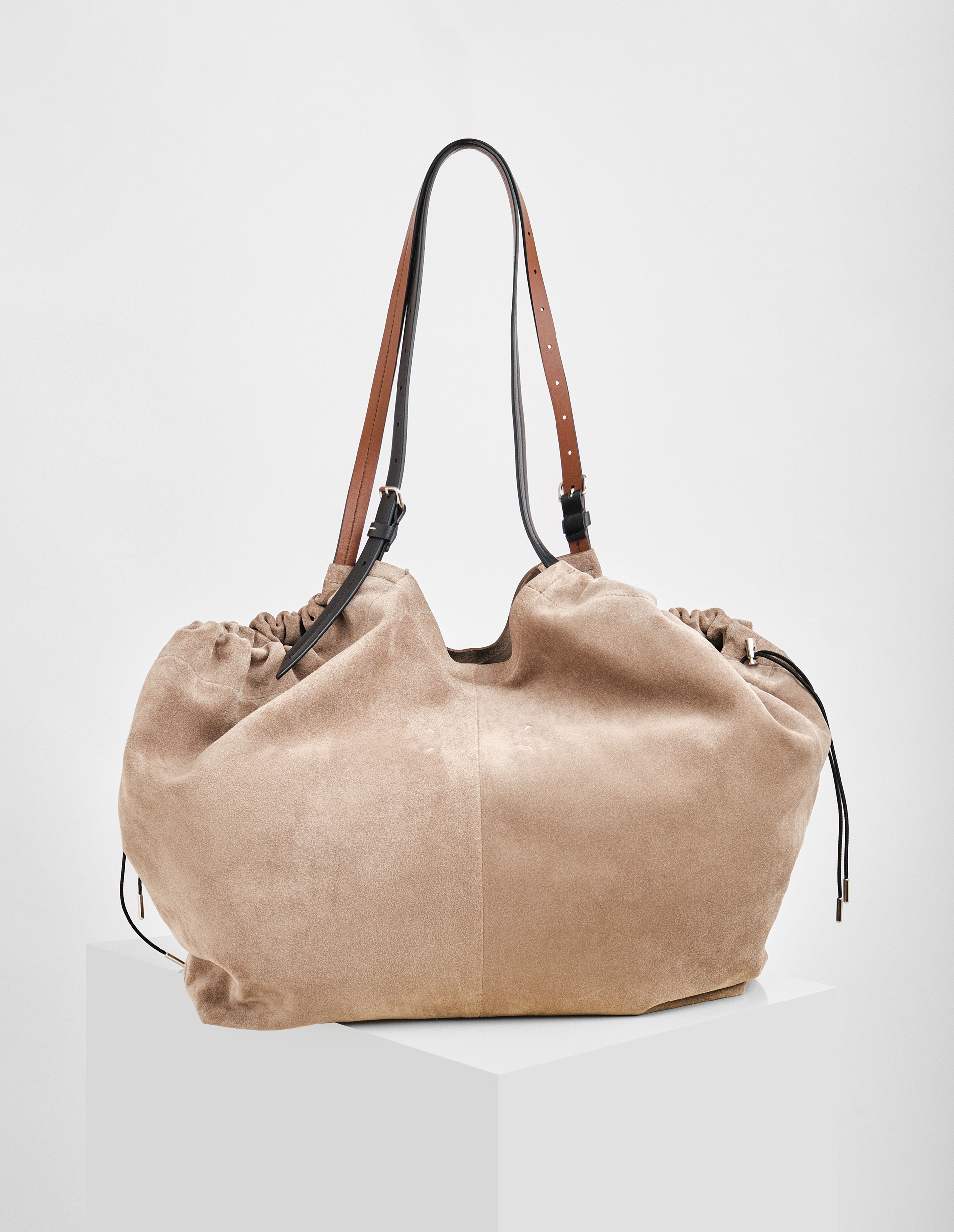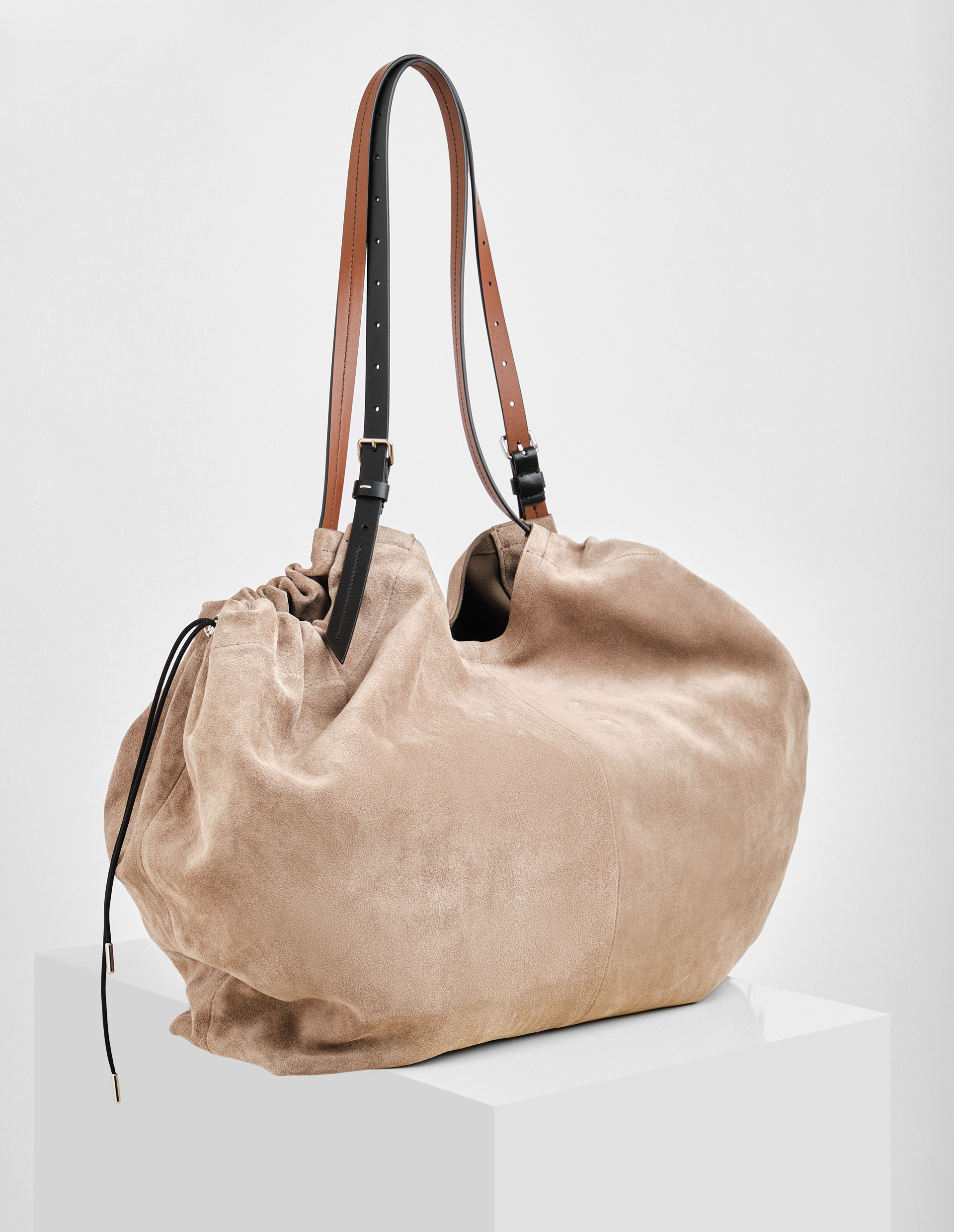 Объёмный шоппер из податливой замши строится на парадоксе, слиянии мощного структурированного силуэта и тактильной пластичности благородного материала. Собранный верх с кулиской смягчает геометрию формы, добавляя ей скульптурной динамики, в то время как ременные ручки из кожи придают утилитарную чёткость и эргономичную уверенность в ношении. Продуманная функциональность раскрывается в съёмном внутреннем pouch для мелочей, делая эту сумку идеальным инструментом для города. На лицевой стороне — фирменные четыре стежка, анонимная подпись Дома, которая заменяет громкий логотип безусловным авторитетом дизайна.