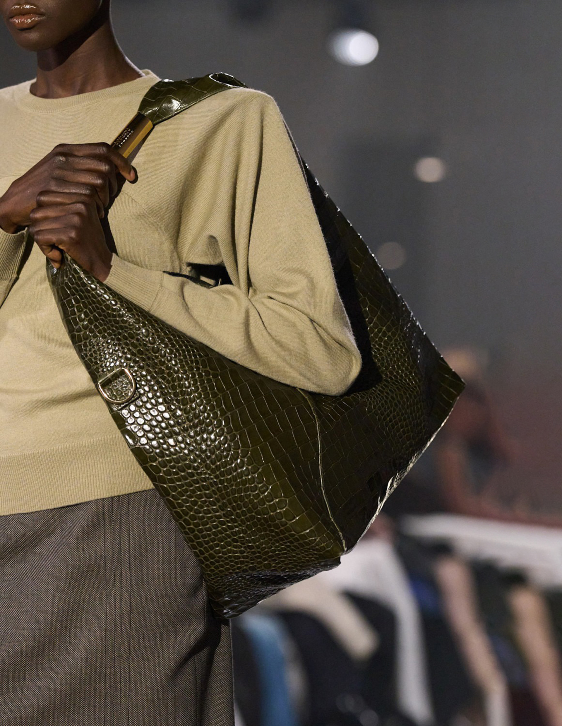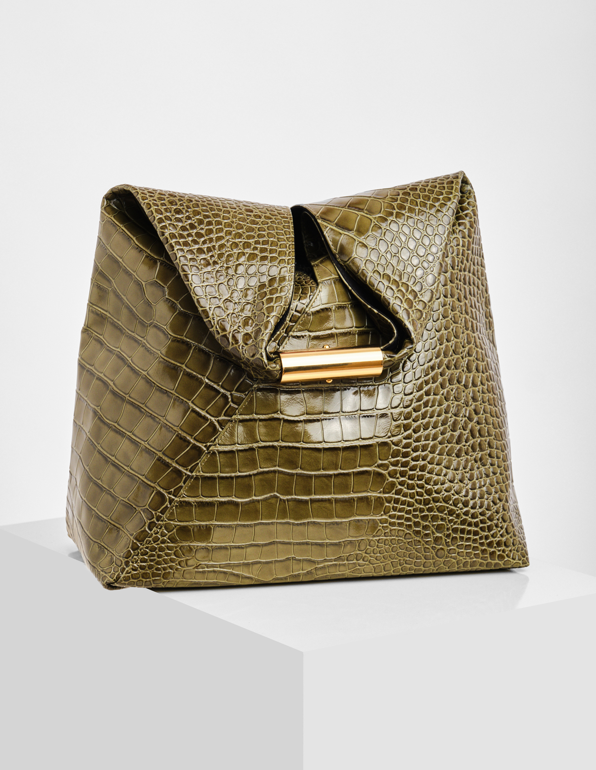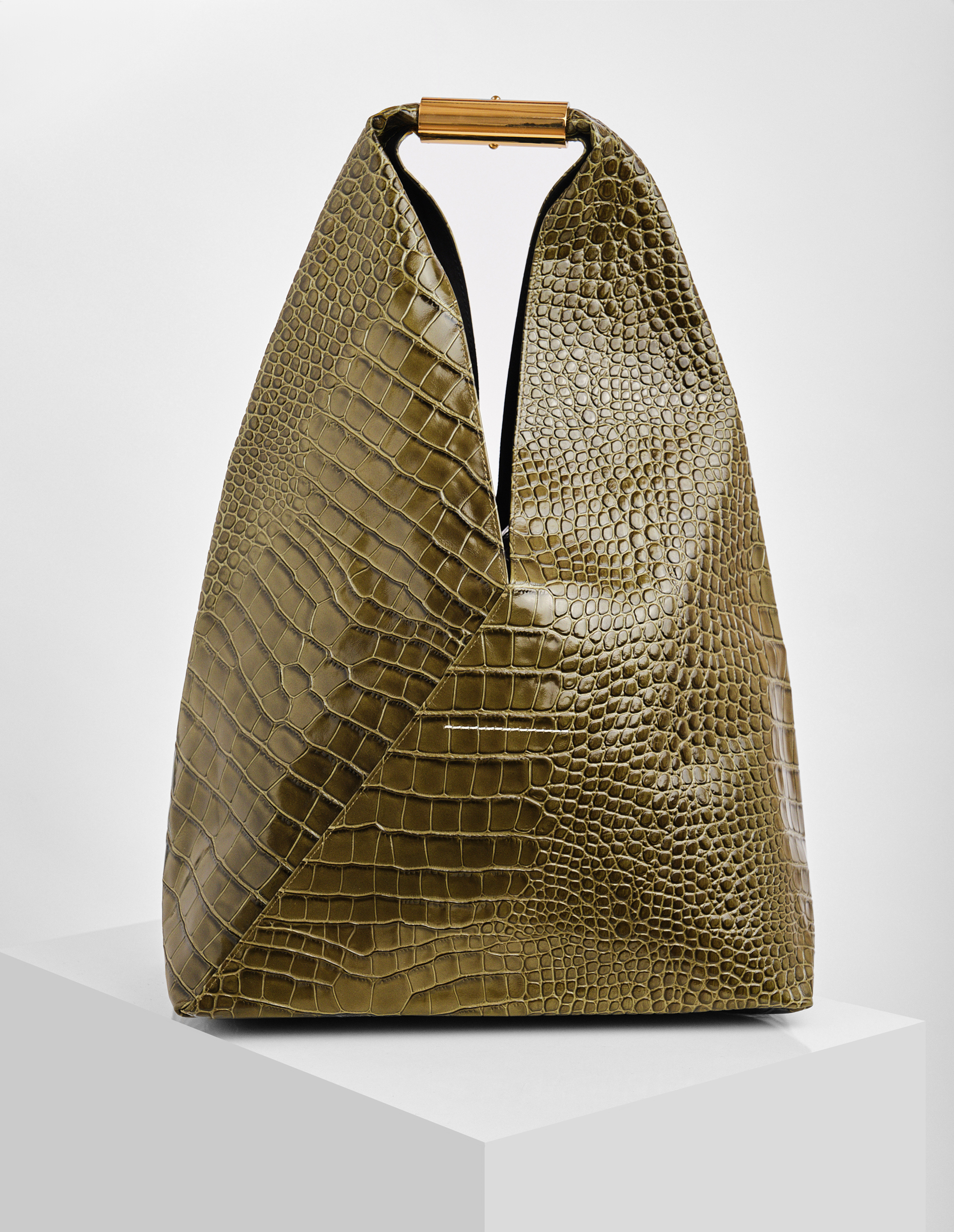 Модель «Japanese Bag» выполнена из зелёной кожи с глубоким, чётким тиснением под крокодила, придающим её поверхности драматичный, тактильный рельеф. Однако этот эффект романтичной дикой роскоши уравновешен безупречной, почти архитектурной простотой силуэта: строгими линиями, широким устойчивым дном и лаконичными ручками. В этом контрасте — вся суть объекта: мощная, первобытная текстура заключена в рамки минималистичного, созерцательного дизайна, создавая ощущение спокойной, но абсолютной силы.