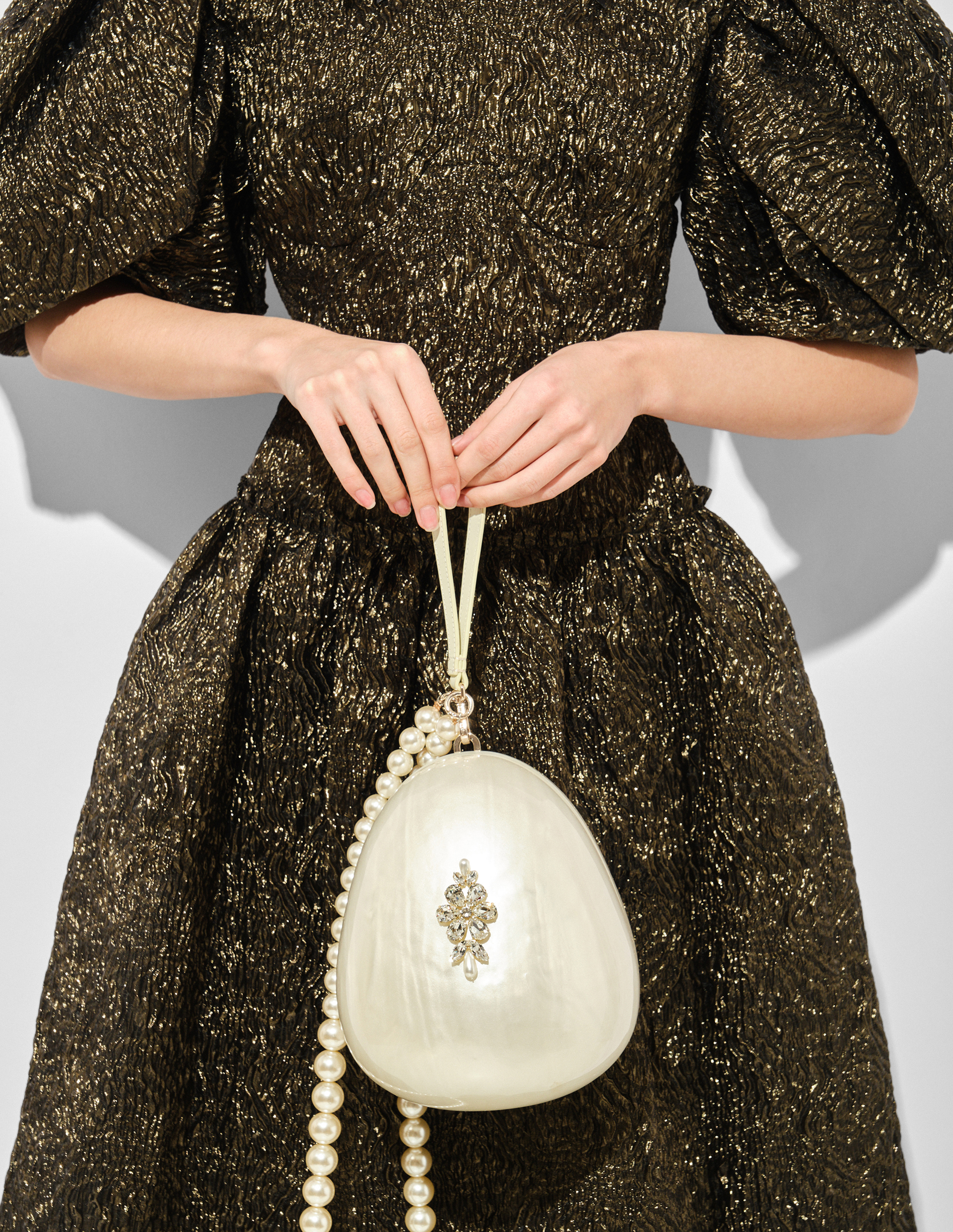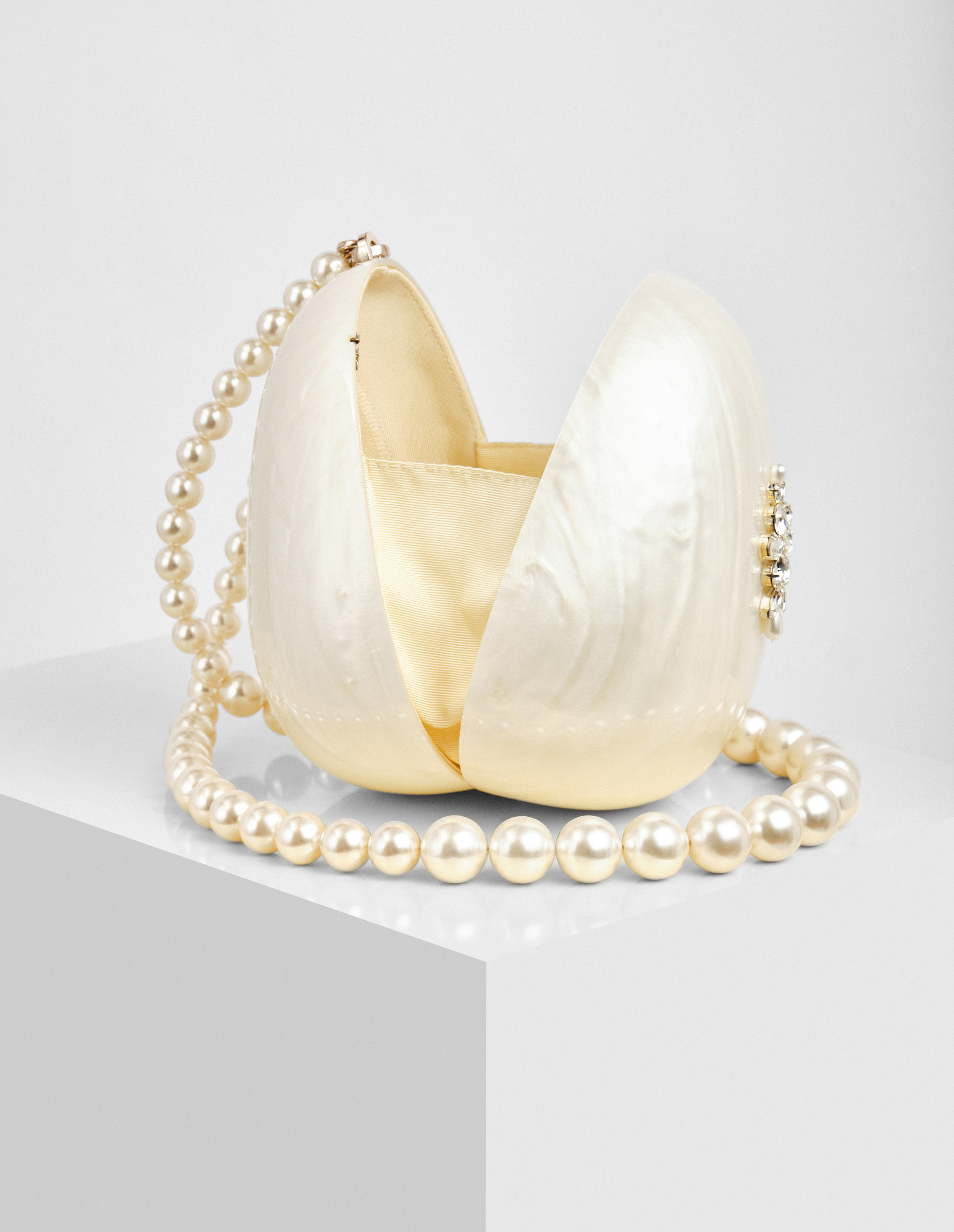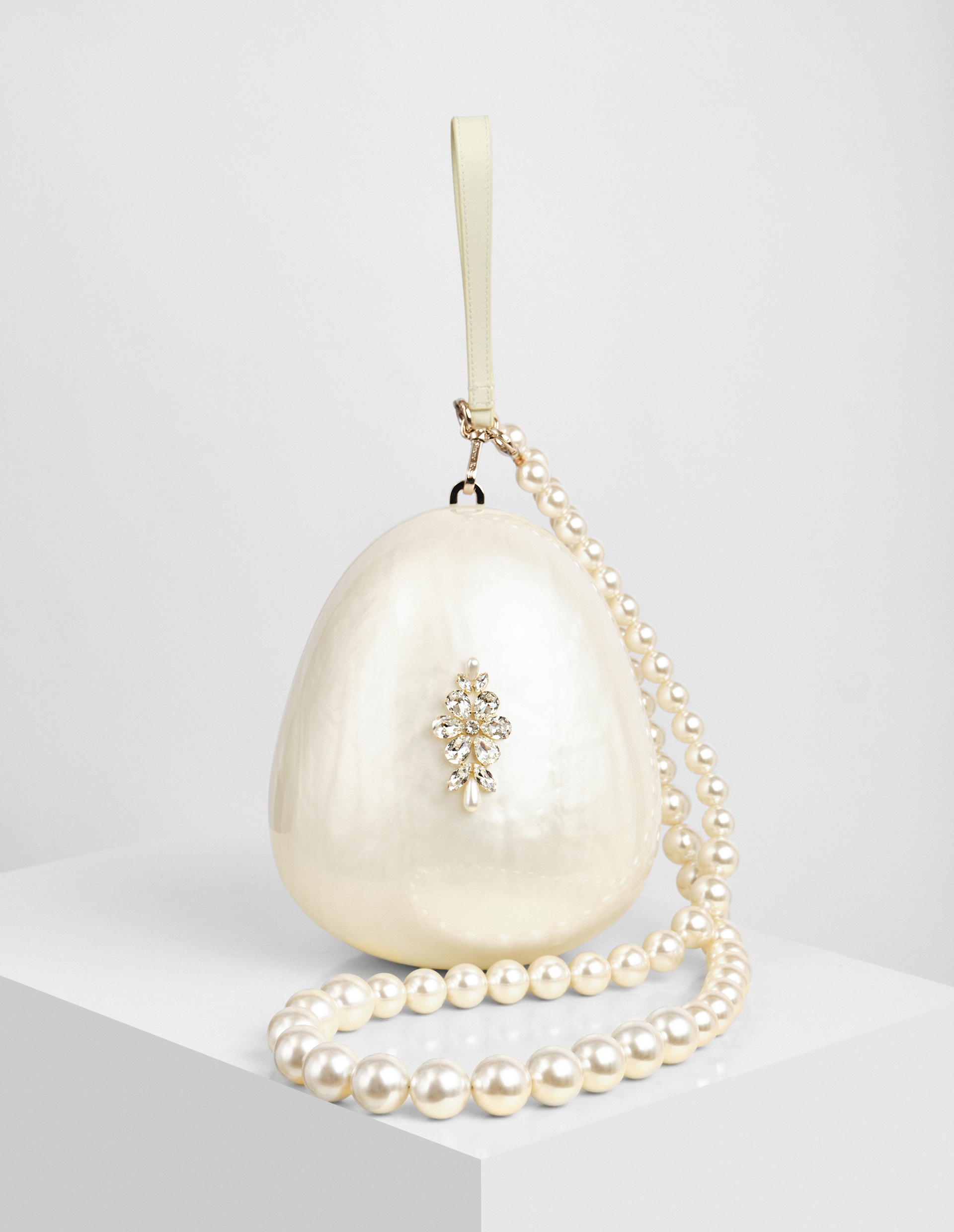 Фантастическая, культовая, уникальная...Сумка Simone Rocha из подиумной коллекции является предметом, стоящим в модном списке желаний на первом месте. Неповторимая Симона Роша произвела революцию в мире моды на жемчуг, создав этот аксессуар, вдохновленный формой яйца, из органического стекла от бренда PLEXIGLAS®, добавив ему перламутровый блеск, а декором послужил искусственно выращенный жемчуг. Его мастера бренда нанесли вручную, подчеркнув качество и безупречно выполненную работу. Практичными элементами стали короткий кожаный ремешок для ношения на запястье и удлиненная ручка из бусин-жемчужин с тисненым лого на креплениях. О внимании к деталям говорит подкладка в тон, выполненная из гладкой вискозы и шелка. Эта сумка обязательно покорит ваше сердце, привлечет внимание на любом мероприятии, и вам вообще не придется беспокоиться о том, что вы встретите похожую модель! Дома EGG BAG также проявит свою актуальность, ведь ее можно использовать как шкатулку для хранения ваших любимых вещиц.