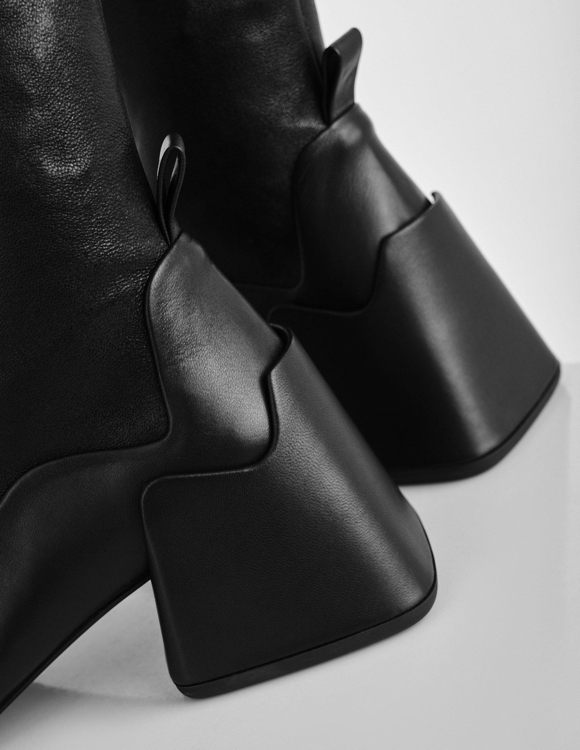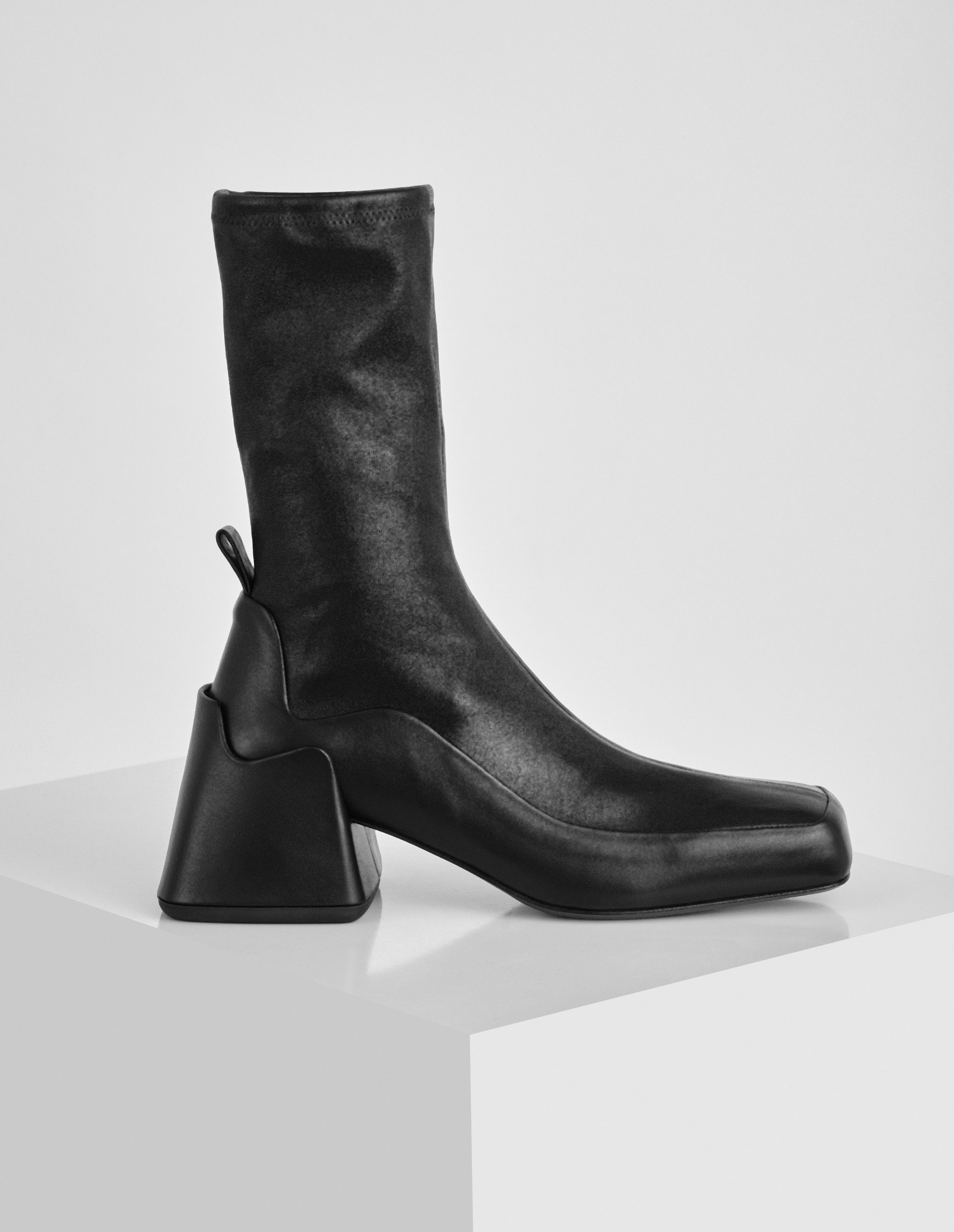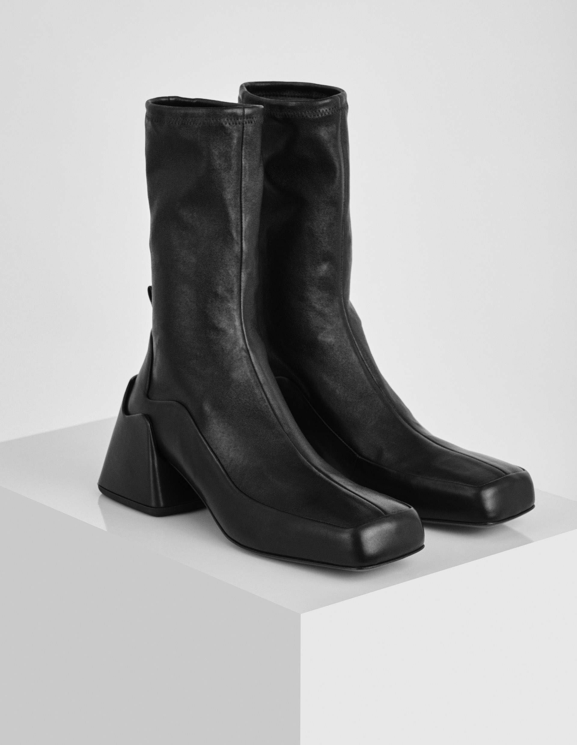 Культовый бренд Jil Sander строго следует проверенной классике, но придает ей более современную адаптацию. Например, визуально вытянутый эффект от ботильонов бренда подчеркнули удлиненным голенищем в виде чулка, а также фигурным квадратным носком.Такой прием создает слегка футуристическое настроение модели, которому вторит фигурный блочный каблук. Чтобы не отвлекать от замысловатого многослойного дизайна, минималистичную пару из гладкой телячьей кожи выполнили в глубоком черном оттенке.