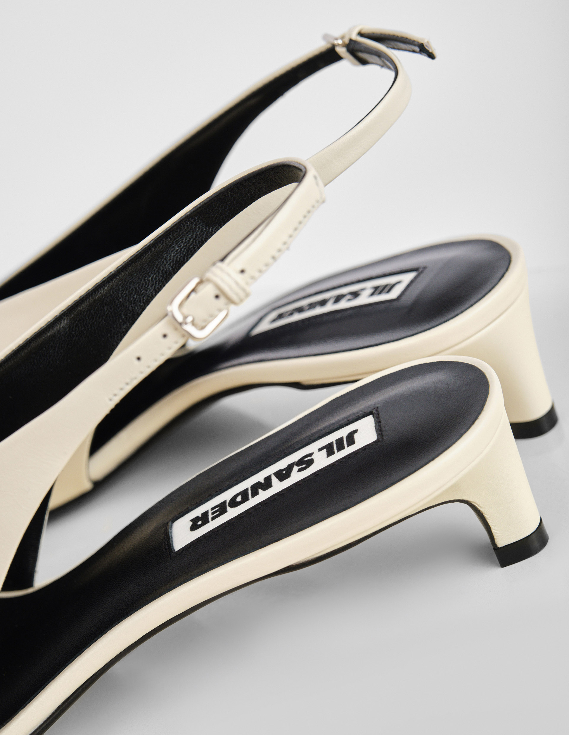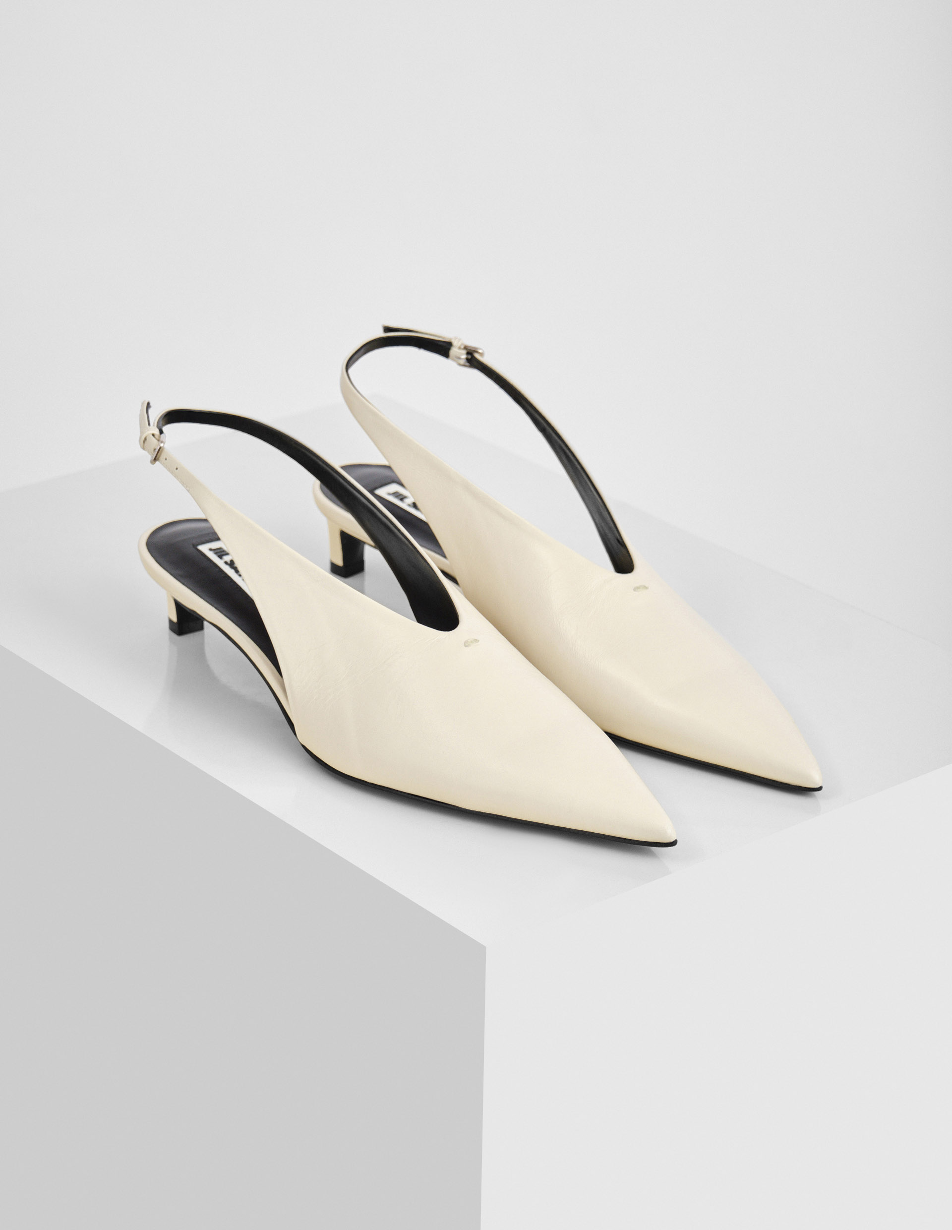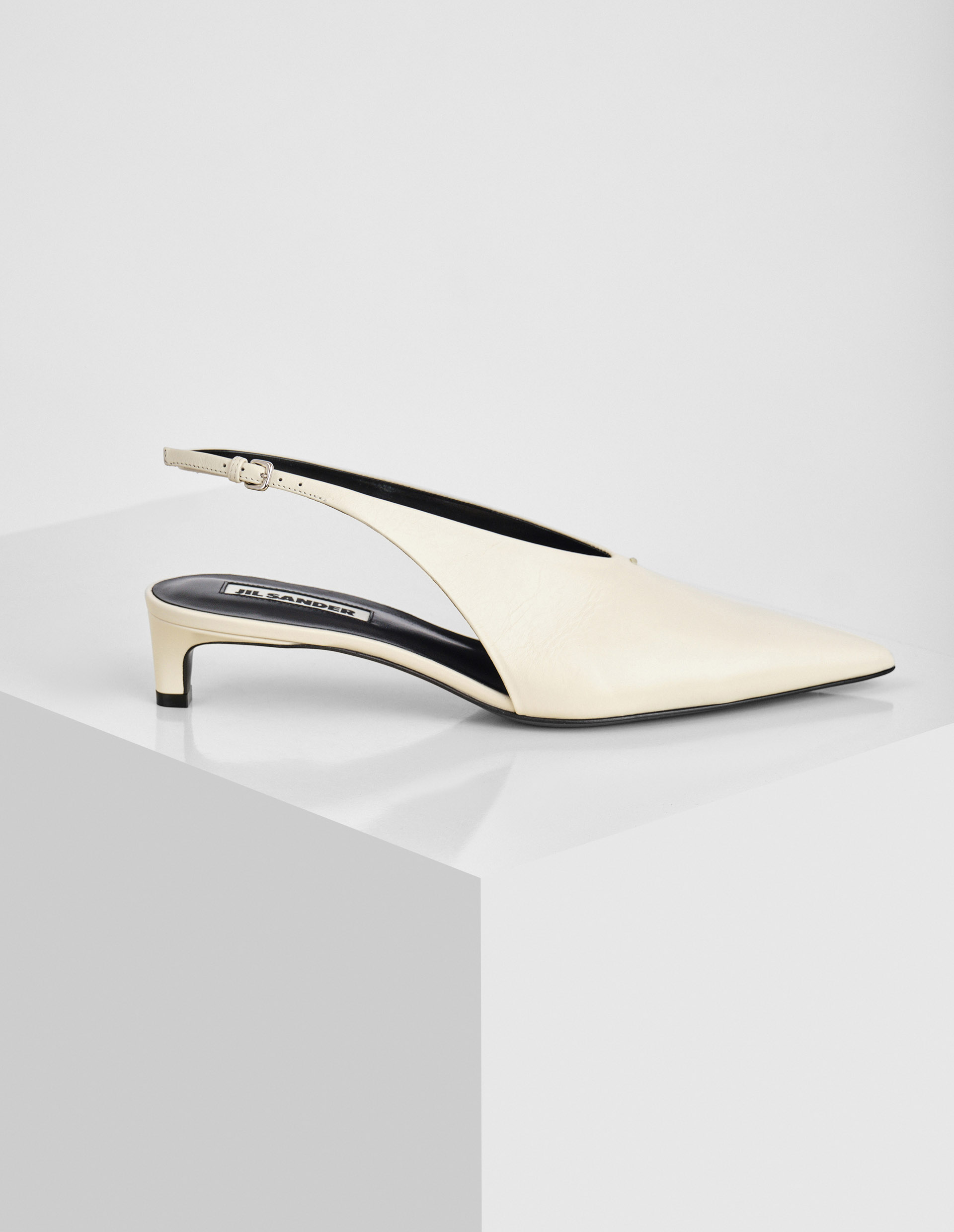 При создании туфель молочного оттенка от культового бренда Jil Sander фокус с классических и лаконичных форм был смещен в сторону остромодного заостренного мыса. Нивелировать острый носок помогает открытая пятка, которая эффектно дополняется небольшим каблуком kitten heel. Для пошива стильной модели использовали мягкую матовую кожу. Узкий ремешок на щиколотке фиксируется миниатюрной пряжкой.