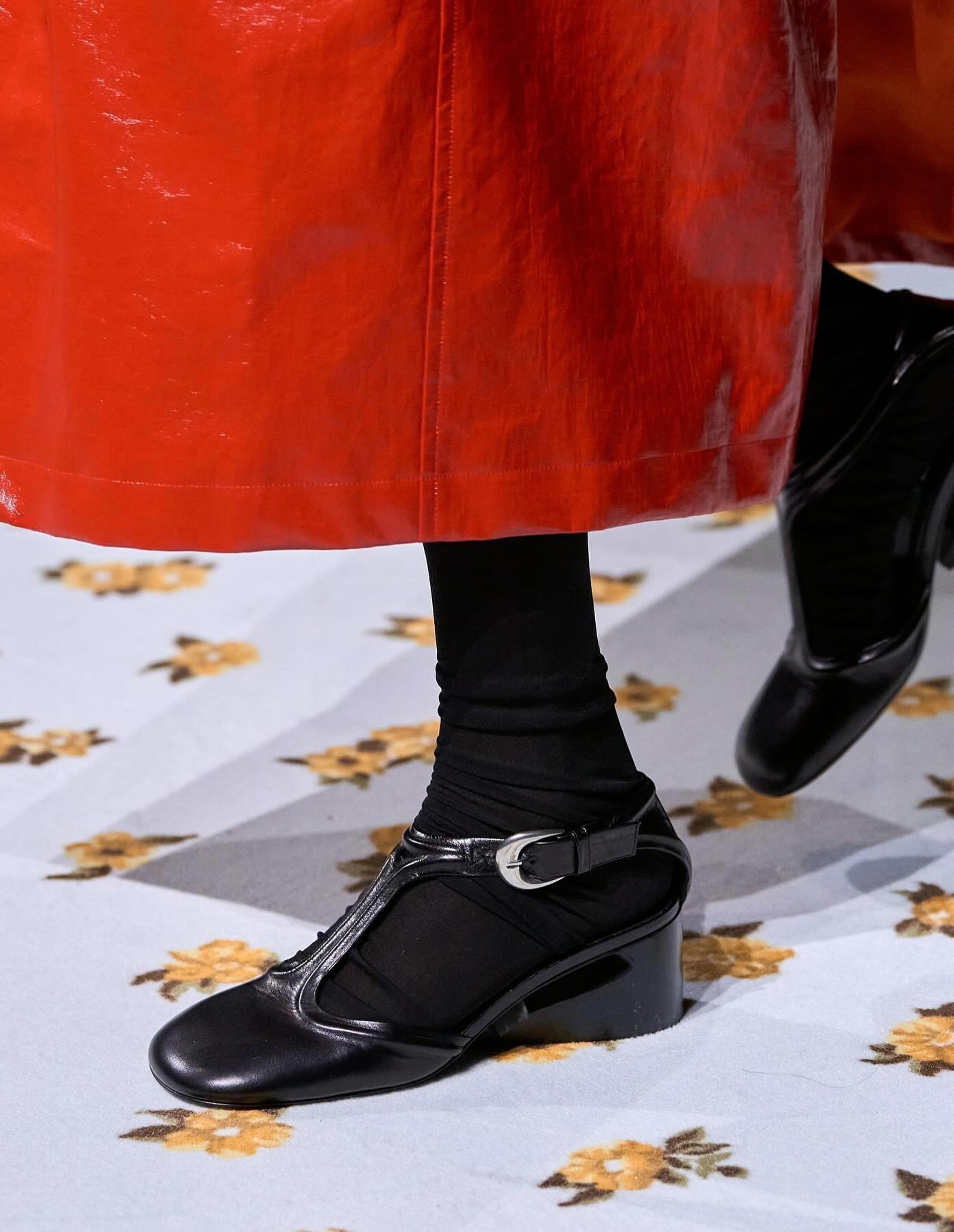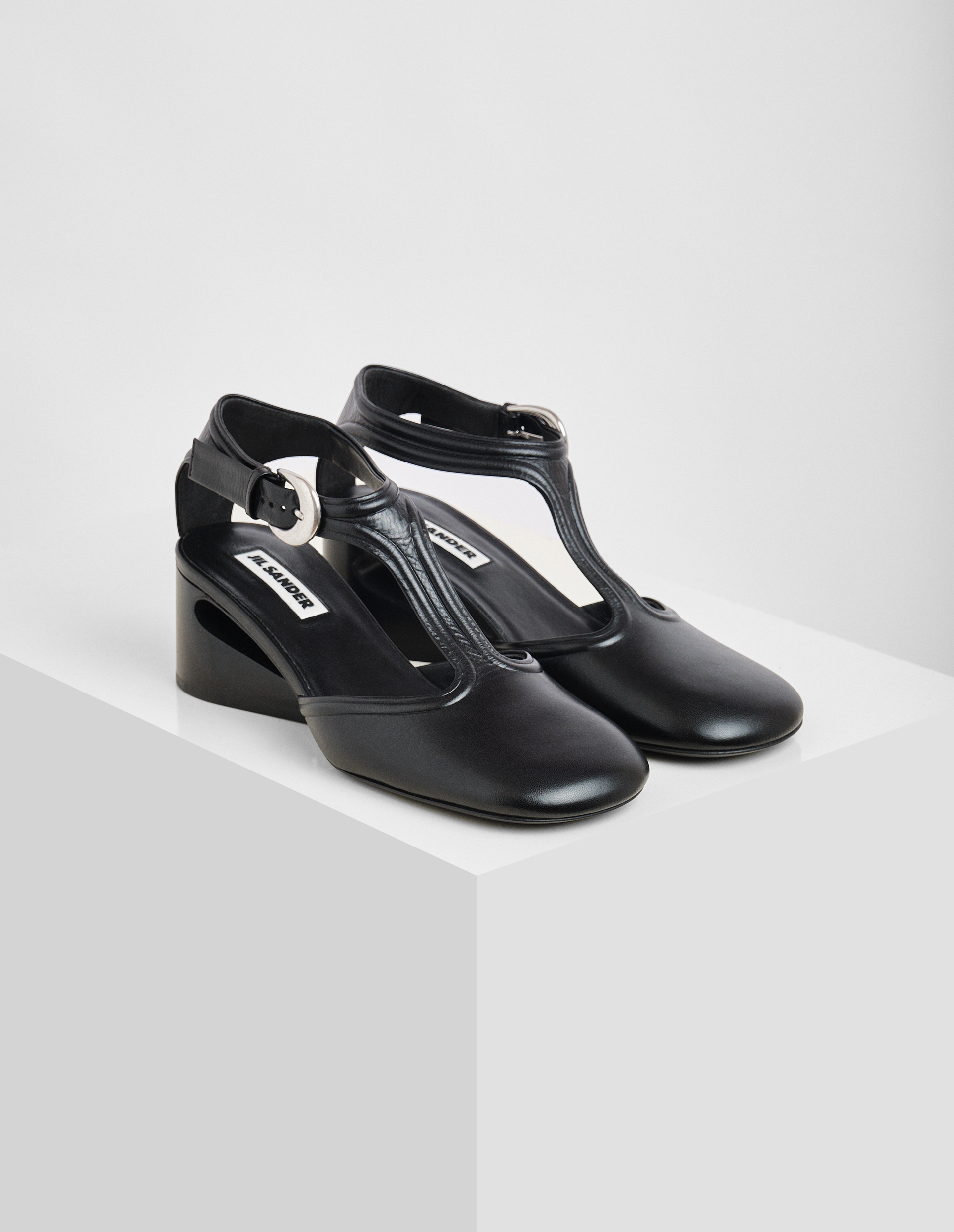 Шикарные туфли Mary Jane от Jil Sander — это классический силуэт в современной интерпретации. Круглый мыс и Т-образный ремешок создают узнаваемый образ, а платформа-каблук с вырезом cut-out придают им смелый, но сдержанный характер. Аккуратный кант по контуру не только добавляет завершенность дизайну, но и усиливает прочность конструкции. Регулируемый ремешок на щиколотке с металлической пряжкой обеспечивает идеальную посадку, в то время как подошва из телячьей наппа с резиновым покрытием делает шаг устойчивым и бесшумным, сохраняя легкость. Модель выполнена из новой козьей кожи Tripon, отличающейся мягкостью, устойчивостью к деформациям и благородной матовой фактурой, а черный цвет и лаконичные линии превращают эти туфли в универсальную, вневременную пару.