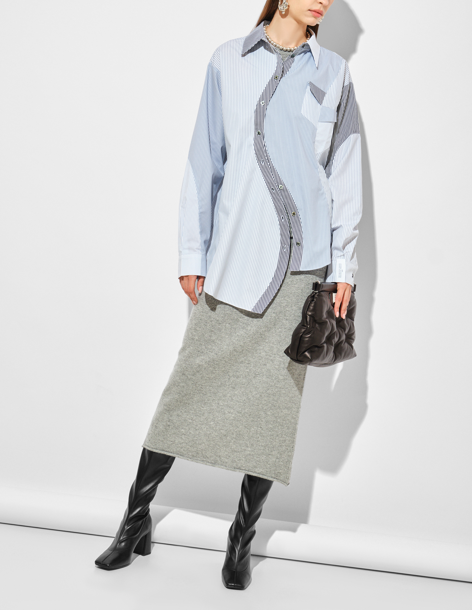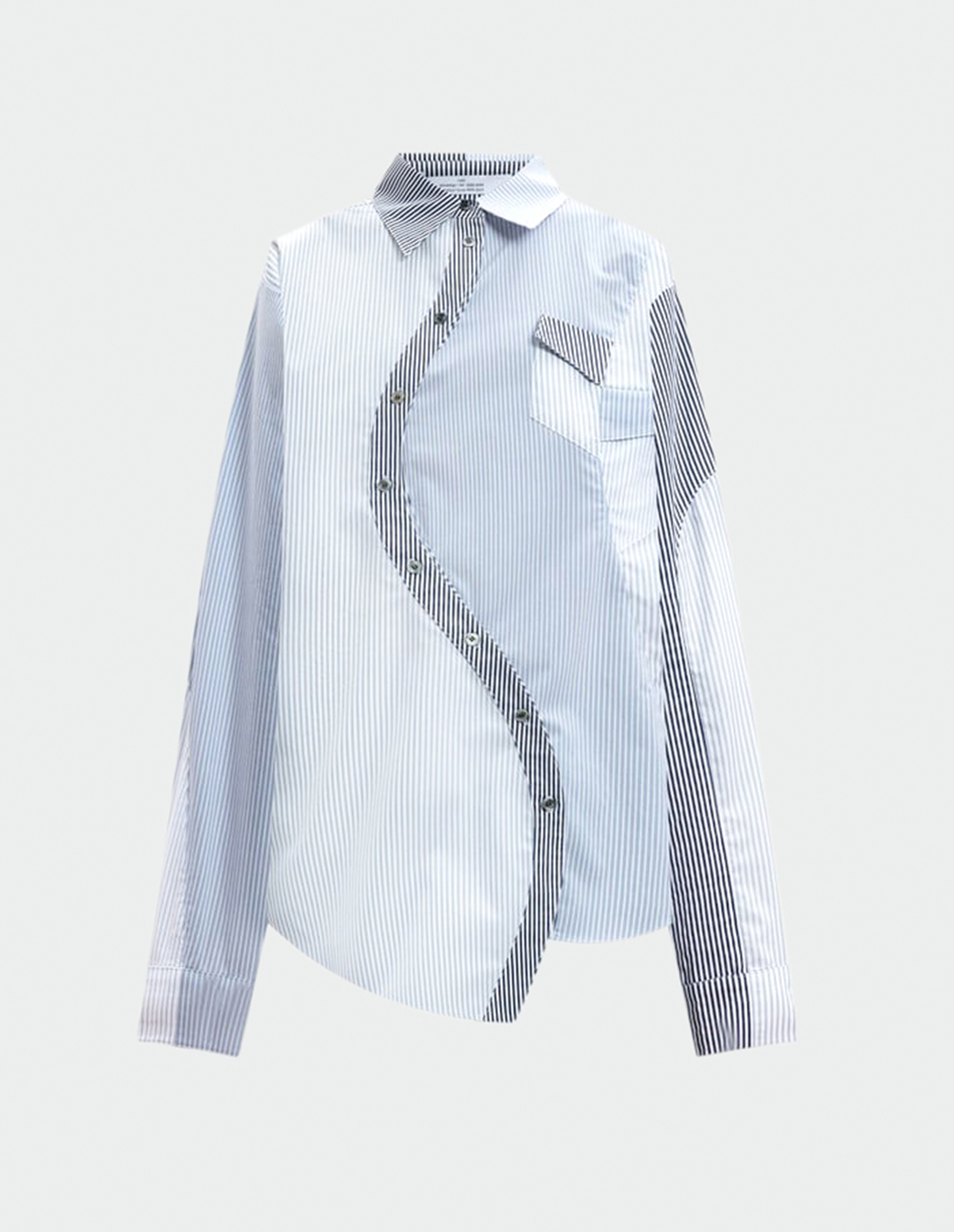 Если вы, как и Рок Хван, — основатель инновационного бренда ROKH — немного не согласны с офисными правилами и хотите усложнить идею корпоративного дресс-кода, присмотритесь к этой роскошной рубашке. Сам дизайнер назвал ее ‘Office Essentials’, глядя на классическую вещь через собственную призму реконструкции. Так появилась асимметрия: в принте GREY MULTI STRIPED, в соединении тканевых панелей, в самом крое. Вершиной авангардной задумки стала изогнутая пуговичная планка, словно желание встроить в модель косой, немного галлюцинированный дизайн. Он вполне может быть одним из маркеров нашего странного, неупорядоченного времени.