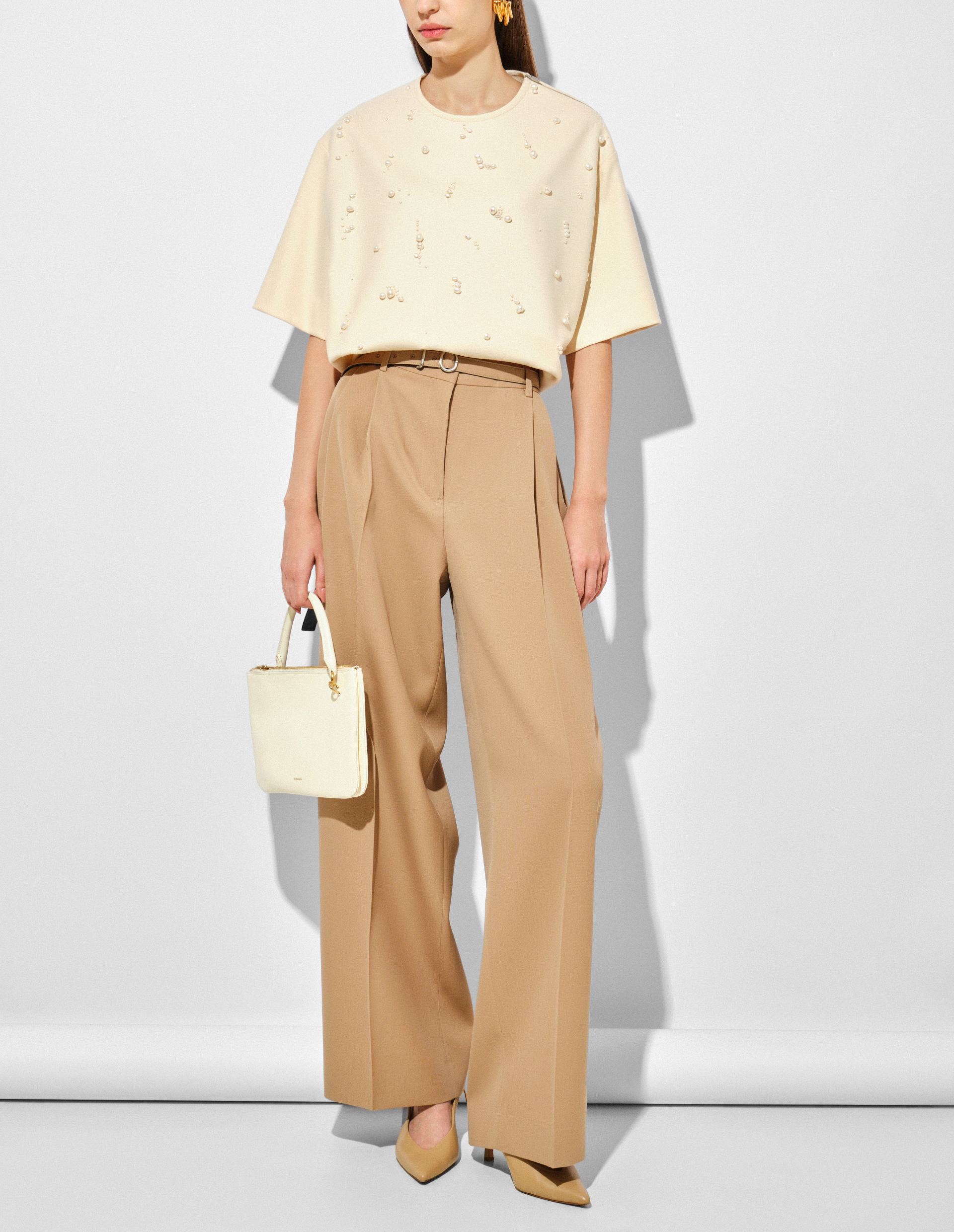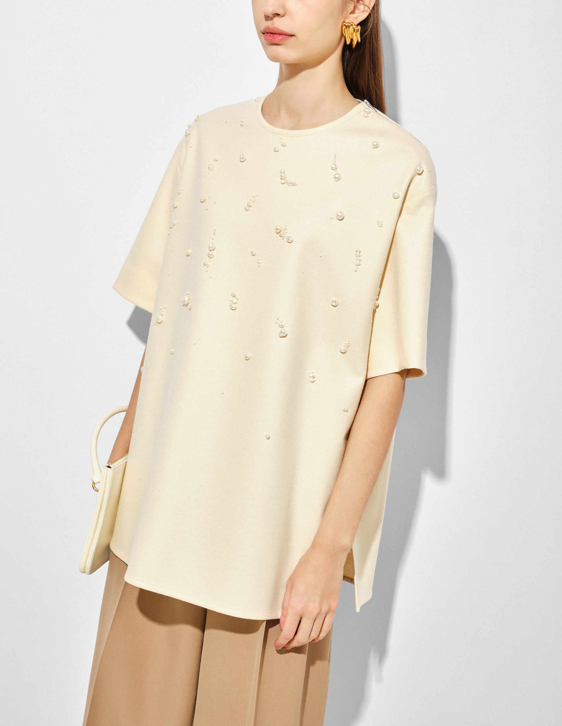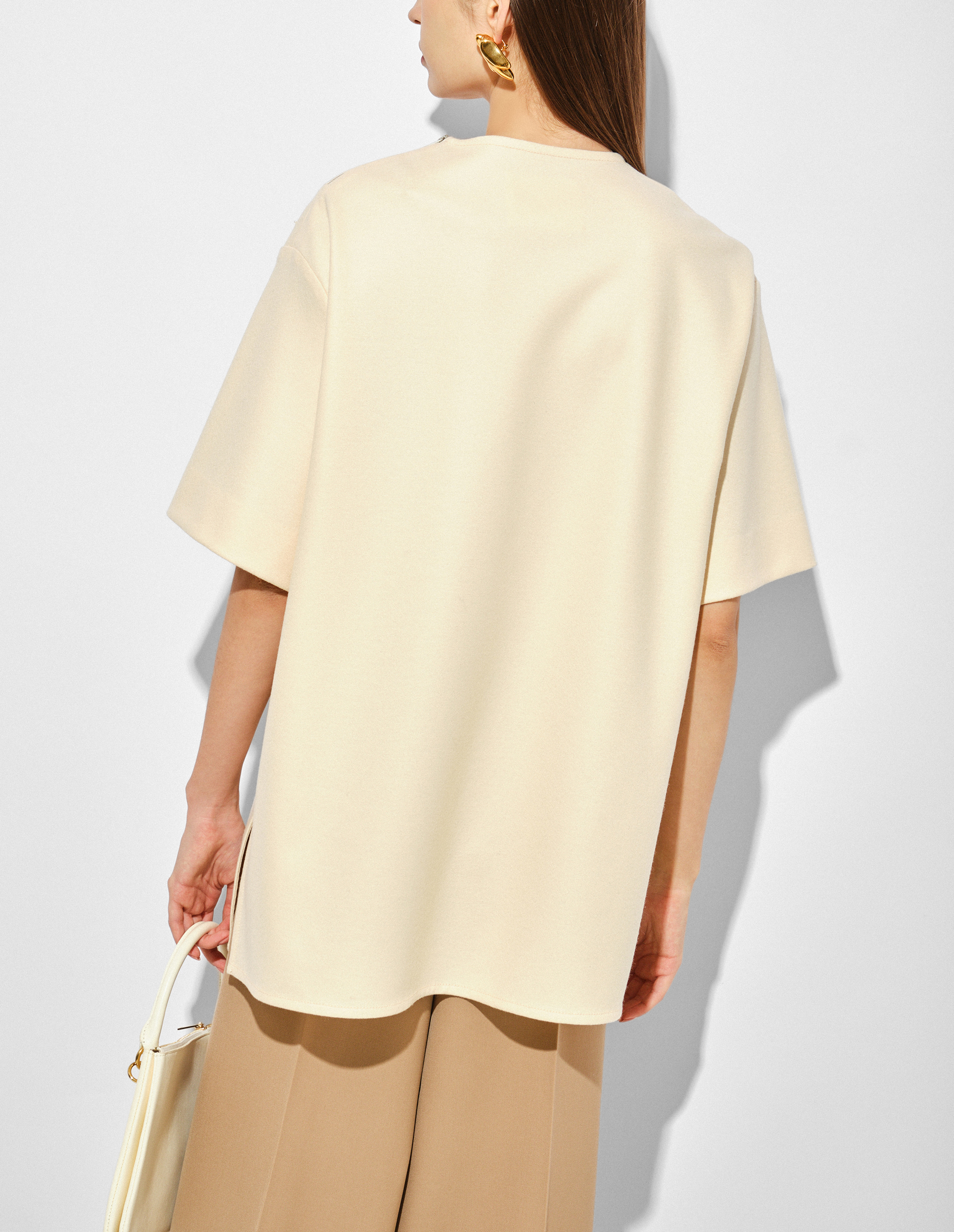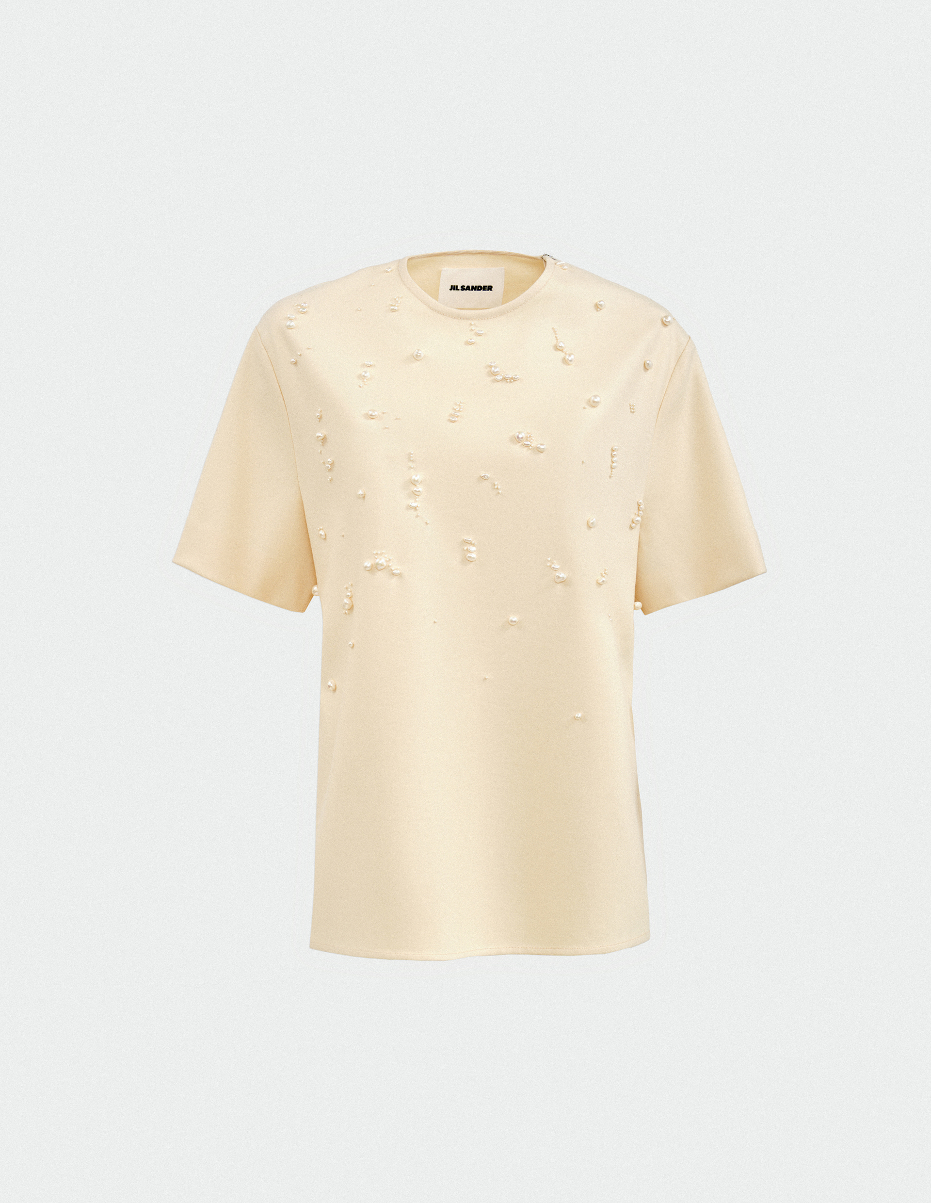 Элегантная простота требует исключительного мастерства. И это стало возможным, воплотившись в блузе JIL SANDER, чье производство объединило ремесленные навыки с прогрессом, чтобы создать современное, долговечное изделие из волокна высочайшего качества. Им является шерсть Melton — плотная ткань с мягкой поверхностью, гладкой на ощупь, а также очень прочной благодаря особому переплетению нитей. Оттенок Cornsilk обогащен декором в виде бусин из жемчуга разного размера, пришитого вручную и специально разработанного для этой футболки, представляя собой утонченный ювелирный штрих, свидетельство, отражающее внимание к деталям. Роль практичного элемента играет молния на плече, облегчающая надевание топа.
