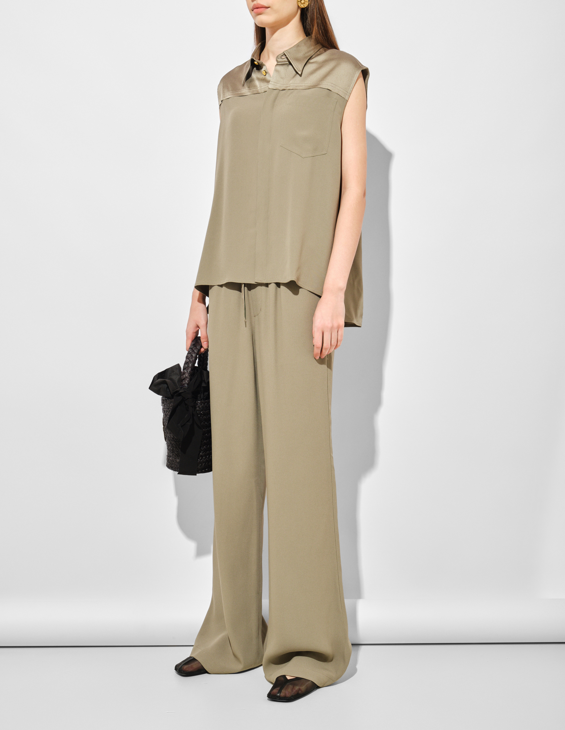 Эта блуза от Александра Маттьюззи будто пропитана любовью к Парижу, летним настроением и изысканным вкусом. Дизайнер стремился создать вещь для жизни, которую легко надеть и выйти из дома, чтобы встретиться с друзьями, посидеть на террасе или заняться другими повседневными делами в жарком городе. В качестве основы был выбран матовый ацетатный креп, который формирует интригующий союз с сатиновой вставкой на плечах. Для сохранения целостности природного оттенка Ash застежки скрыты планкой, а для повышения функциональности добавлен нагрудный карман. Комбинируйте блузу с коллекционными брюками в тон, чтобы составить прекрасный ансамбль.