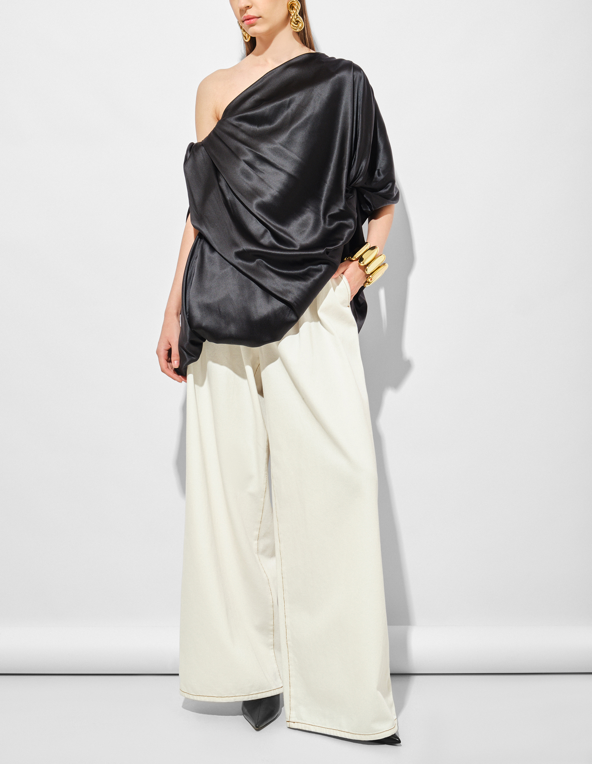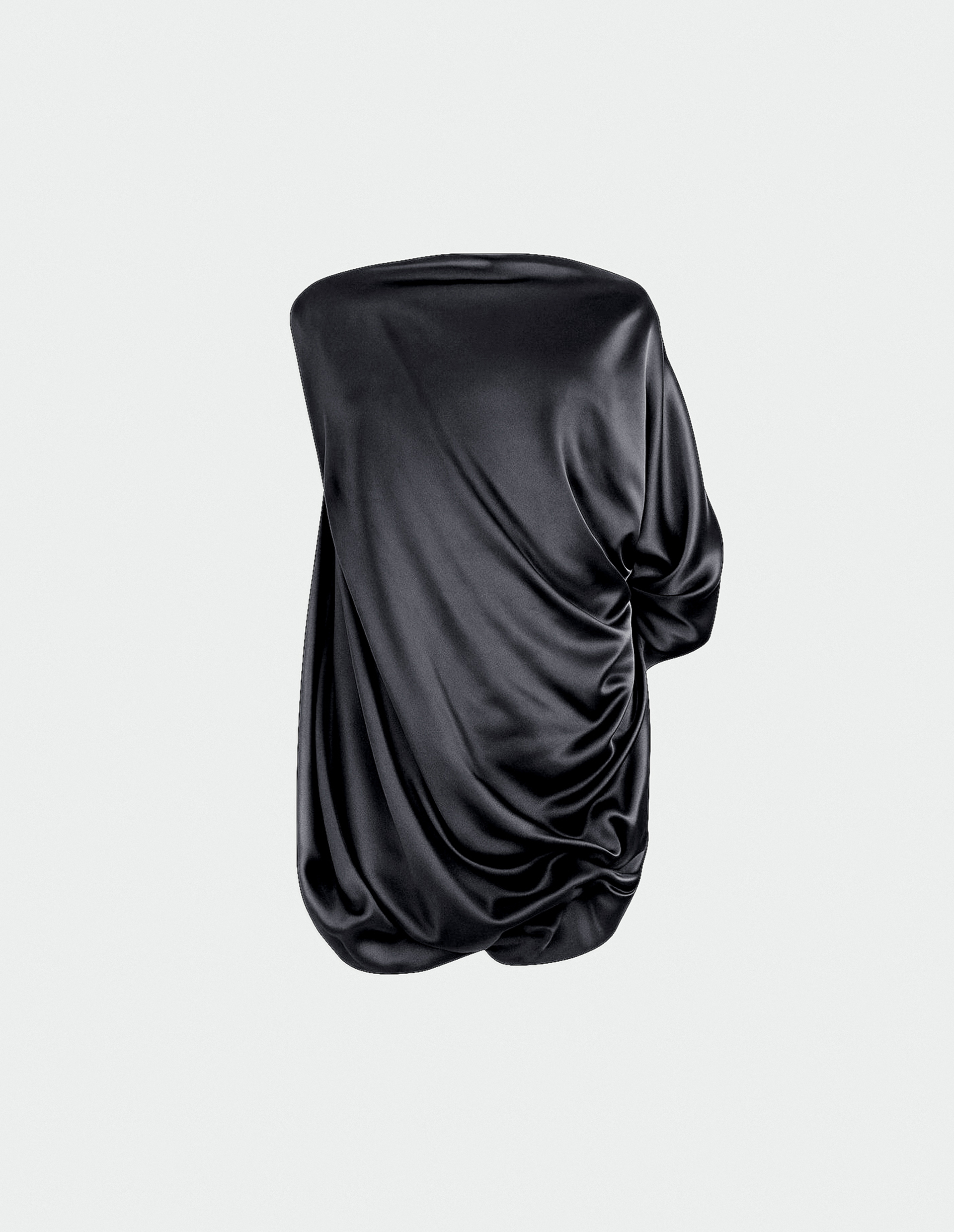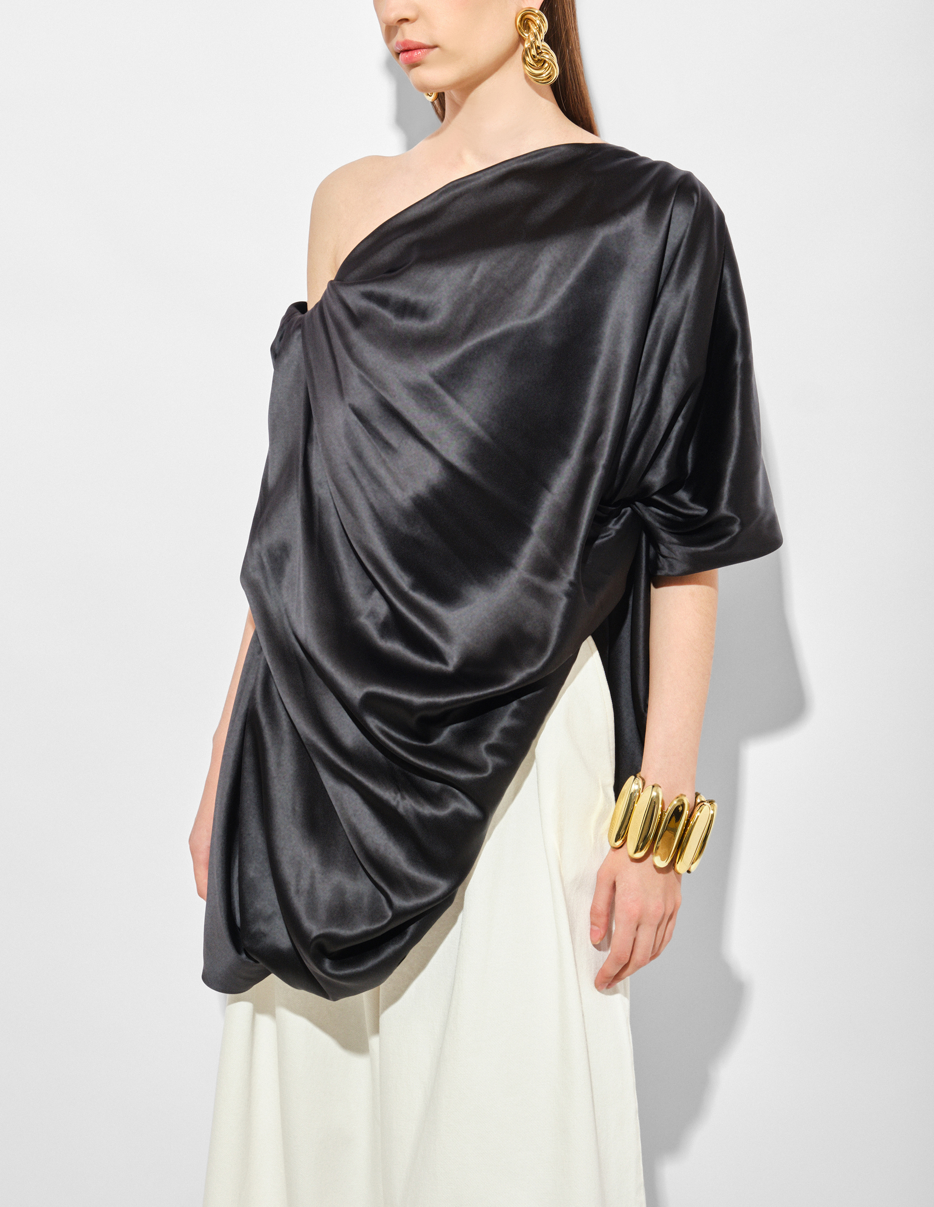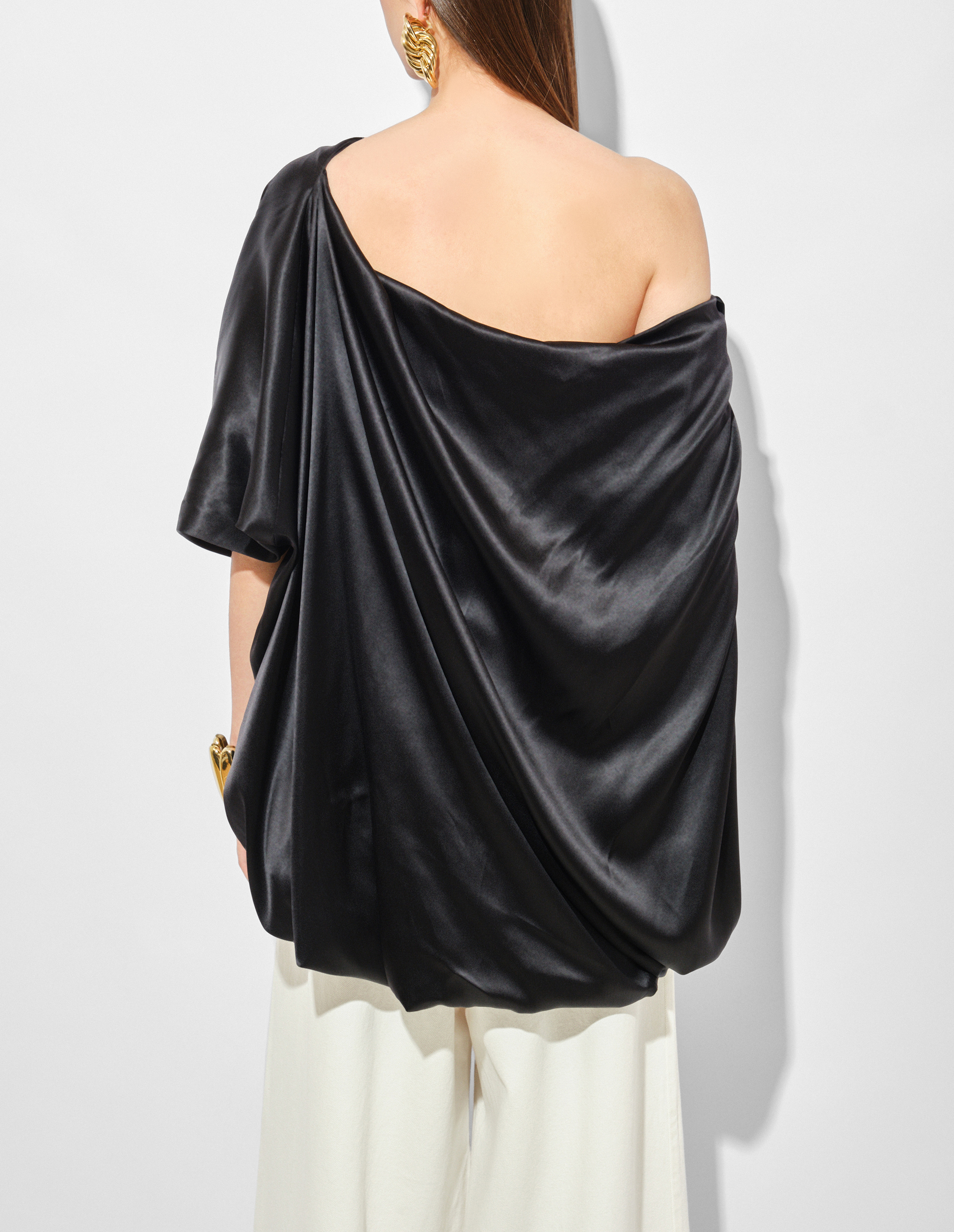 Скульптурная драпировка в стиле нью-романтизма. Этот асимметричный топ обволакивает фигуру, подчёркивая плечо и создавая смелую игру света на глянцевой поверхности ткани. Лаконичность кроя компенсируется выразительной формой.