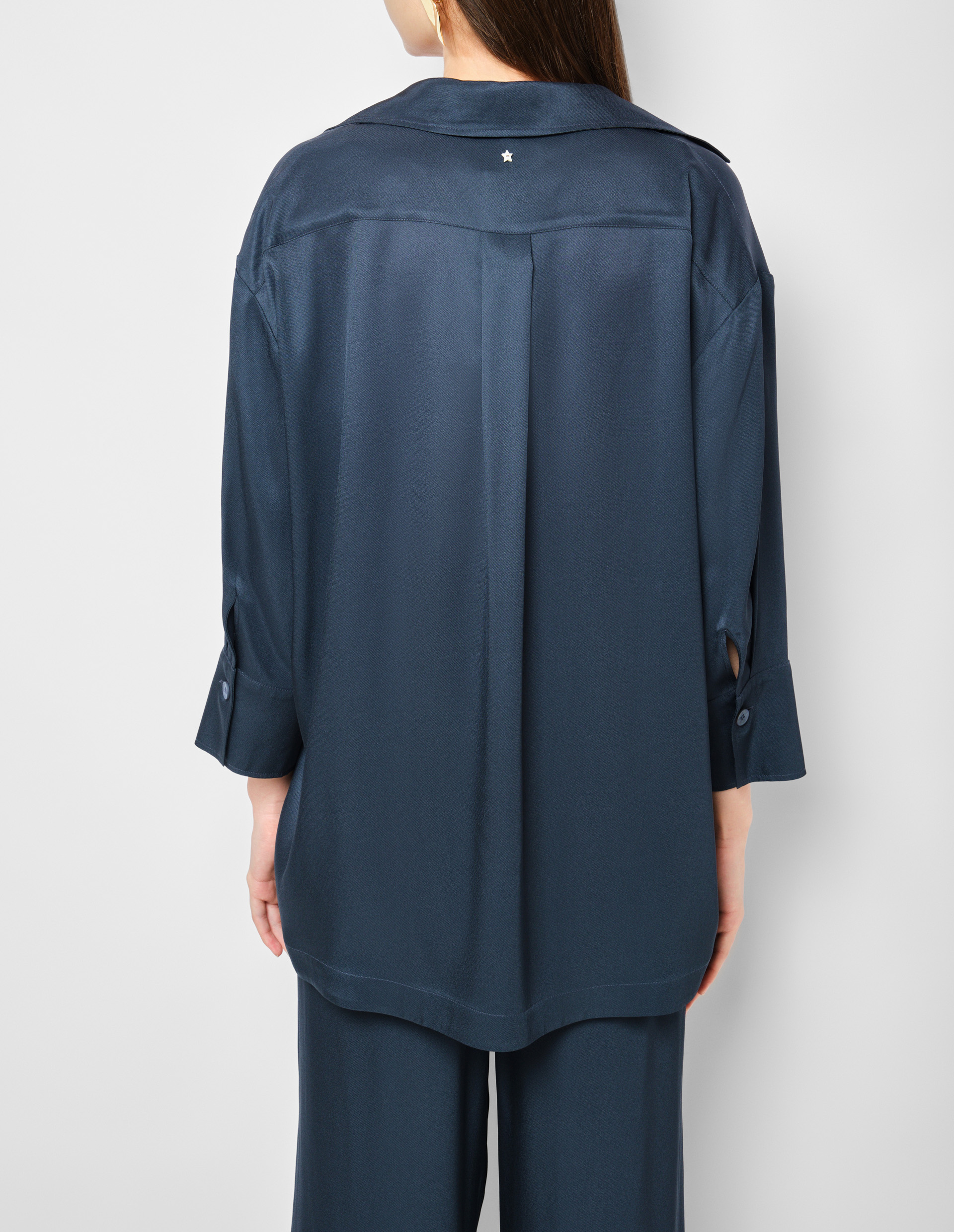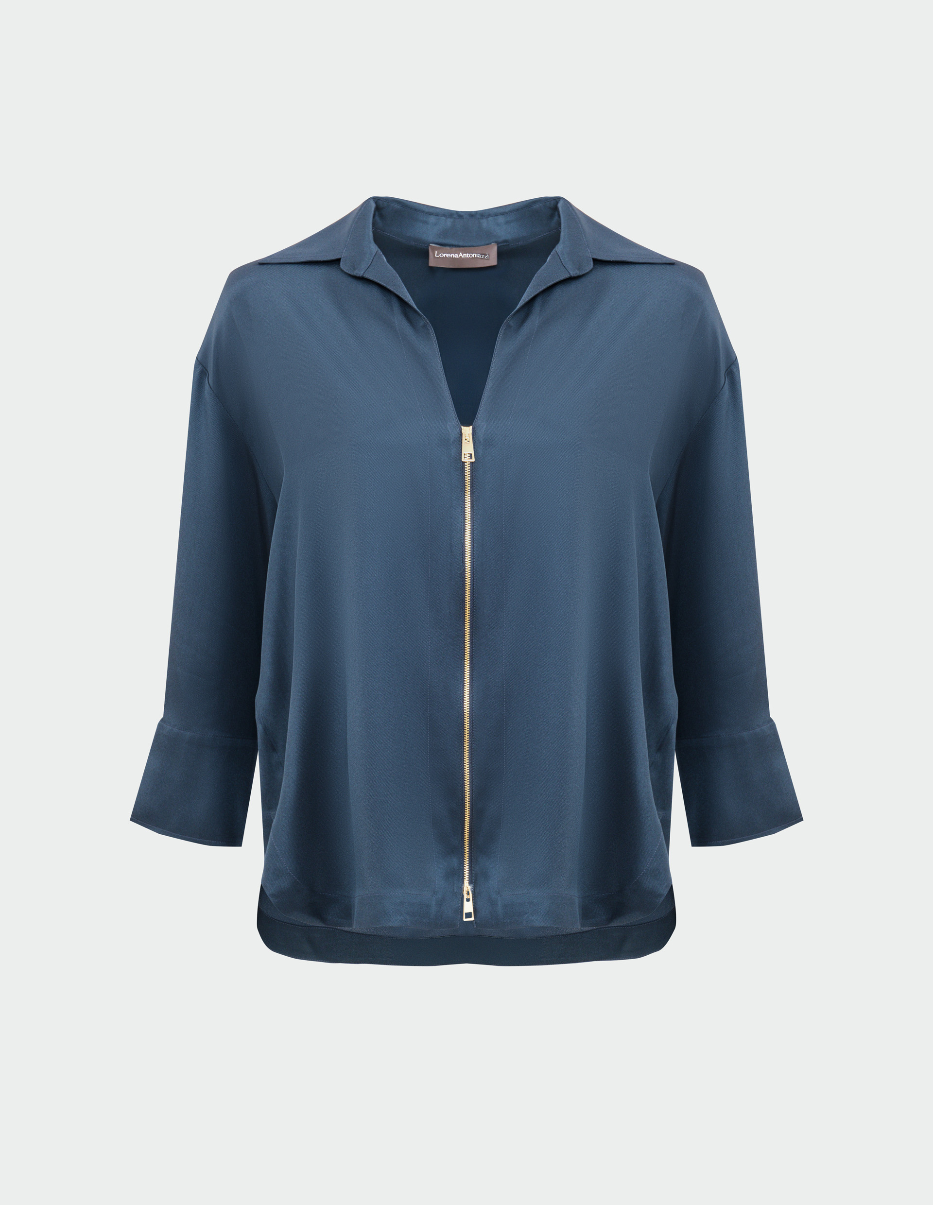 Блуза LORENA ANTONIAZZI полуночно-синего оттенка стала изысканным миксом спортивного шика и элементов верхней одежды. Выполненная из роскошного шелкового твила с добавлением ацетата, она демонстрирует фирменное внимание бренда к деталям: рукава 3/4, отложной воротник, двойная застежка-молния и манжеты с разрезом на пуговице создают современный образ, сочетающий практичность и утонченность. Свободный крой подчеркивает непринужденную элегантность, характерную для Дома, а саржевое переплетение шелковой ткани придает благородный блеск и мягкость, за которые так ценится этот материал. Как и все изделия LORENA ANTONIAZZI, эта блуза создана с соблюдением традиций итальянского мастерства – 80% операций выполняются вручную, а уникальный QR-код подтверждает подлинность производства. Звездочка-логотип, символ семейных ценностей и стремления к совершенству, завершает образ, напоминая о связи бренда с Умбрией – зеленым сердцем Италии, где бережно хранят традиции и внедряют инновации в мире роскошного трикотажа.