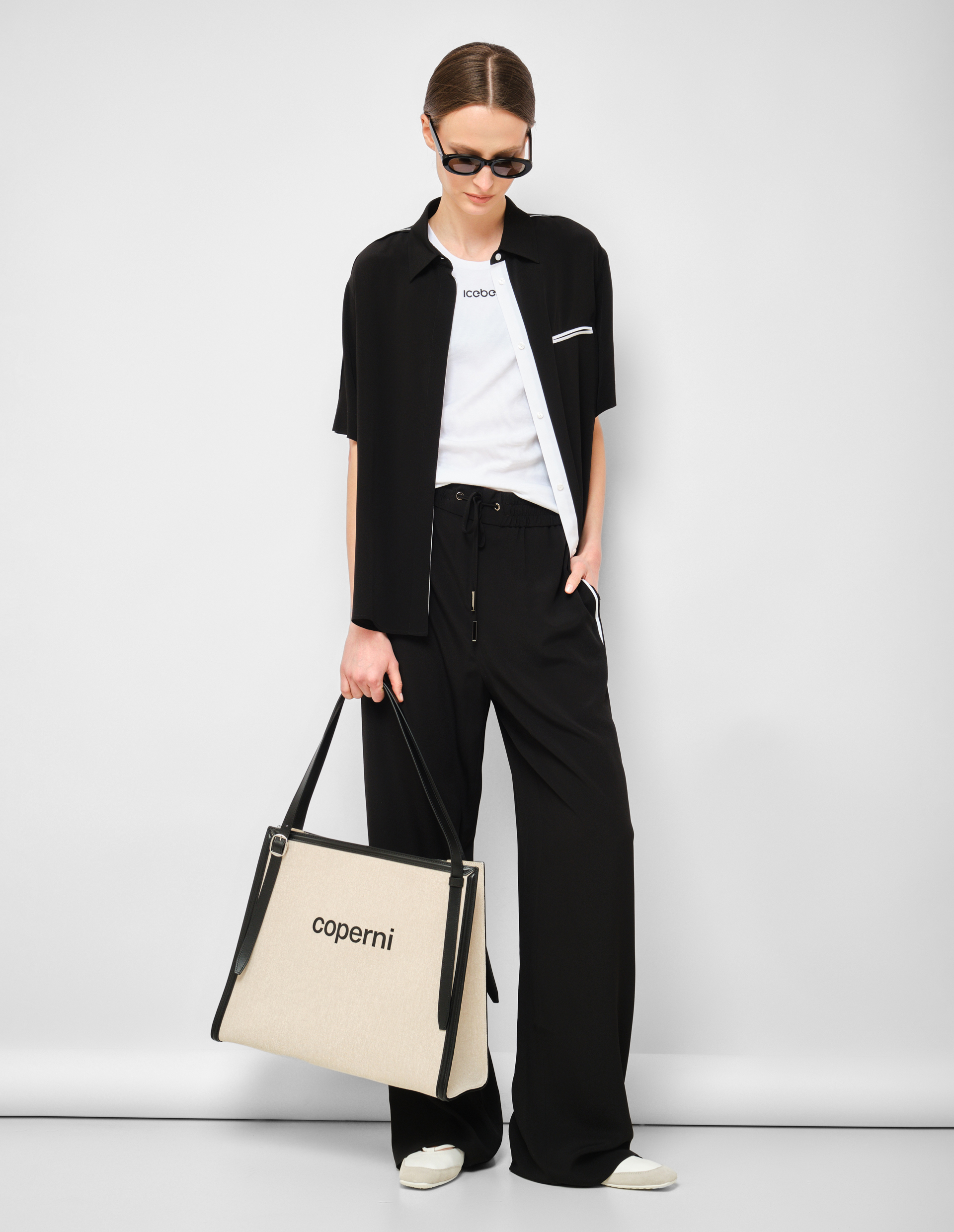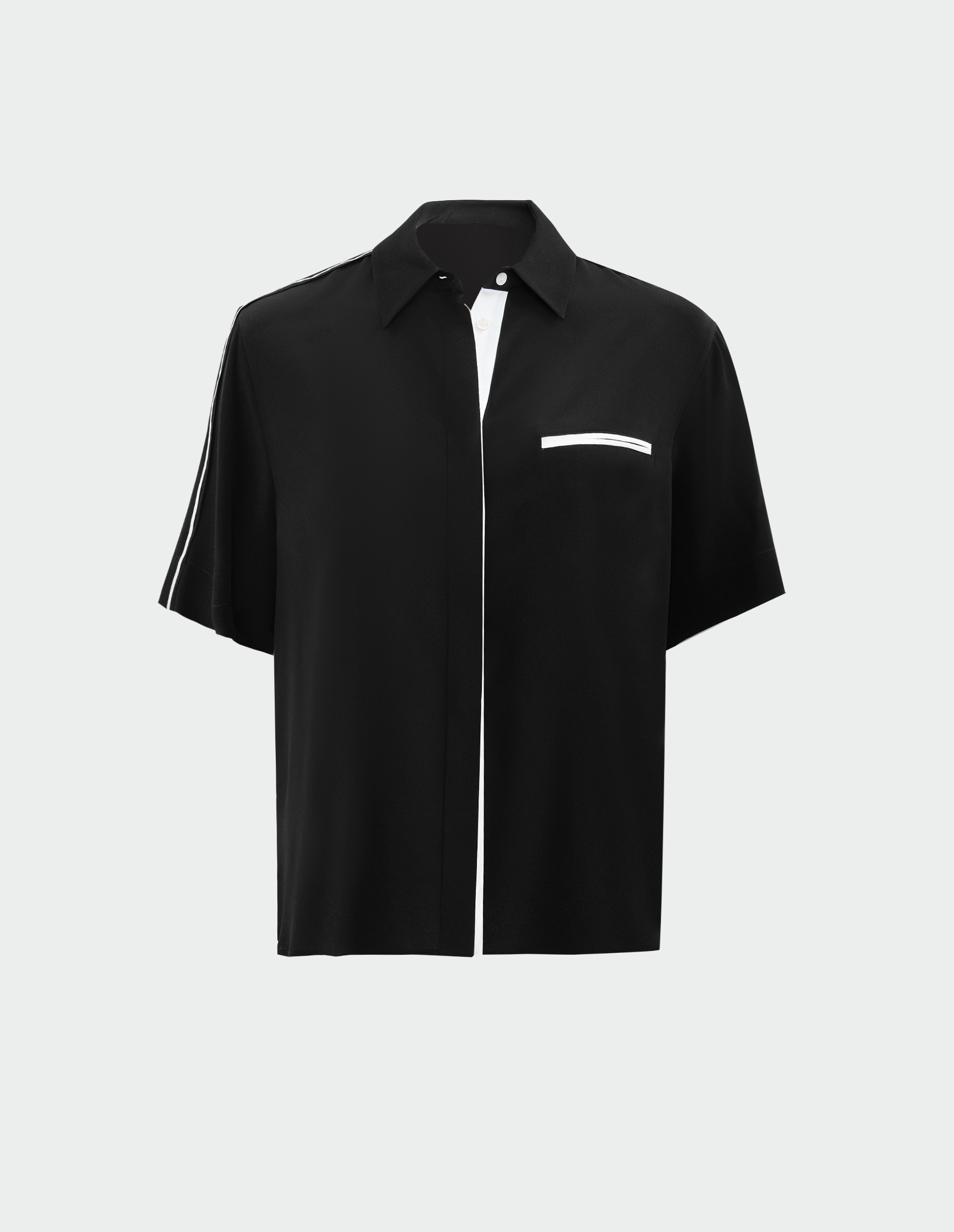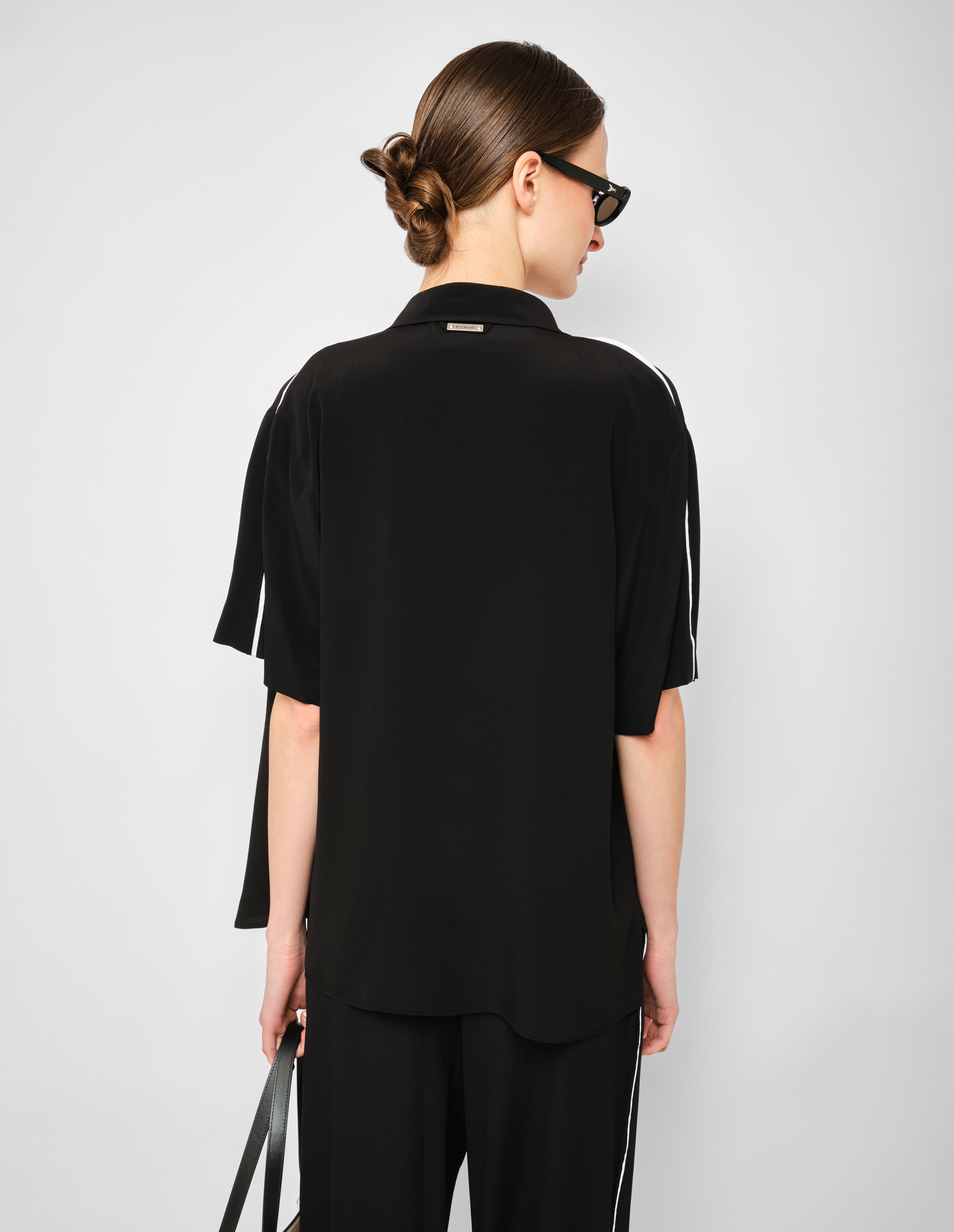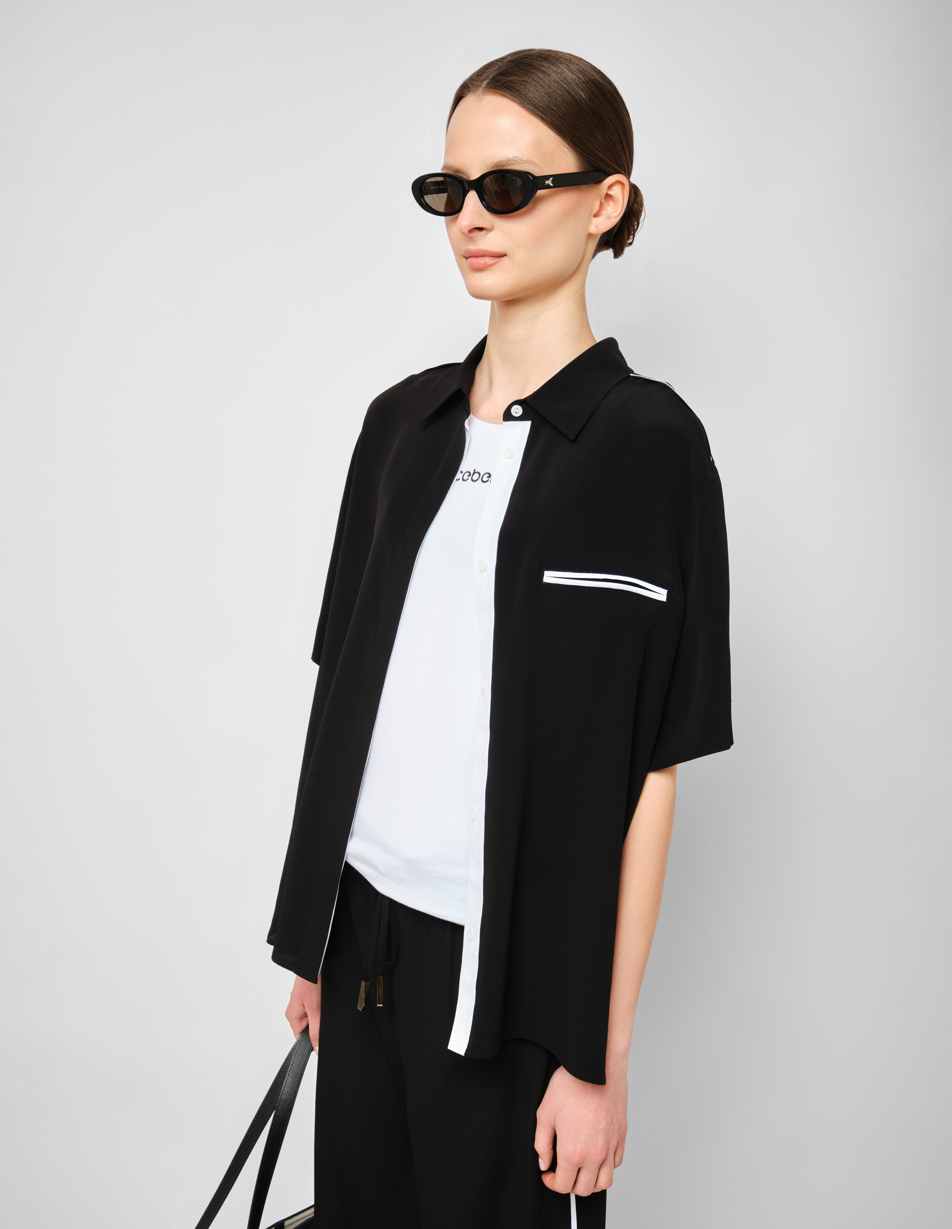 Архитектура спортивной элегантности. Эта рубашка от ICEBERG — идеальный пример того, как минималистичные детали превращают базовую вещь в предмет современного гардероба с характером. Глубокий черный цвет выступает безупречным фоном для графичных белых акцентов. Две горизонтальные полосы на плечах задают четкий ритм и визуально расширяют линию плеч, создавая ту самую спортивную эстетику, которая сейчас в центре внимания. Имитация кармана на груди добавляет образу утилитарной нотки и архитектурной сложности — это деталь, которая приковывает взгляд и заставляет рассматривать вещь внимательнее. Модель выполнена из легкой, почти невесомой ткани высшего качества, которая идеально драпируется и дарит ощущение комфорта даже в самый жаркий день. Короткий рукав открывает руки, добавляя образу свежести и современной легкости. Рубашка задумана как часть комплекта с брюками из аналогичной ткани, и в паре они создают тотальный графичный образ, который выглядит цельно и продуманно. Но и соло она работает безупречно, становясь идеальным верхом для джинсов, юбок или шорт. Сегодня мода на спортивную эстетику в люксовом прочтении переживает новый расцвет — эта рубашка доказывает, что форма может быть выразительной без лишних усилий. Носите её с классическими брюками из комплекта для создания эффекта total look или с белыми джинсами, чтобы поддержать графику полос. Можно надеть поверх простого черного платья как легкую накидку — универсальность этой модели не знает границ. Польза этой вещи — в ее способности быть одновременно базой и акцентом, структурируя образ и задавая ему ритм. Важный нюанс: легкая ткань требует бережной стирки в холодной воде, но награждает владельца непревзойденным комфортом в теплое время года. Белые полосы выполнены стойкими красителями, которые не линяют и не тускнеют со временем. Имитация кармана прочно закреплена и не деформируется после стирки.