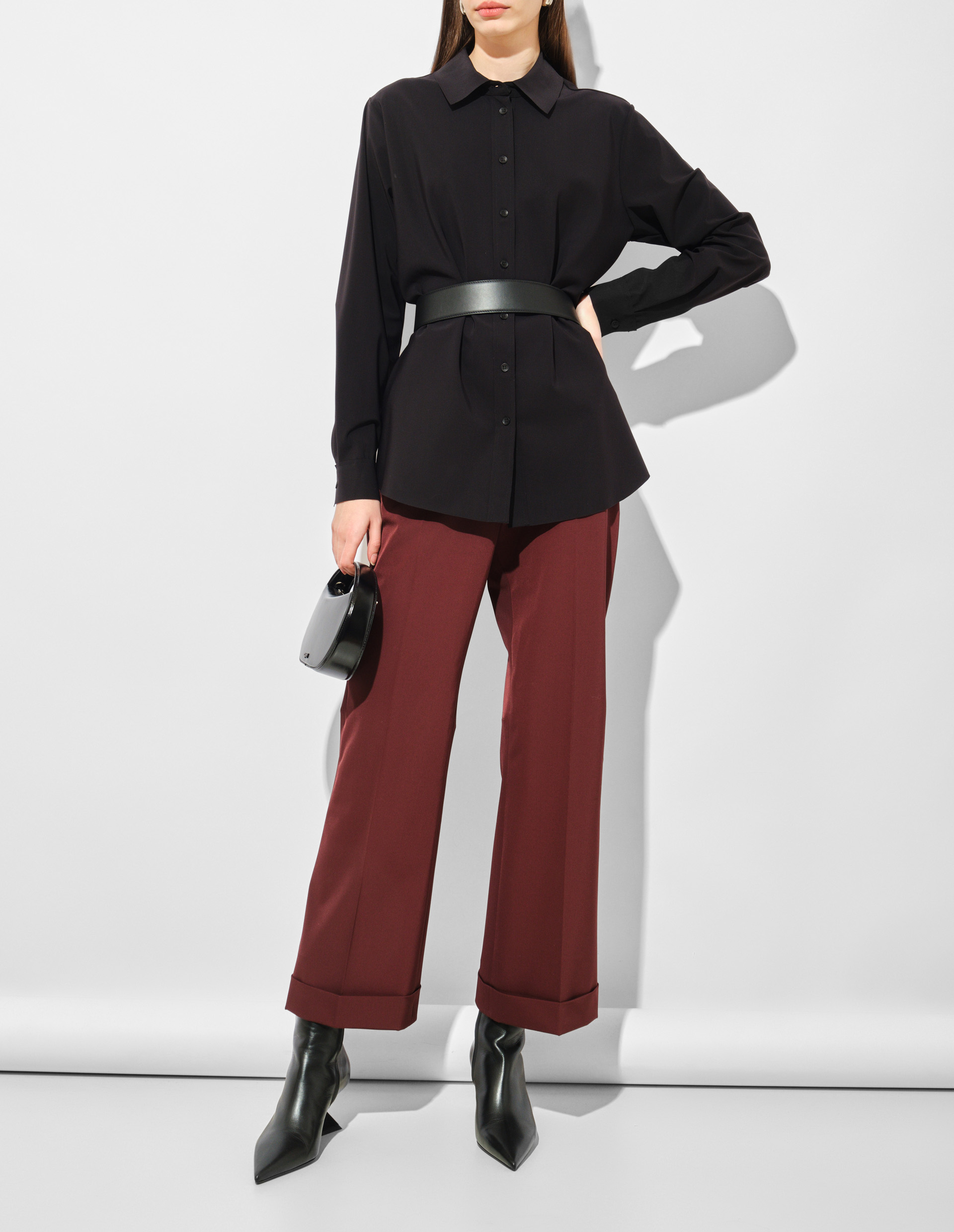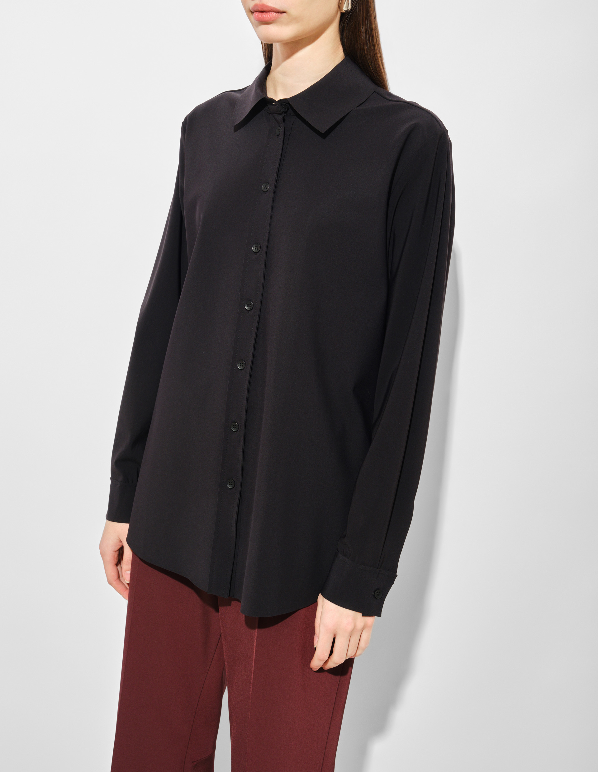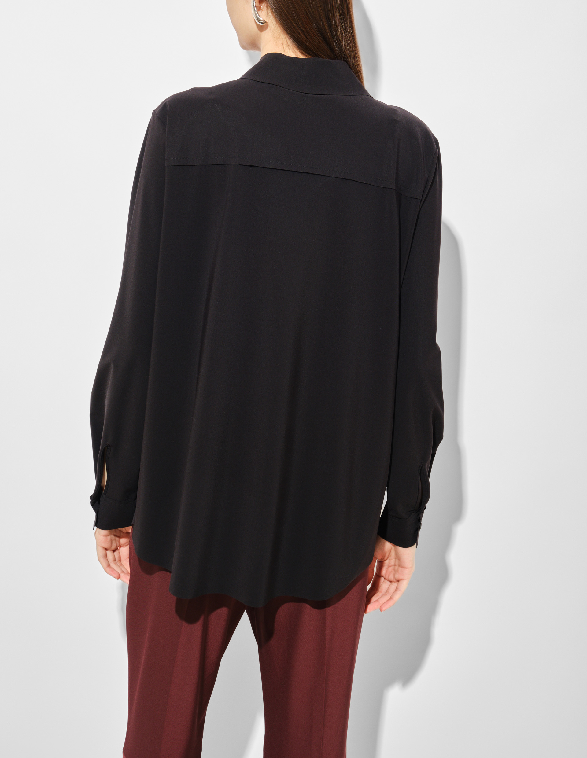Непревзойденный черный. Безупречно гладкая и чарующе стильная, рубашка от Riani завораживает красотой. Плотная, в меру пластичная ткань хорошо держит форму, создавая женственный силуэт. Широкий воротничок идеально сочетается с манжетами. Планка с пуговицами в тон становится центром гармонии. Свободная, чуть удлиненная спинка дополнена закругленным краем. Модель одинакова хороша и для ношения навыпуск, и для комбинации с ремнем, и для модных образов с заправленным подолом.