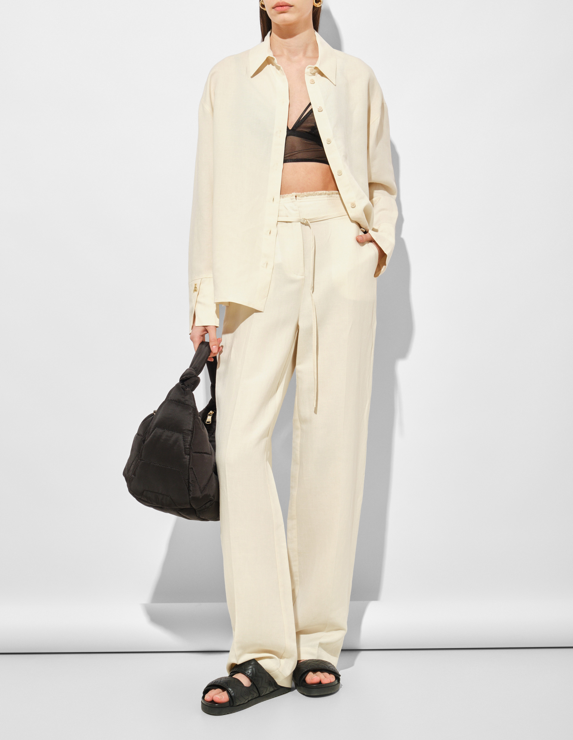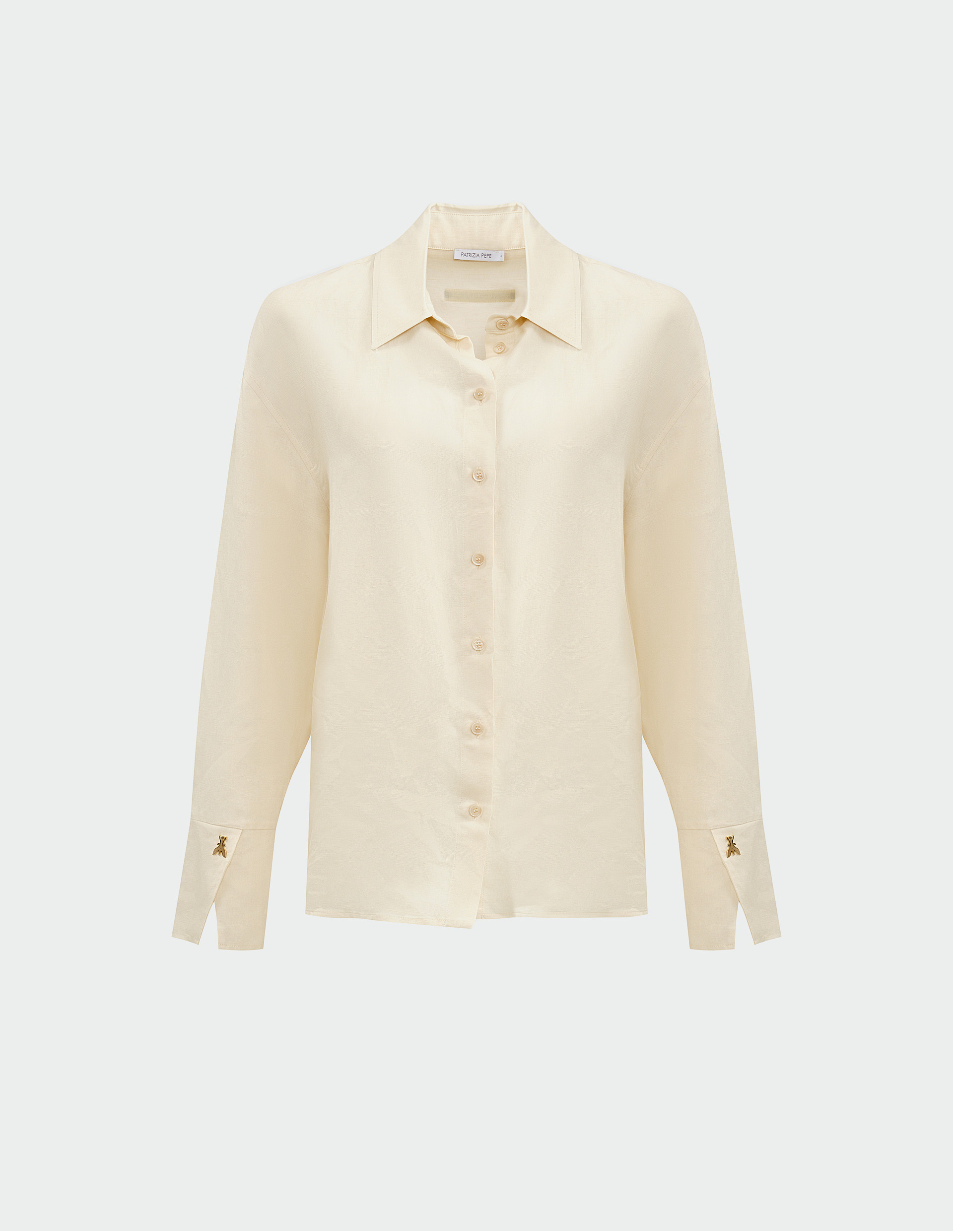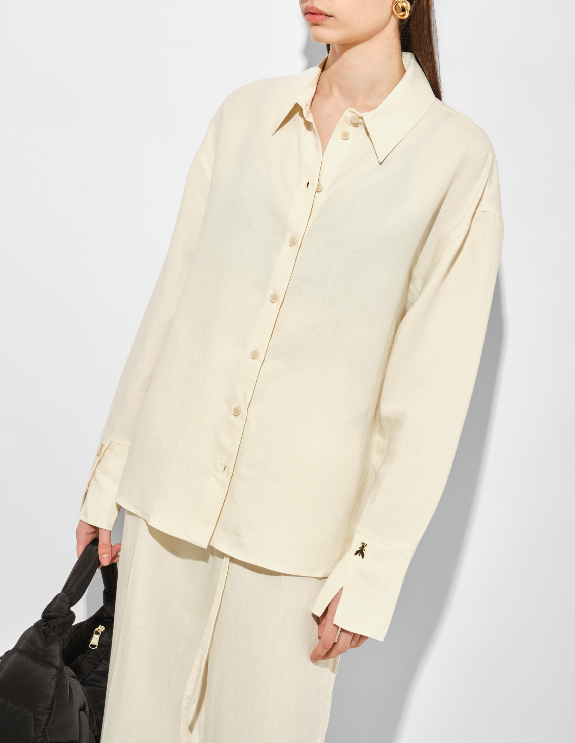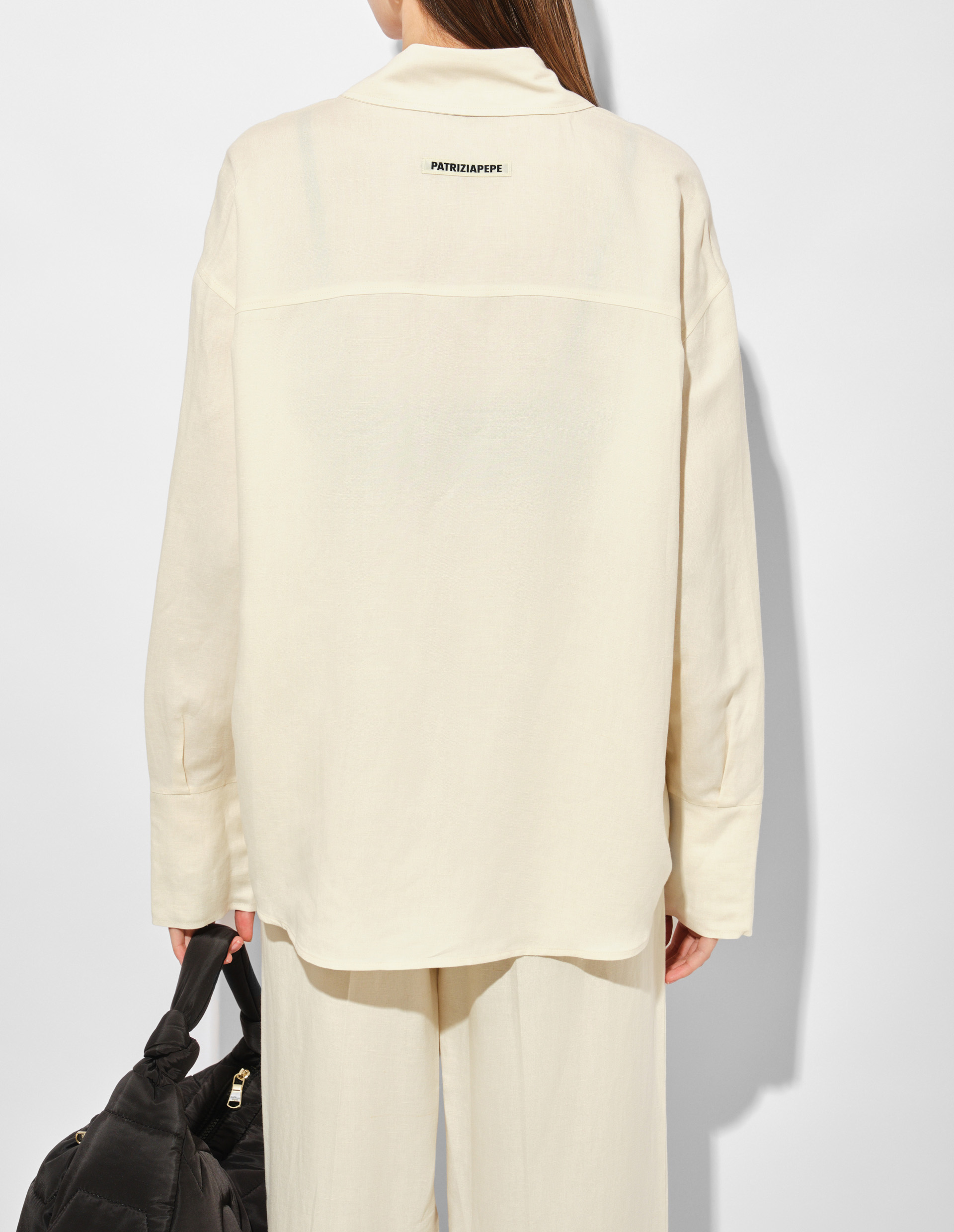 Девушка Patrizia Pepe точно понимает современную элегантность и имеет свой собственный эксклюзивный код женского очарования. Им является эта роскошная рубашка из флюидного вискозно-льняного материала в природном бежевом оттенке — прекрасный представитель весенне-летней серии 2025. Универсальная и всегда актуальная, она позволит вам создавать образы с изысканным очарованием, а ее высокие манжеты с разрезами, украшенные мушками Fly, будут символизировать ДНК флорентийского бренда. Качество изготовления подтверждает статус Made in Italy, обеспечивая безупречную посадку и идеальный внешний вид.