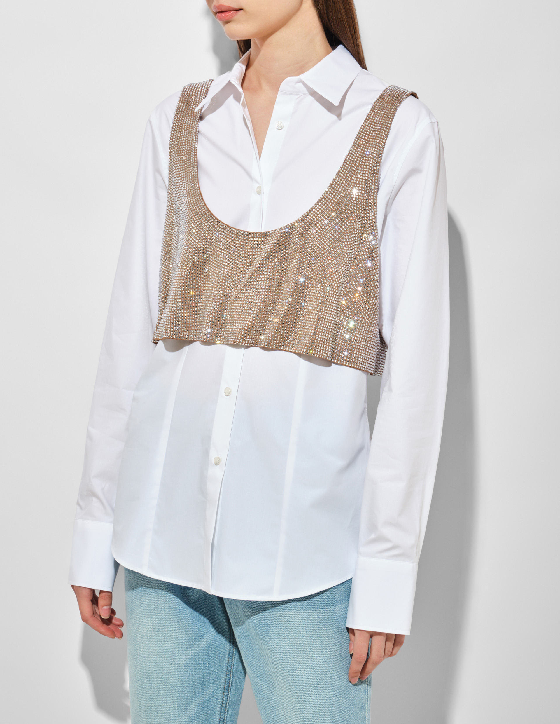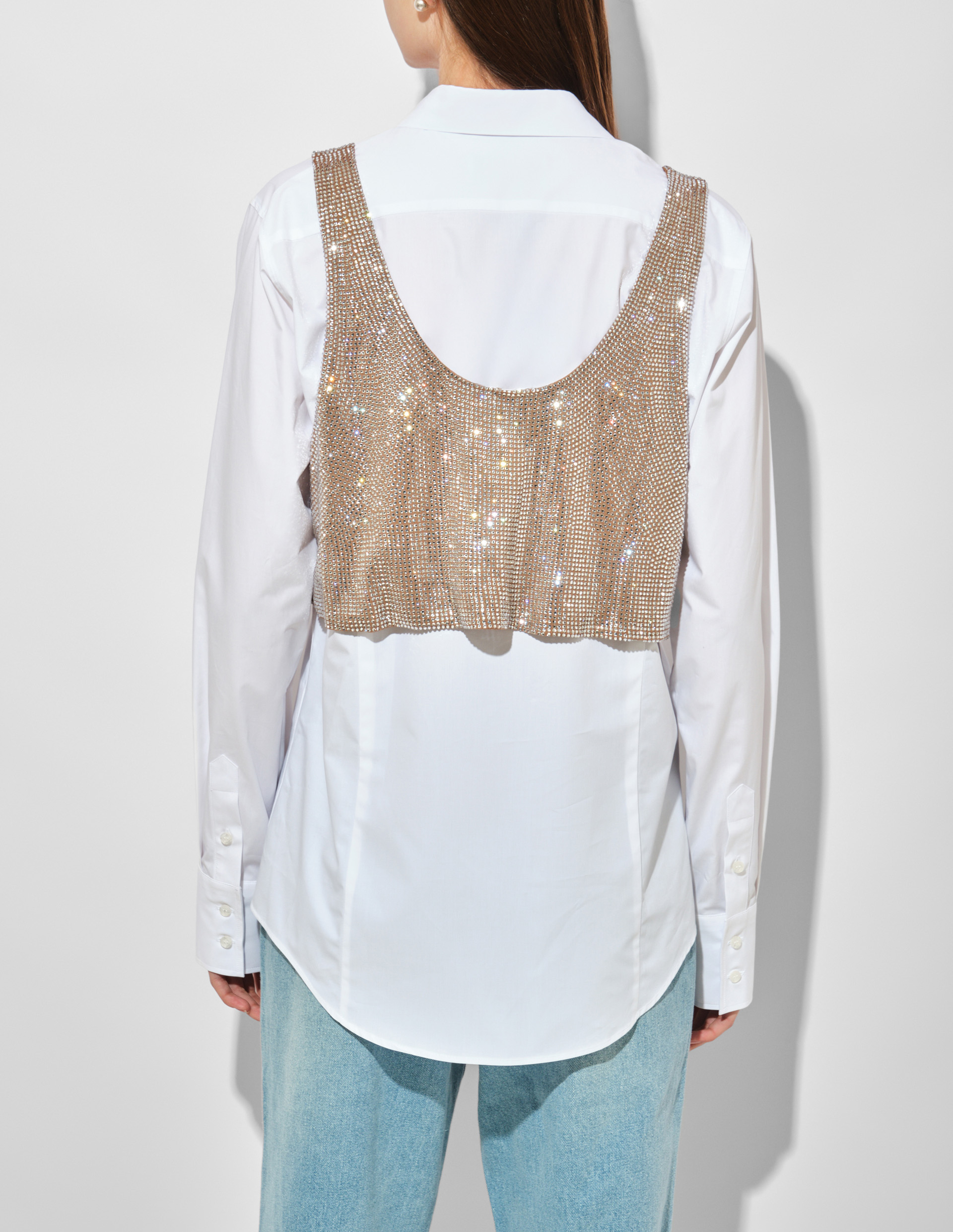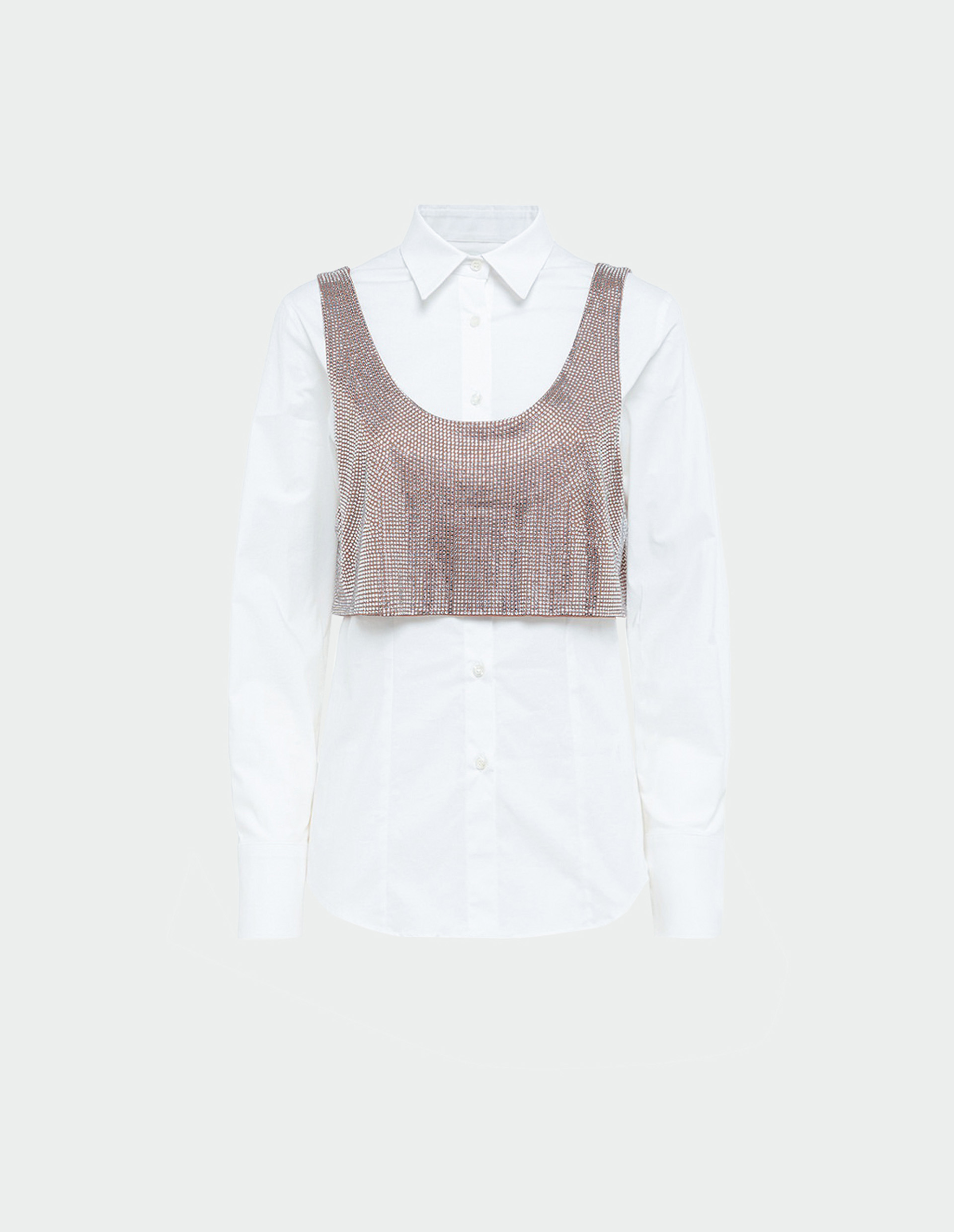 Элегантная белая рубашка классического кроя изготовлена из легкого хлопкового поплина. Модель дополнена съемным топом, полностью расшитым стразами, который создает эффектный контраст с лаконичностью базового силуэта, а также позволяет трансформировать образ от официального к вечернему варианту. Функциональными деталями являются: отложной воротник, длинные рукава с манжетами и застежка на пуговицы по всей длине. Идеальное сочетание качества Made in Italy, универсального кроя и дерзких акцентов.